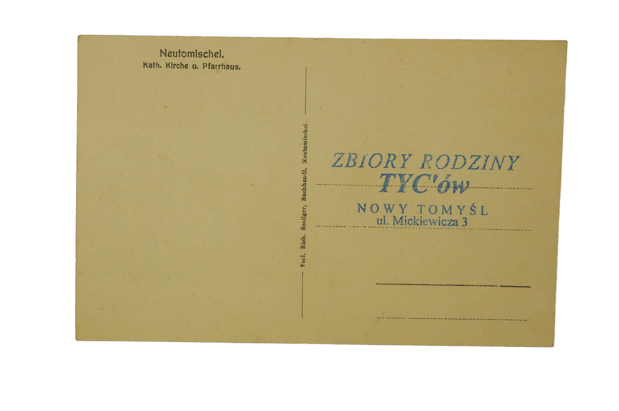 Nowy Tomyśl [Neutomischel] - Kościół Katolicki i plebania [Kath. Kirche u. Pfarhaus], Verlag: Rich. Seeliger, Buchhandlung, Neutomischel, bez obiegu, f. 14x8,8cm