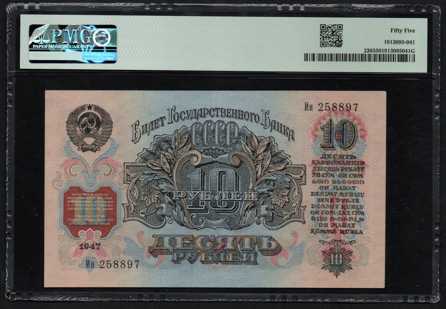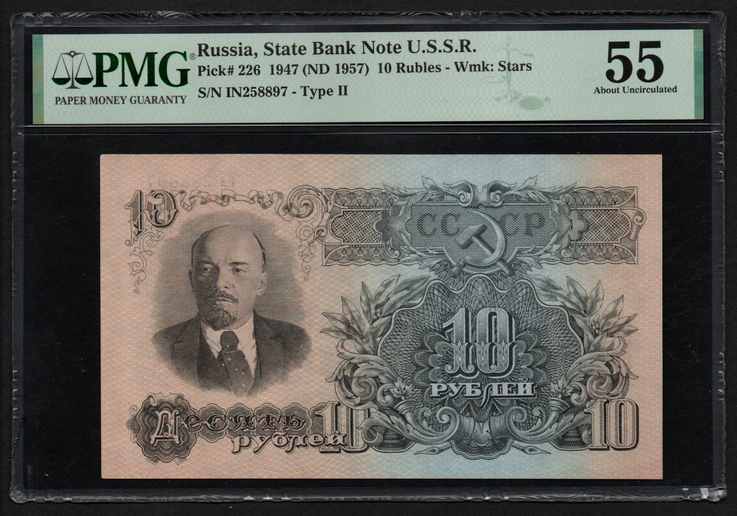 Russia (USSR) 10 Rubles 1947 - PMG 55 About Uncirculated