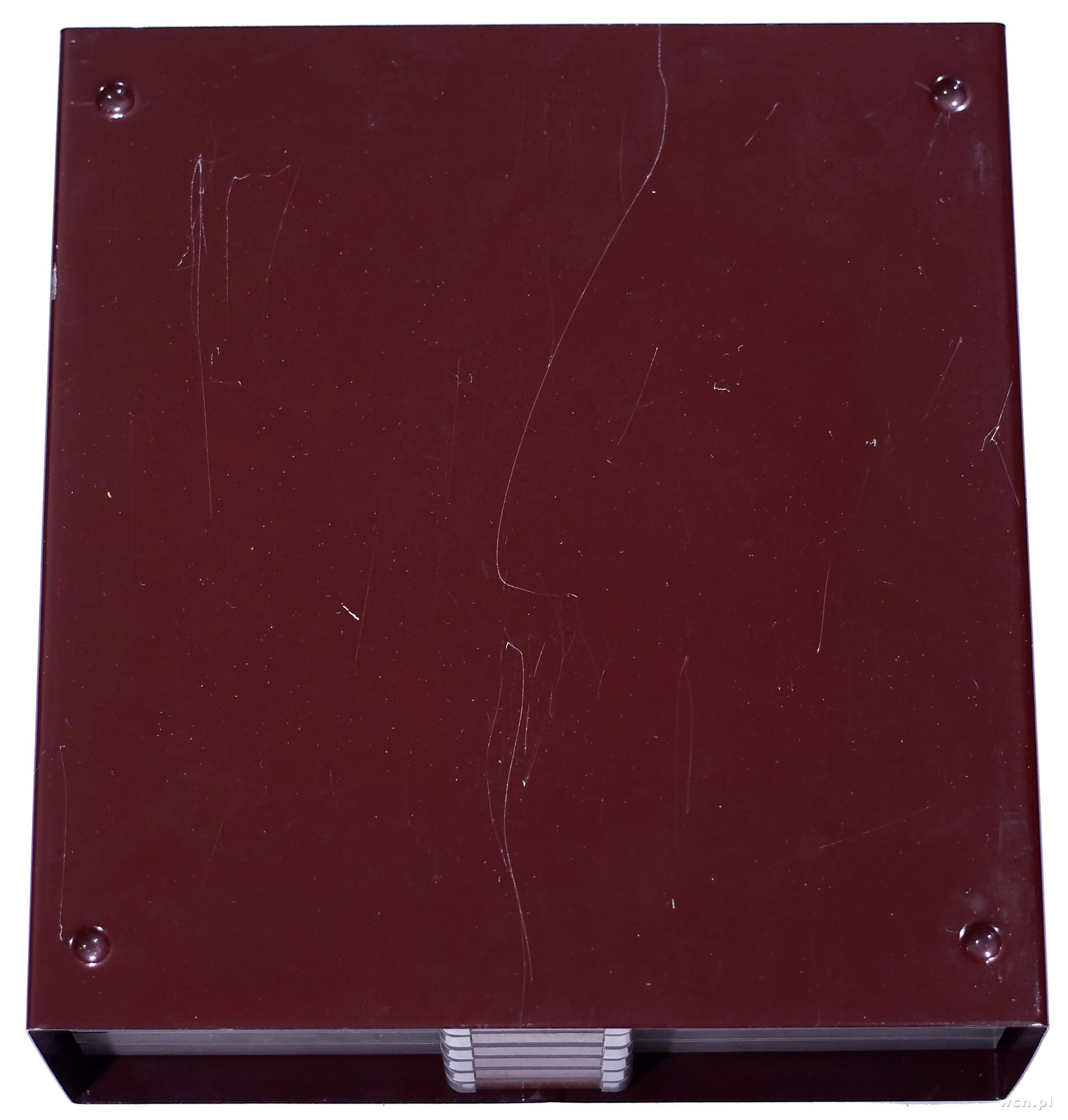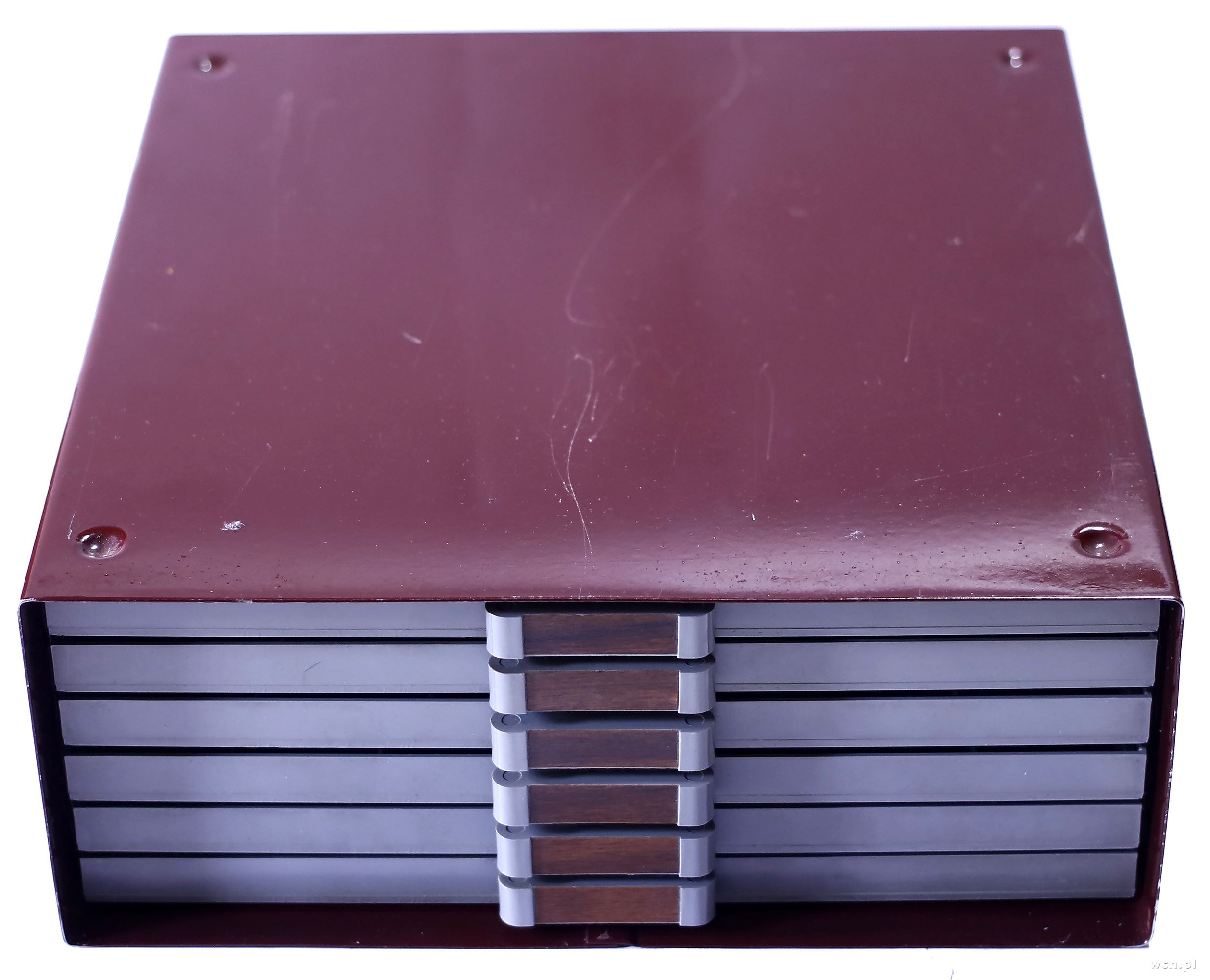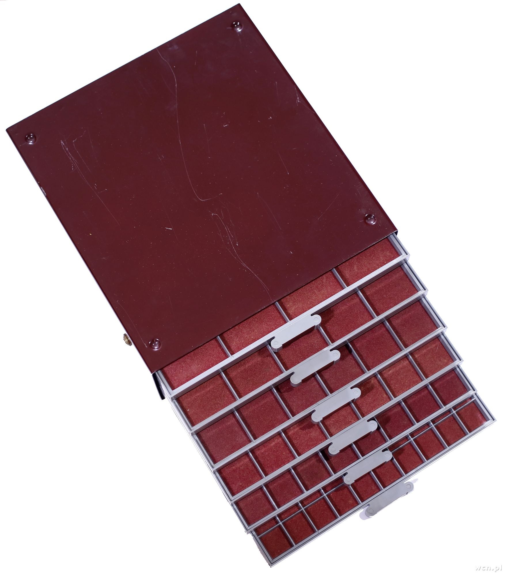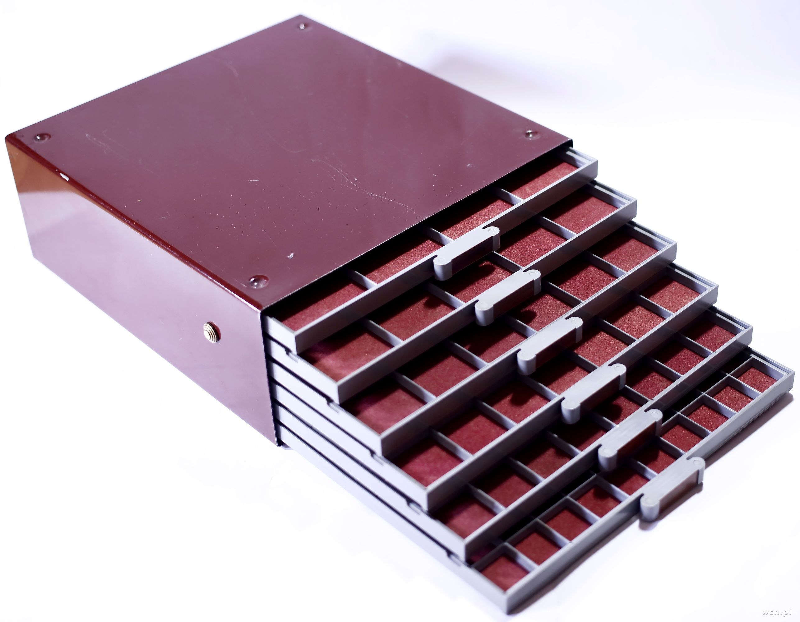 wytrzymała i funkcjonalna skrzynka na monety wraz z sześcioma tacami, każda taca z przegródkami i sukienną wyściółką, tace blokowane na zatrzask, specjalne wgłębienia i wypustki pozwalające na stabilne spiętrzenie skrzynek, wewnątrz tace: 10x10, 8x8, 7x7, 6x6, 5x5, 4x4