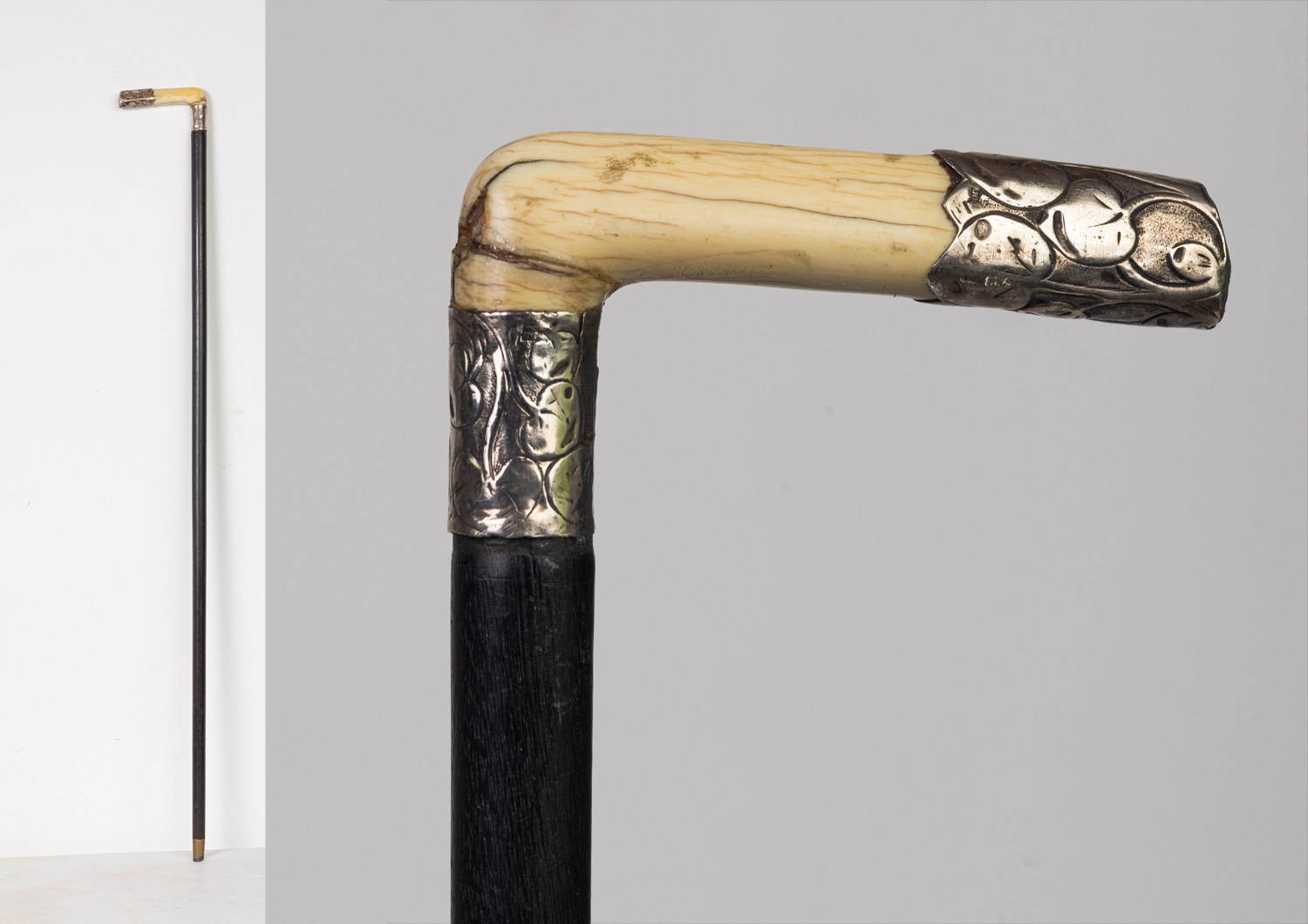 Laska z drewna hebanowego z uchwytem "Gerarder haken" wykonanym z kości słoniowej z nasadami ze srebra pr. 3 z motywami roślinnymi. Ostroga z brązu. Stan zachowania dobry (starzeniowe pęknięcia kości w uchwycie). Rzadkość!
