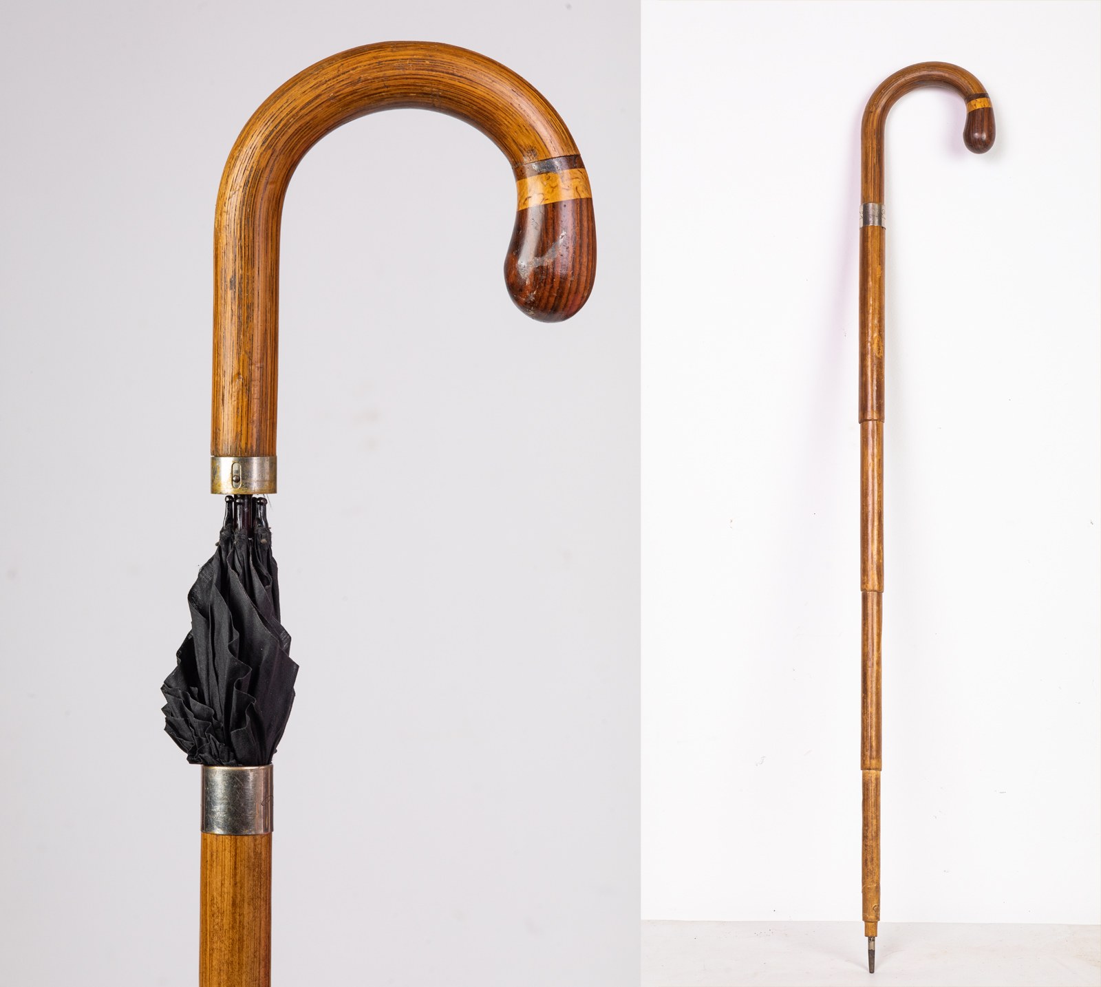 Uchwyt i korpus kija wykonany z malakki. Końcówka uchwytu zakończona drewnem jesionowym i pierścieniem z czeczoty brzozowej. Kij rurowy składający się z czterech stożkowych elementów. Ostroga stalowa. Stan zachowania dobry (brakuje osłonki ostrogi) Tkanina, z której wykonano czaszę parasola d stanie bardzo dobrym. RZADKOŚĆ!