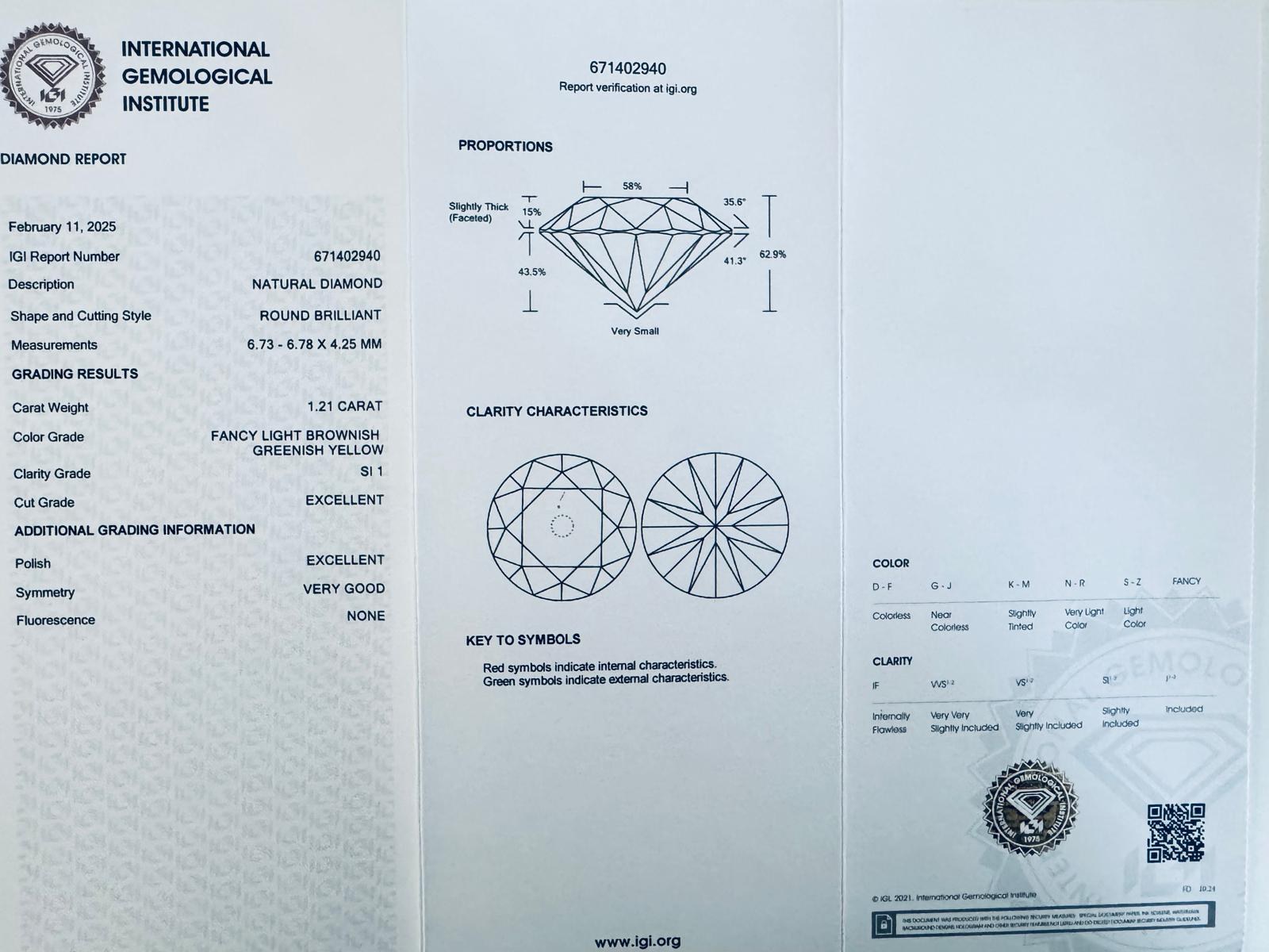 1.21 NATURAL POLISHED DIAMOND FANCY BROWN GREENISH YELLOW -SI1 - IGI - C41004-15