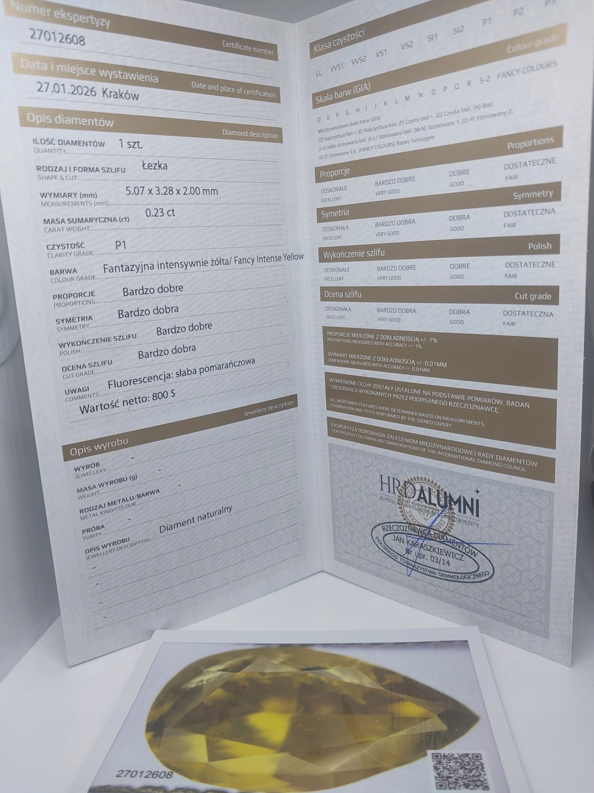 Do diamentu dołączony jest Certyfikat Rzeczoznawcy i Sekretarza Polskiego Towarzystwa Gemmologicznego, firma Diamond Sky, Jan Karaszkiewicz + Zdjęcie katalogowe wraz z kodem QR.