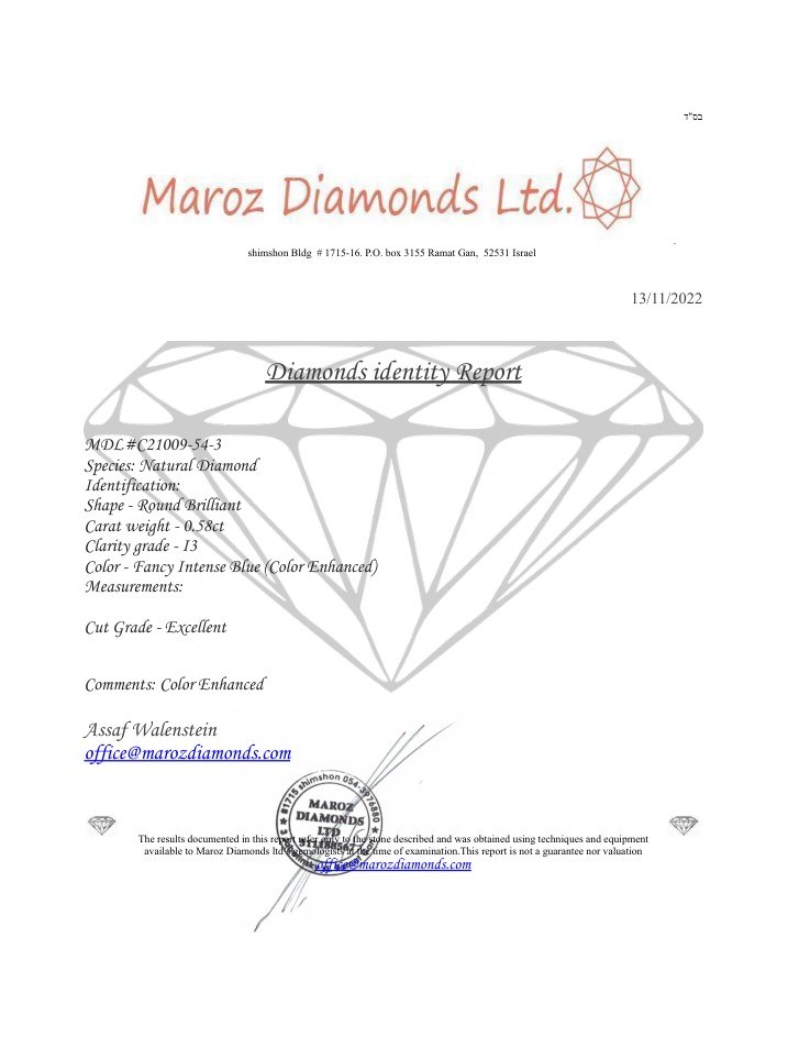 NATURAL POLISHED DIAMOND 0.58 FANCY INTENSE BLUE -I3 - WITH GEMMOLOGICAL CERTIFICATE - C21009-54-3
