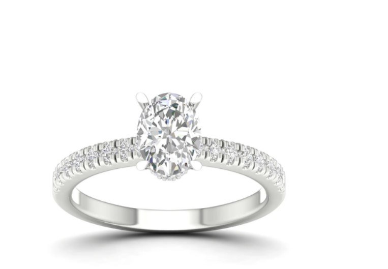 DESCRIPTION: THIS REFINED RING FEATURES A CLASSIC DESIGN WITH A CENTRAL OVAL-CUT LAB-GROWN DIAMOND, COMPLEMENTED BY A PAVE SETTING OF LAB-GROWN DIAMONDS ALONG THE BAND, TOTALING 1.30 CARATS. CRAFTED IN 14KT WHITE GOLD, IT IS A SUSTAINABLE AND ELEGANT OPTION, PERFECT FOR SPECIAL OCCASIONS OR AS A SYMBOL OF LASTING LOVE.