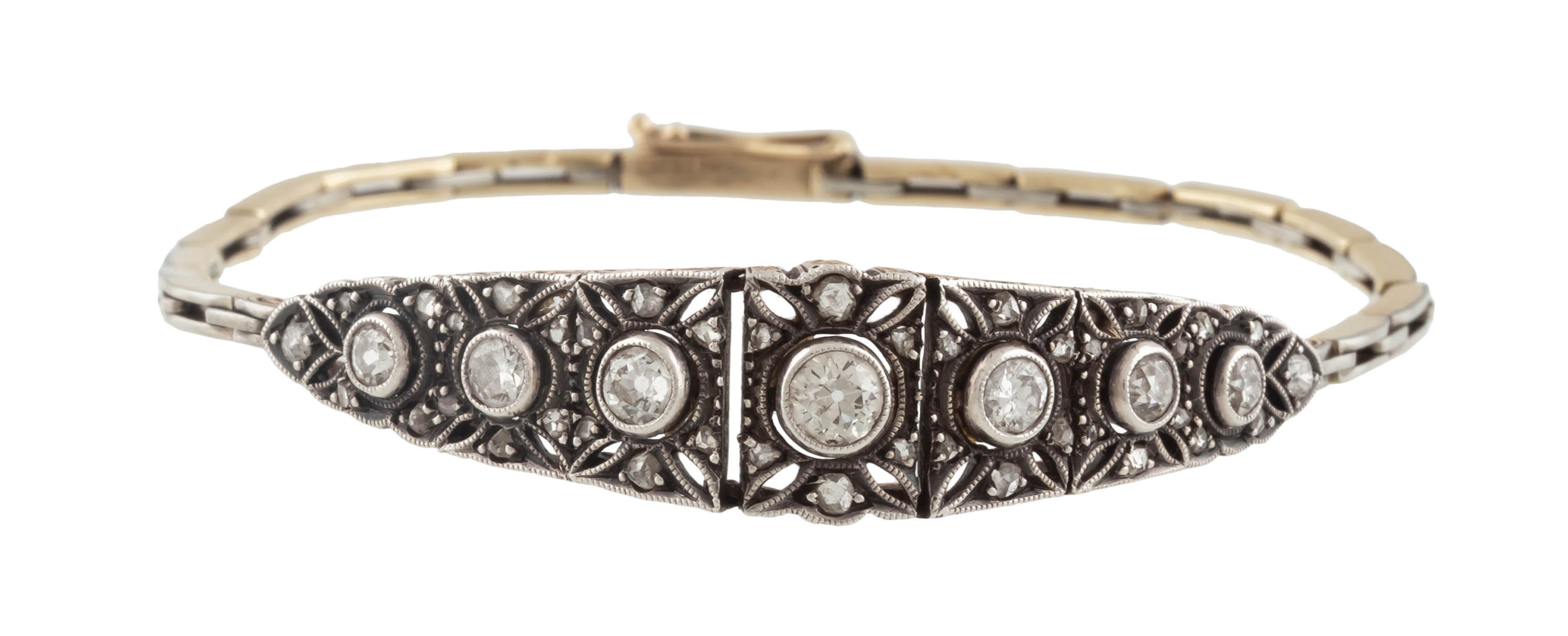 złoto, pr. ok. 0,585, srebro, 9 szt. diamentów łącznie ok. 0,80 ct, H-I/SI-P, 38 szt. rozet i rautów diamentowych