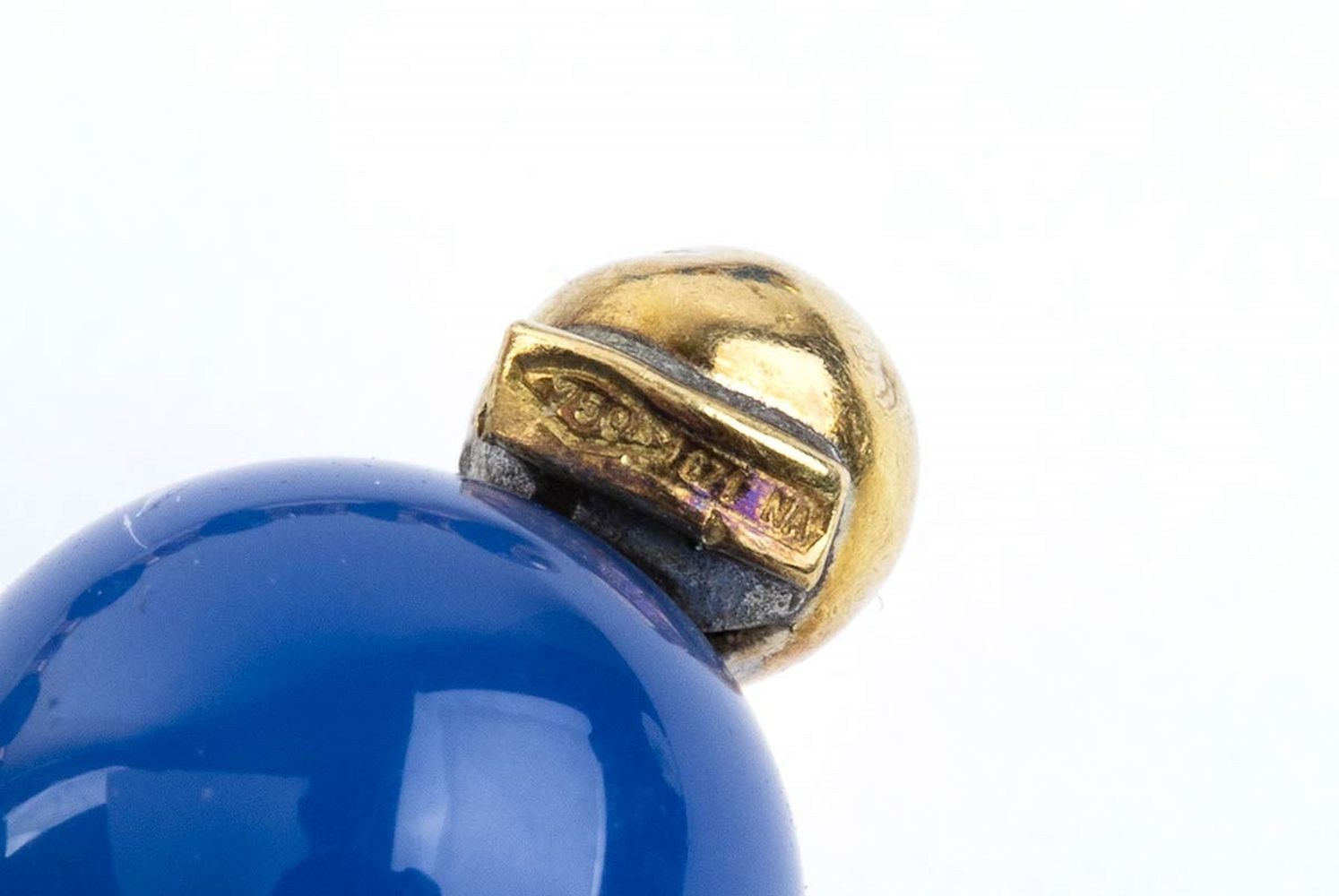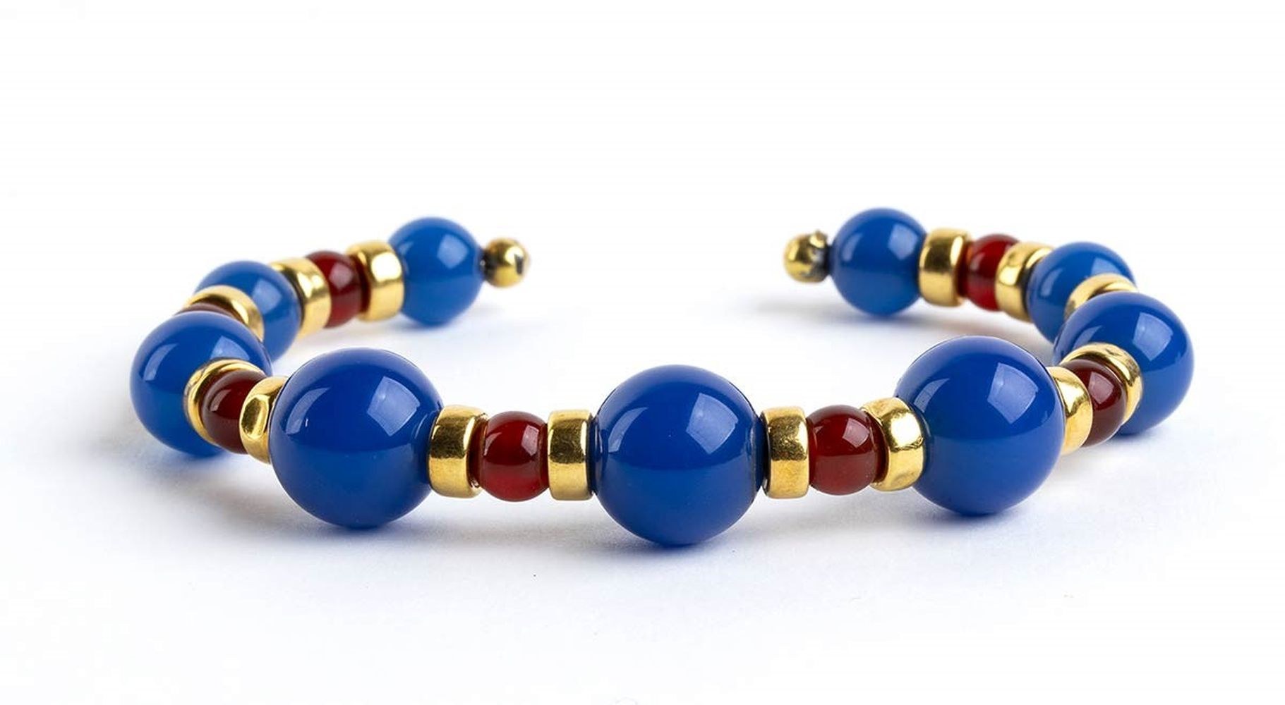 18k yellow gold, with line of chalcedony and carnelian beads.