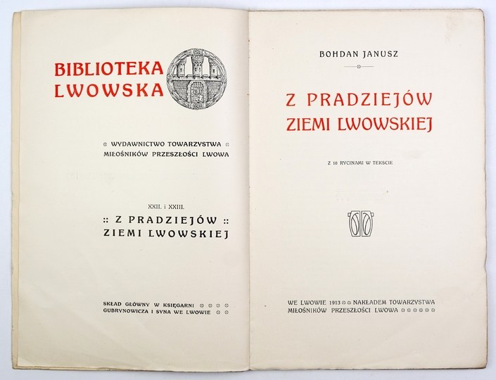 JANUSZ Bohdan - Z pradziejów Ziemi Lwowskiej. Z 10 ryc. w tekście. Lwów 1913. Tow. Miłośników Przeszłości Lwowa. 8, s. 92, [1]. brosz. Biblioteka Lwowska, t. 22-23.