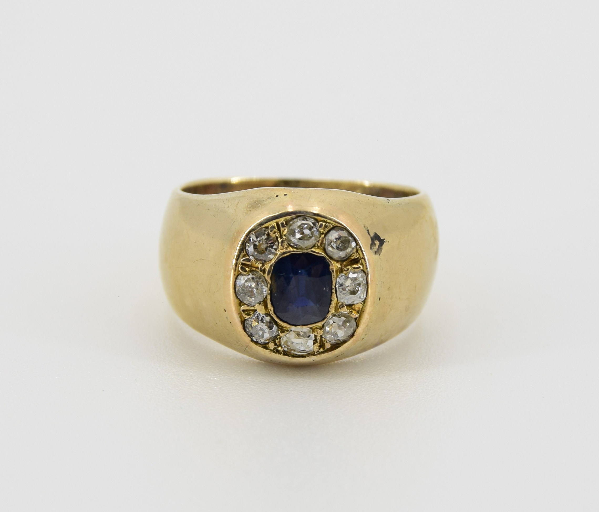 owalny, fasetowany szafir o masie ok. 0.50 ct w otoczeniu 8 szt. diamentów w starym szlifie europejskim o masie łącznej ok. 0.70 ct (Si1-P2/E-I),