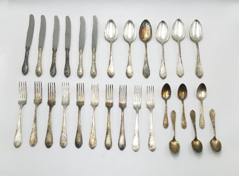w składzie: -) 10 widelców: dług. 21 cm; -) 6 łyżek do zupy: dług. 20,8 cm; -) 6 noży: dług. 24,3 cm; -) 6 łyżeczek do herbaty: dług. 14,5 cm;