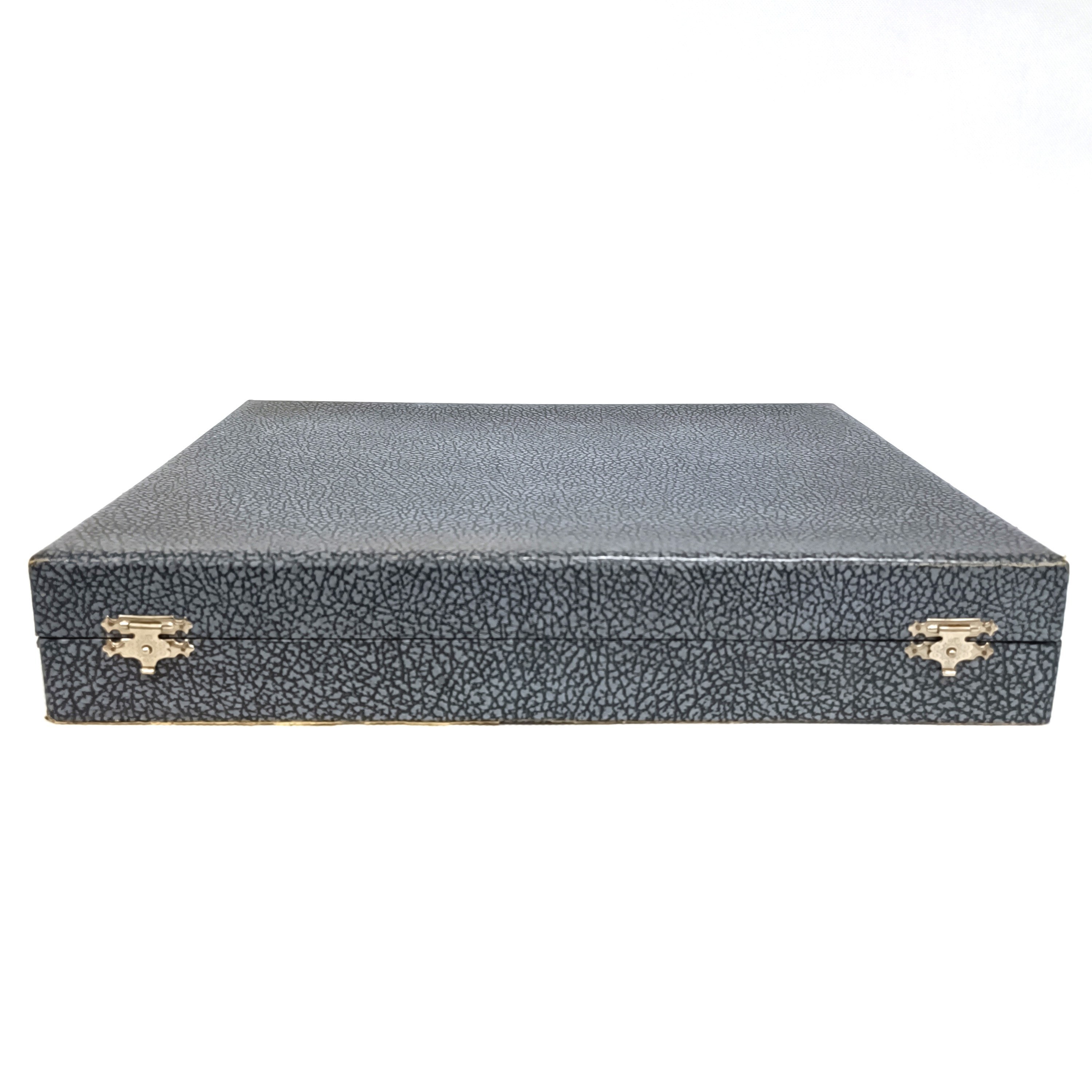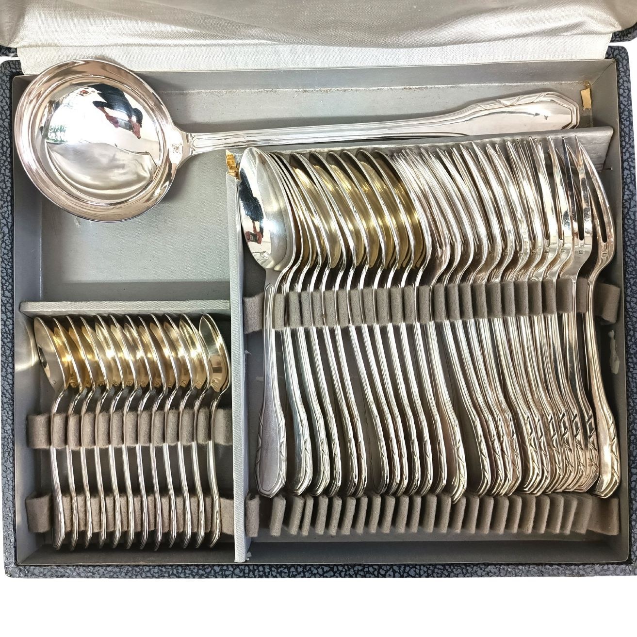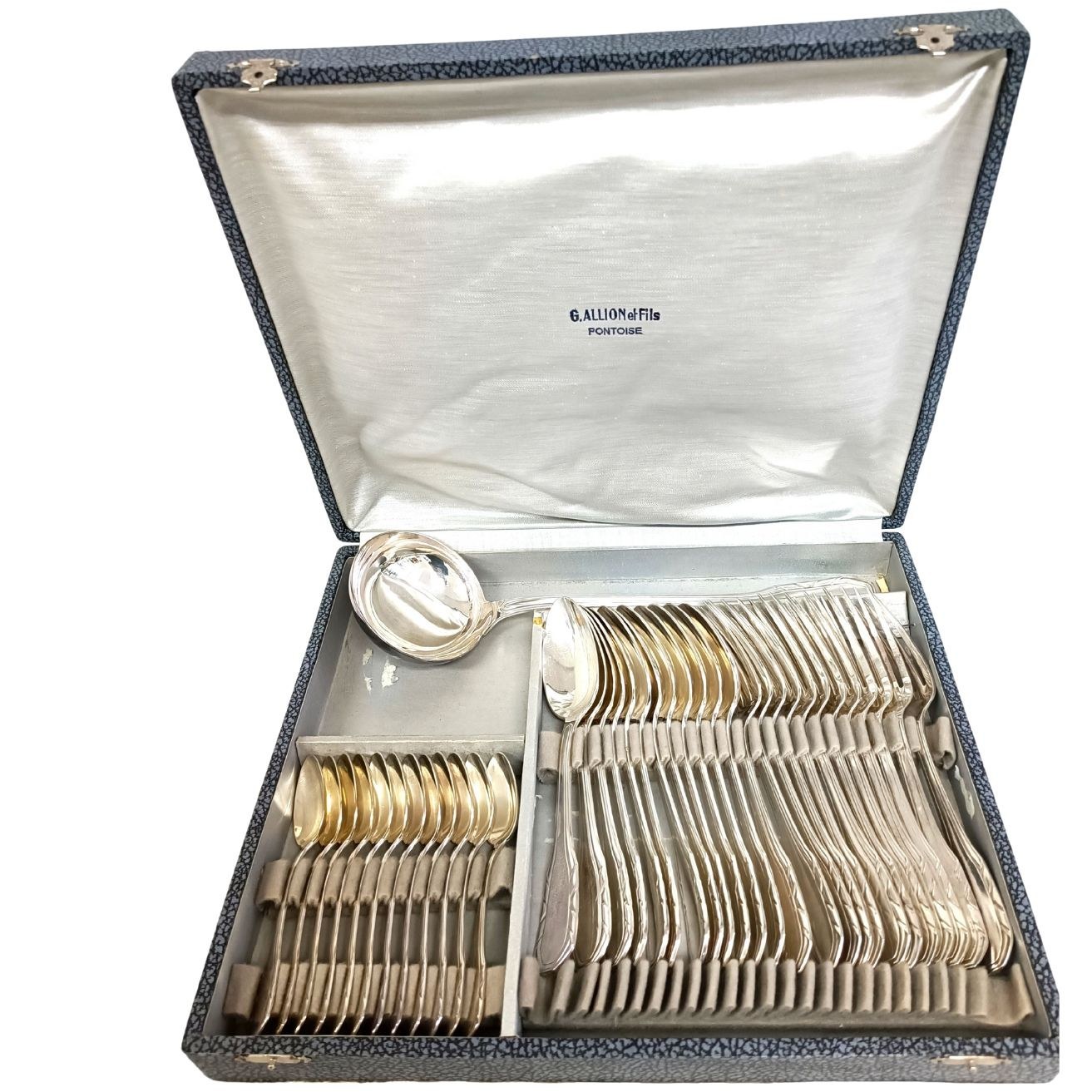 Posrebrzany komplet z nowego srebra w stylu Art déco. Składa się z 37 elementów: 12 widelców, 12 łyżek, 12 łyżeczke, chochla. Całość w sztywnej walizeczce (sygnowana G.Allion et Fils/Pontoise, dystrybutor?). Punce producenta i materiału. Niewielke ślady upływu czasu. Walizeczka ma niewielkie przetarcia na zewnątrz/uszkodzenia w środku. Stan całości dobry/bardzo dobry.