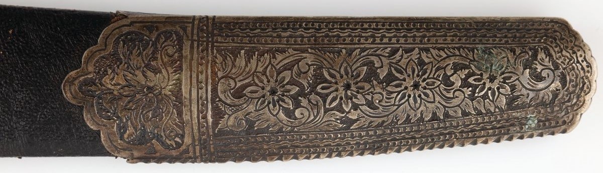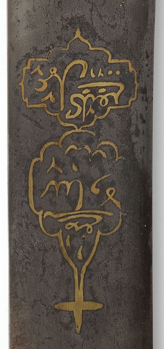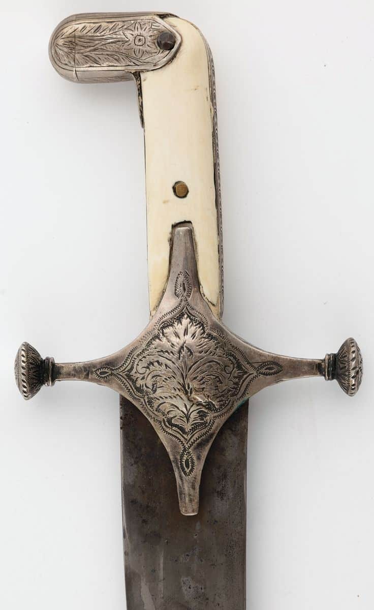 Głownia stalowa z nabitym złotem napisem alfabetem arabskim; jelec i oprawa rękojeści z białego metalu pokryte ornamentem floralnym; okładziny z kości; pochwa drewniana, łubkowa, obita skórą; okucia z białego metalu pokryte rytym ornamentem roślinnym.