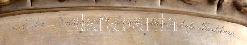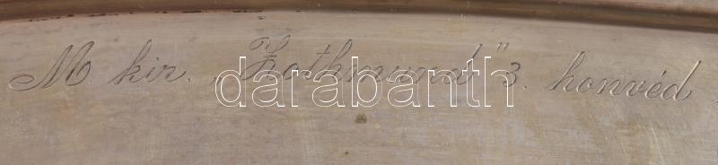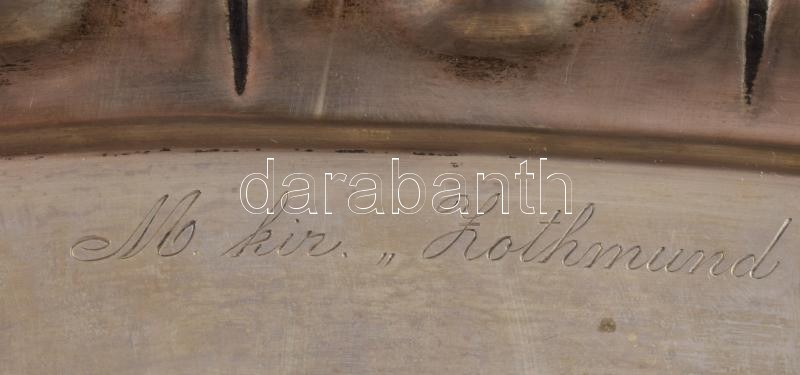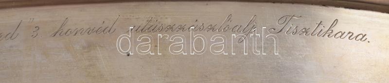 cca 1930-1940 M. kir. ,,Zothmund" 3. honvéd utászzászlóalj Tisztikara gravírozott felirattal ellátott ezüst (Ag) tálca, jelzett, nettó: 223 g, 33,5x14,5 cm A M. Kir. Honvédség felső vezetése a történelmi hagyományok ápolása céljából 1930. március 1-től bevezette, hogy a különböző alakulatokat - gyalogezredeket, kerékpáros zászlóaljakat, huszárezredeket, tüzérosztályokat, utászzászlóaljakat - a számozás fenntartása mellett kimagasló történelmi és katonai személyekről nevezzék el. A m. kir. 3. honvéd utászzászlóalj a ,,Zothmund" nevet kapta, Zotmund lovag, ismertebb nevén Búvár Kund után, aki a krónikák szerint 1051/1052-ben megfúrta és elsüllyesztette III. Henrik német-római császár Pozsony városát ostromló hajóit, ezáltal visszavonulásra kényszerítve az ellenséges sereget.