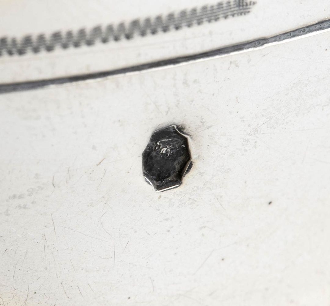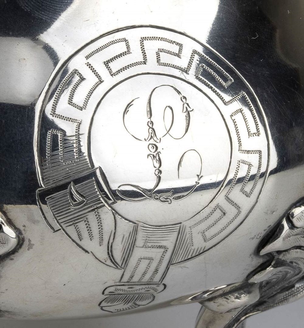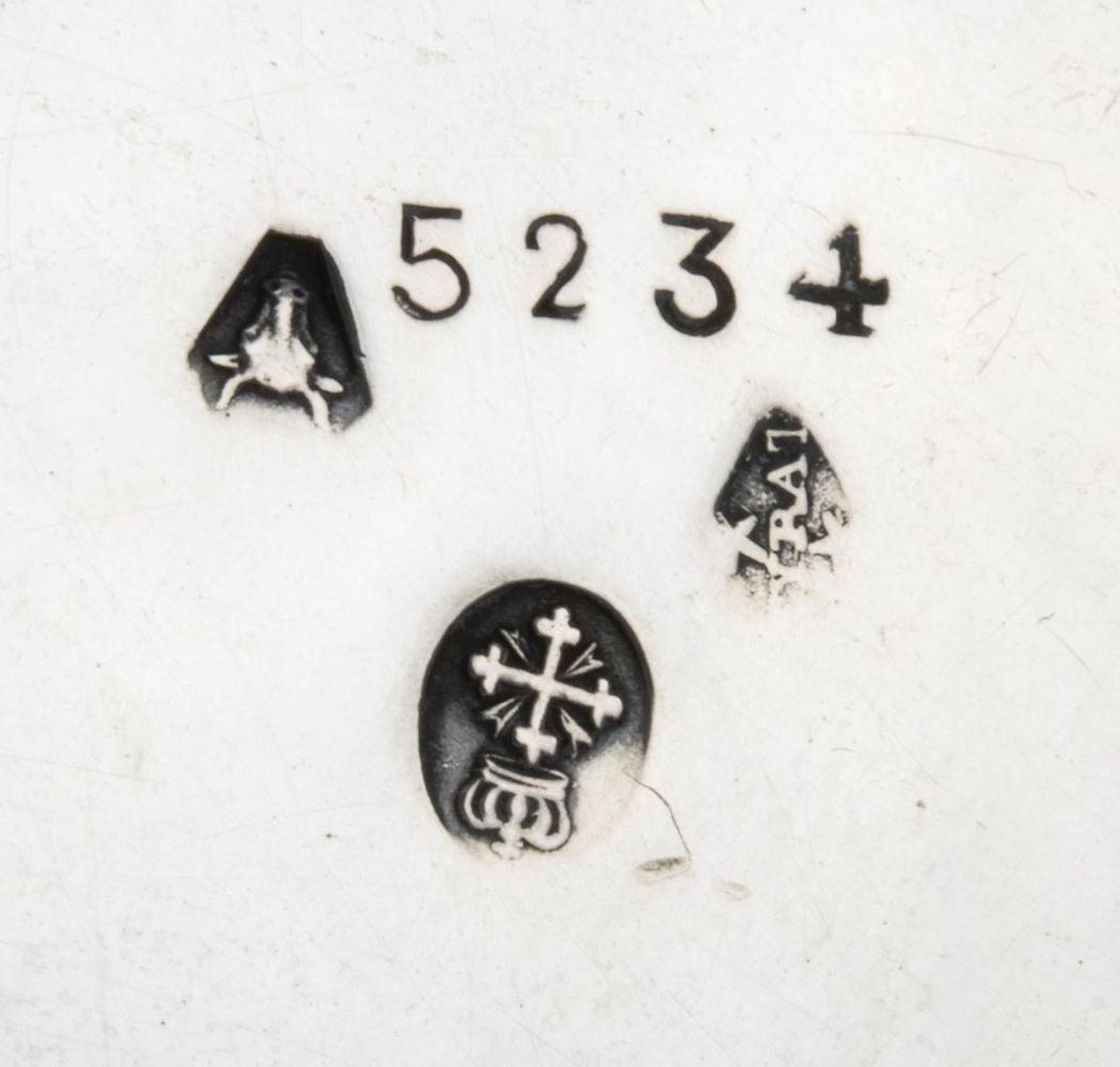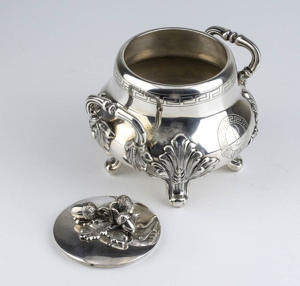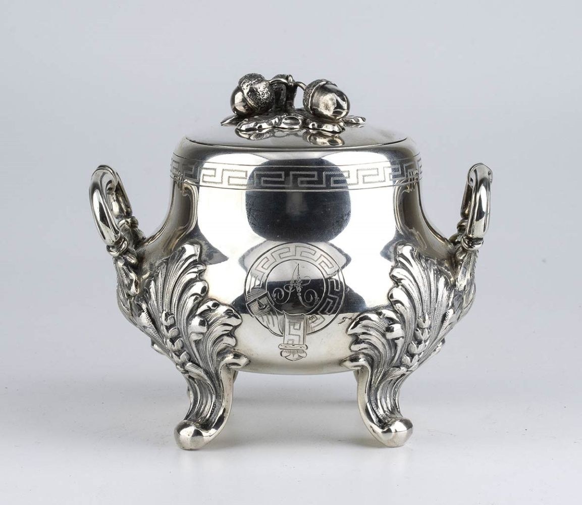 circular in shape with side handles resting on four leafed feet; the lid with an acorns and oak leaves final. 800/1000 silver, hallmarked with the French export mark "head of mercury" in use from 1840, silversmith Jean Francois Veyrat, 1831-1840 and with the marks in use in Turin, Kingdom of Sardinia from 1824 to 1872.