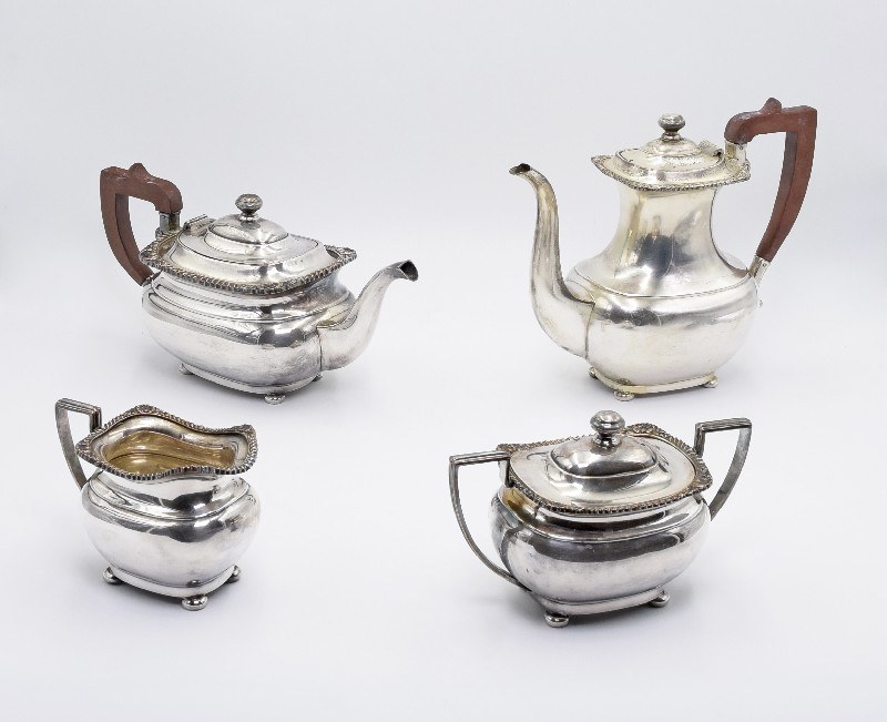 składający się z imbryka do herbaty (wys. 15 cm, szer. 31 cm, głęb. 11,6 cm), dzbanka do kawy (wys. 23,5 cm, szer. 27 cm, głęb. 11 cm), cukiernicy (wys. 13,2 cm, szer. 20 cm, głęb. 10 cm) i mlecznika (wys. 10,5 cm, szer. 14,5 cm, głęb. 9 cm)