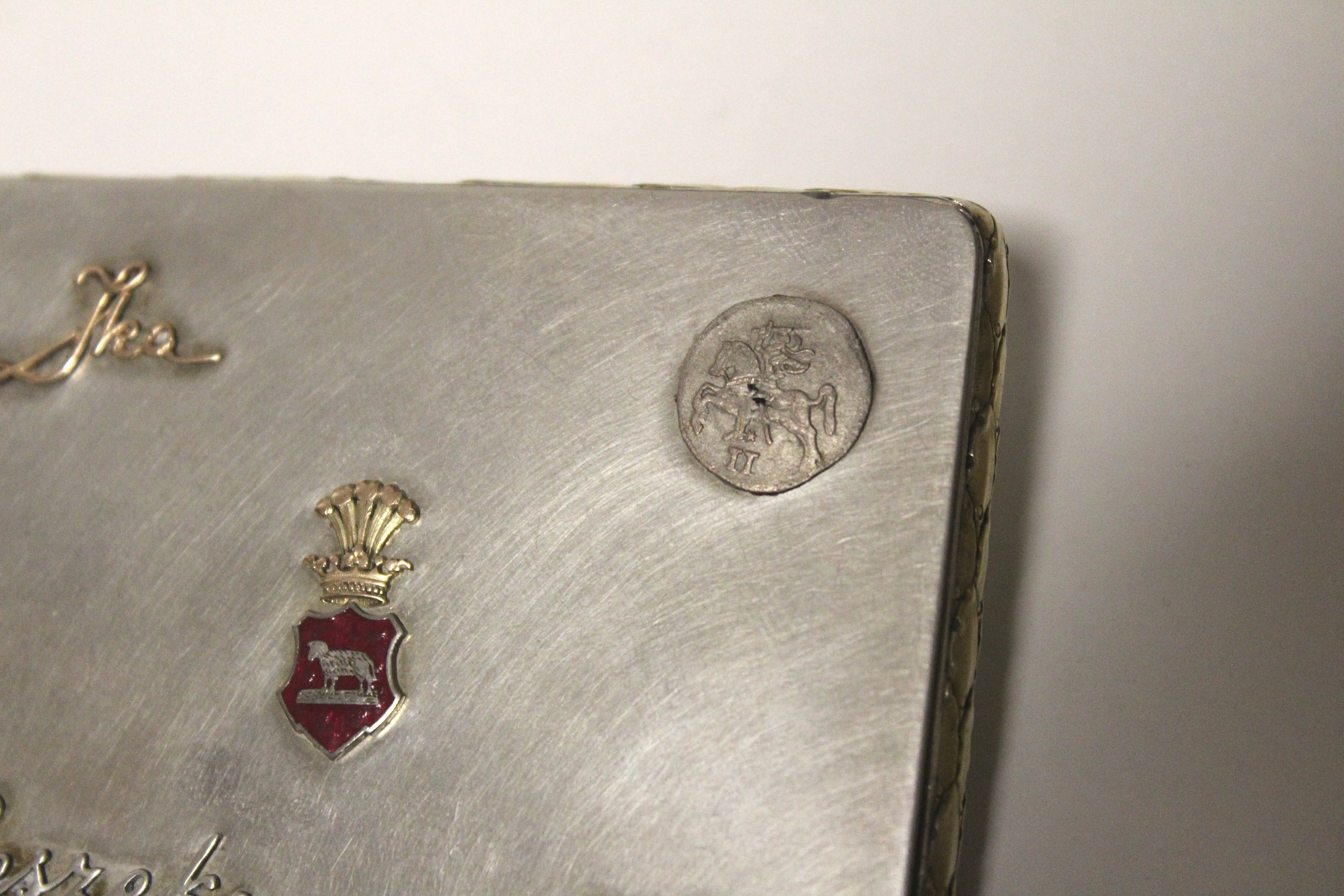 Elegancka masywna tabakierka po szlacheckiej rodzinie herbu Junosza. Srebro próby "3" (800). Aplikacje wykonane w litym złocie. Na licu umieszczone faksymilia podpisów ofiarodawców: Leszek, Matka i Ika. W górnym prawym rogu zamontowany srebrny grosz litewski z czasów Zygmunta Augusta (ok. 1560 r.). Stan dobry, wieczko szczelnie się zamyka.