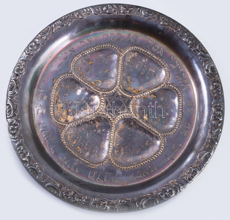 Szédertál, ezüst (Ag) XIX. sz. vége. dianás jelzéssel, GU mesterjeggyel 611g, d: 31 cm Seder plate, silver (Ag) late 19th century. Hungary, Diana hallmark, GU master mark 611g, d: 31 cm