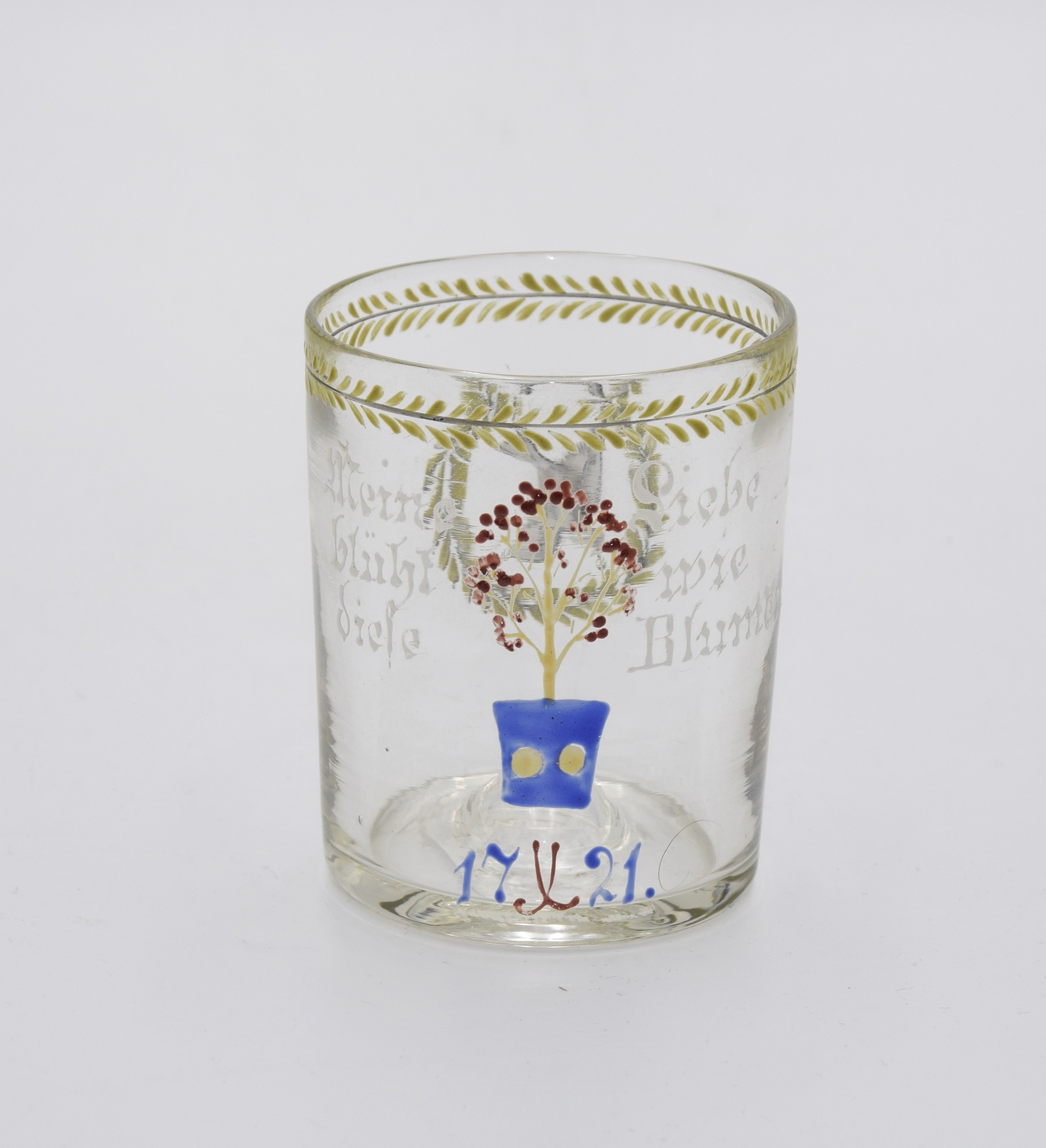 Stopa kolista, kształt korpusu prawie cylindryczny. Od frontu wazonik niebieski, z krzaczkiem obsypanym kwieciem. Górna krawędź obwiedziona pasem złotych listków, ze zwisającym wieńcem. Po bokach napis w jęz. niemieckim: „Meine / Liebe / blűht / wie/ diese / Blumen”. Na samym dole niebiesko-czarny napis z datą: „17 X 21”.