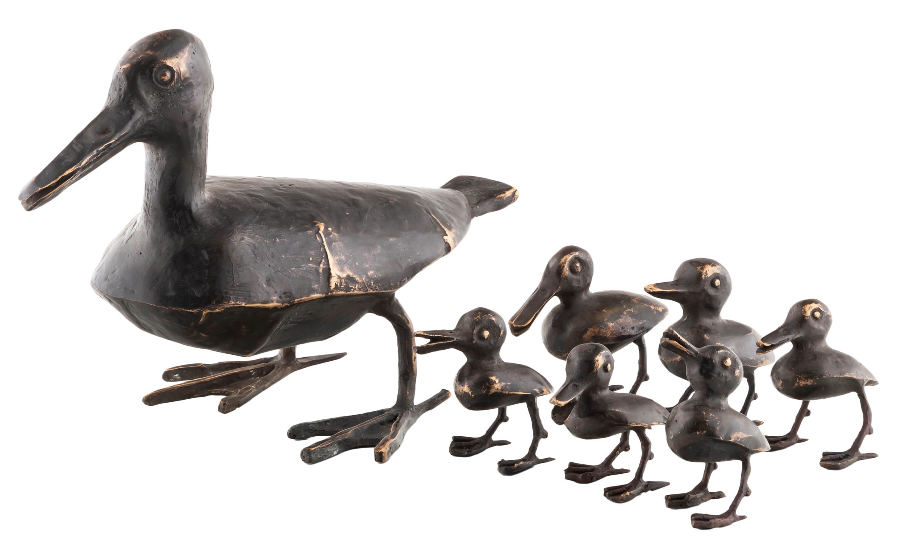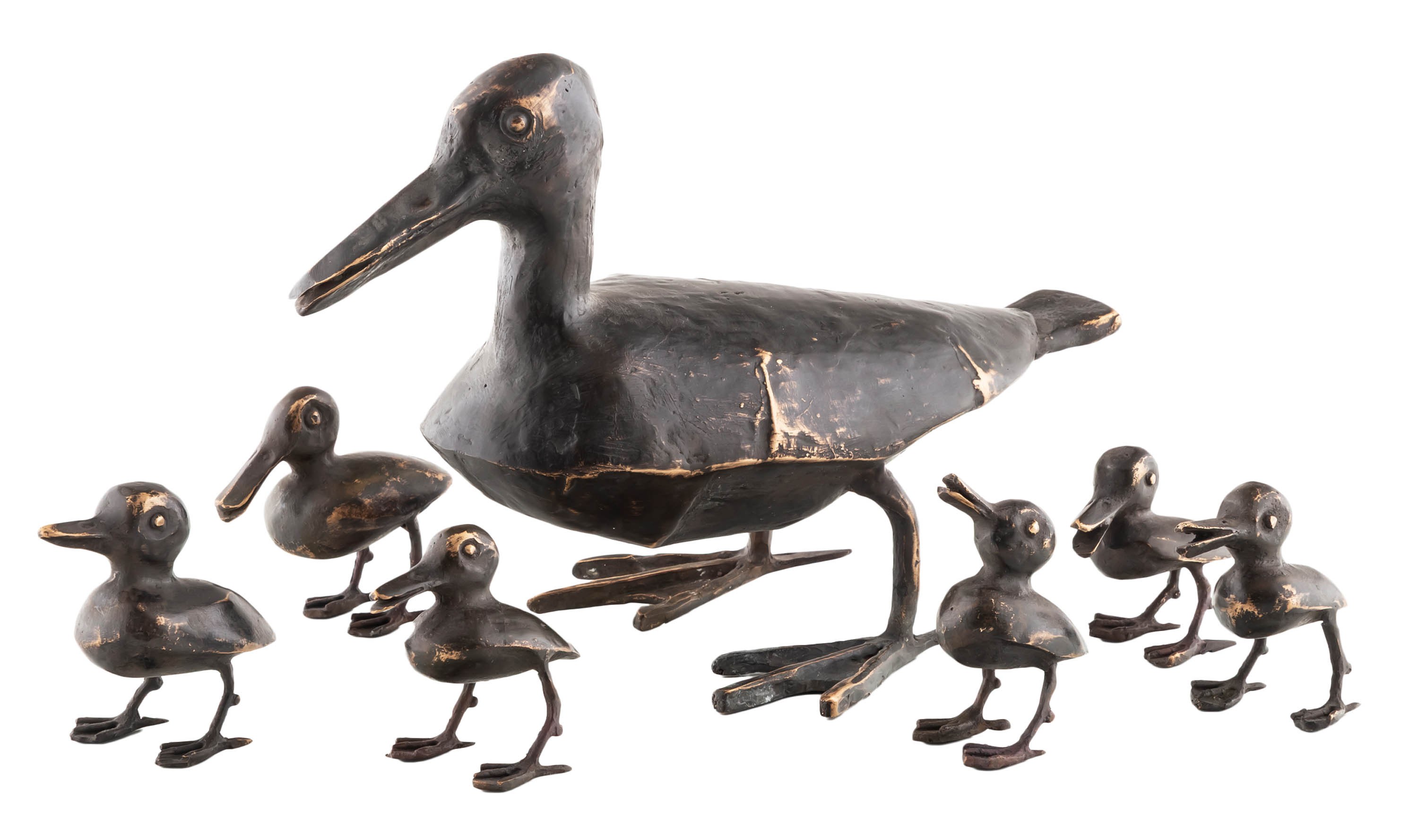 odlewy z brązu, komplet, mama kaczka i 6 małych kaczuszek
