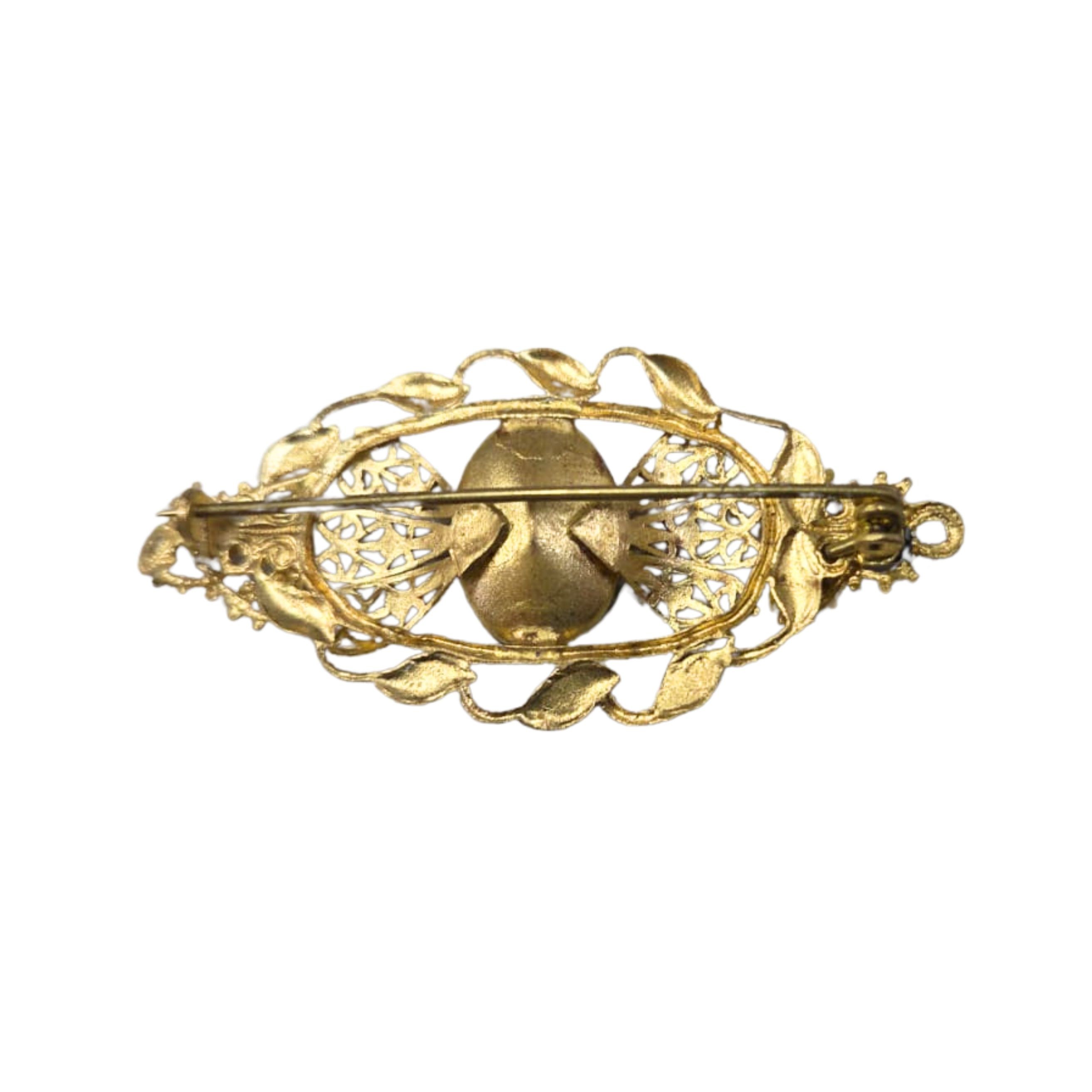 Elegancka broszka w kolorze złotym, z dużym niebieskim oczkiem.
