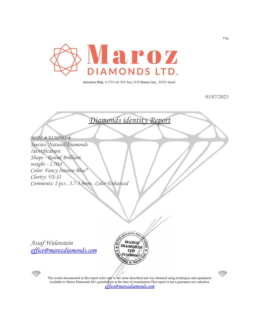 9 DIAMONDS EXALTED 1.7 CARATS FANGY INTENSE BLUE COLOR* - VS -SSI CLARITY - BRILLIANT CUT - GEMOLOGICAL CERTIFICATE MAROZ DIAMONDS LTD MEMBER ISRAEL DIAMOND EXCHANGE - AI30701-4