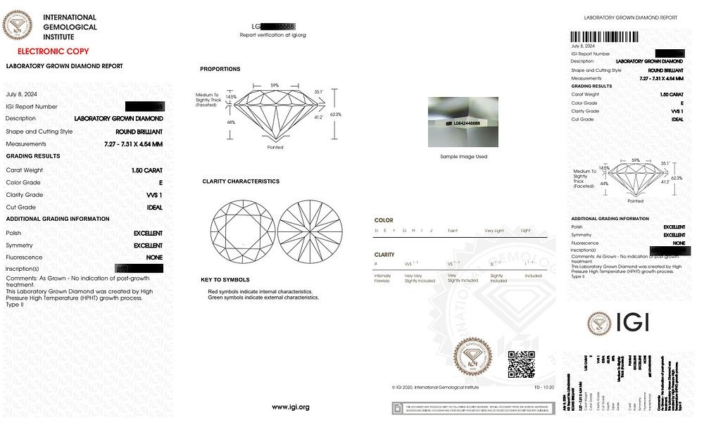 IGI CERTIFICATE WITH REPORT NUMBER ENGRAVED IN THE DIAMOND CROWN