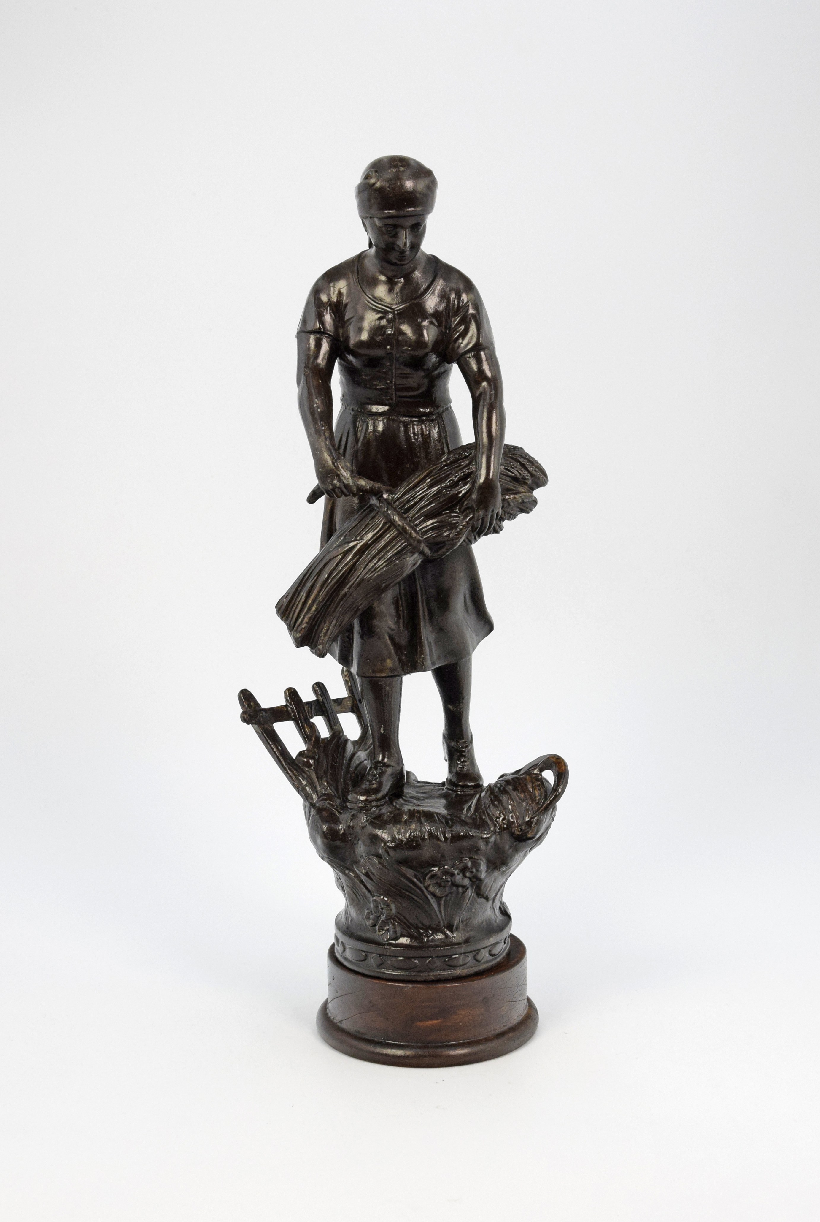 Figura kobiety w krótkiej sukni, obwiązującej powrósłem zżęty snop zboża. Podstawa drewniana, toczona.