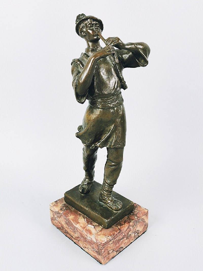 Podstawa prostopadłościenna, marmurowa. Cokolik rzeźby powtarza plan prostokąta, o mniejszym zarysie. Postać kroczącego grajka dmącego w fujarkę, w stroju górala z Huculszczyzny - w kapeluszu, długiej koszuli z szerokim pasem, kożuchowym serdaczku, portkach i kierpcach mocowanych rzemykami. Na podstawie tabliczka z napisem: „WYTWÓRNIA ARTYSTYCZNA / WŁADYSŁAW MIECZNIK / WARSZAWA, UL. NOWOGRODZKA 4”.