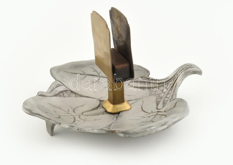 Antik gyufatartós hamuzó. Asztali tömör öntöttvas levél formájú hamuzó, réz szecessziós Gyufásdoboztartóval , Jelzett:...