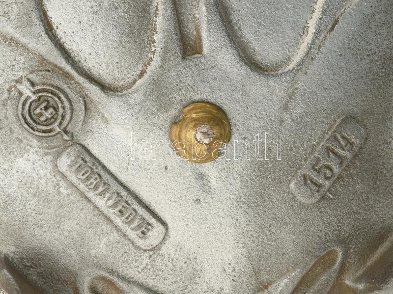 Antik gyufatartós hamuzó. Asztali tömör öntöttvas levél formájú hamuzó, réz szecessziós Gyufásdoboztartóval , Jelzett:"H Törv.védve és formaszám. Szép.korának megfelelő állapotban. 19x11 cm