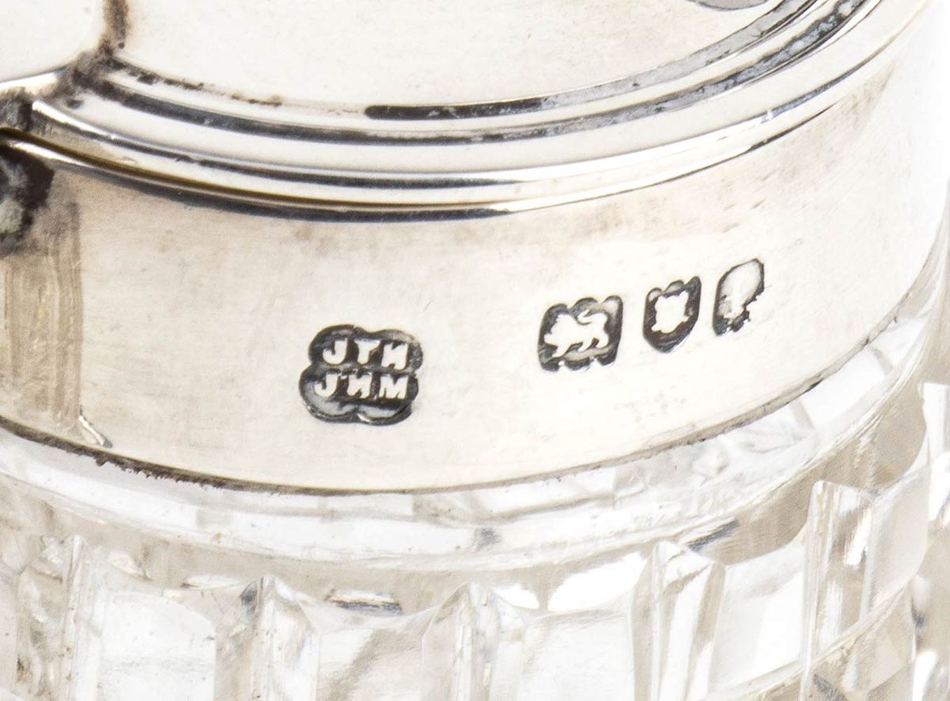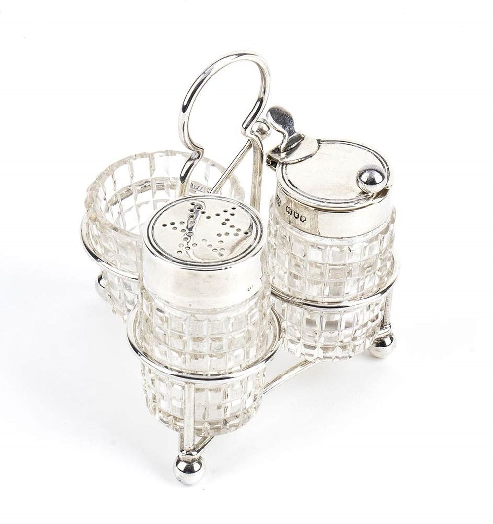 of triangular shape with three cut glass containers. Sterling silver, fully hallmarked Londra 1901-1902, silversmiths Hukin & Heath, John Thomas Heath & John Hartswore Middleton.