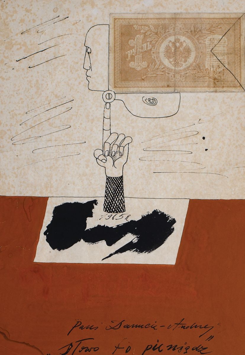 Tusz, gwasz, kolaż; 41 x 28 cm (w świetle p-p)