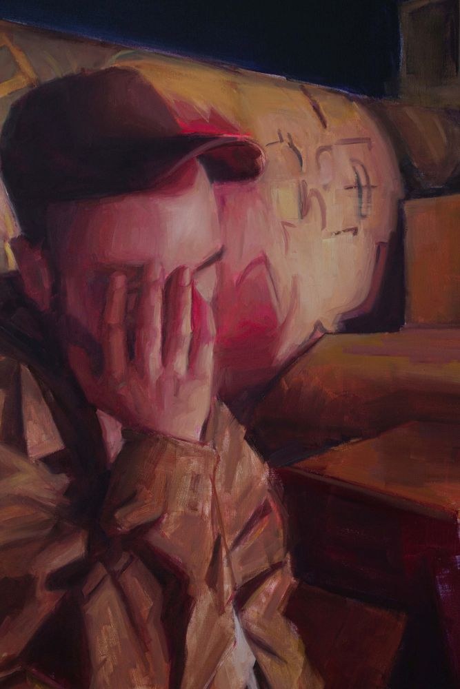 Acrylic, spray and oil on canvascm. 160x130Edoardo Ettorre was born in L' Aquila in 1994. In 2013, he enrolled at the Academy of Fine Arts where he experimented with several fields of visual arts, being particularly fascinated by installations and Street Art, expressions that often coexist in his works. Hand in hand with his experience abroad, an interest in the dynamics of modern society and social criticism began to manifest itself in his works. He currently devotes himself to predominantly pictorial research, ranging from small paintings to large murals. He paints, using different techniques, familiar images captured every day by our gazes, such as a waitress on the phone or a snapshot of an evening with friends. His poetics focuses on the relationship between the individual and society, on aspects of the 'pre-packaged' world in which we live. By questioning these issues, he leads the viewer to reflect, using the tones of sarcasm.