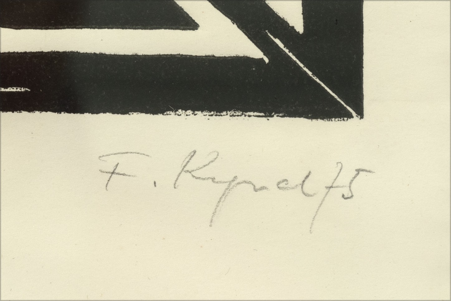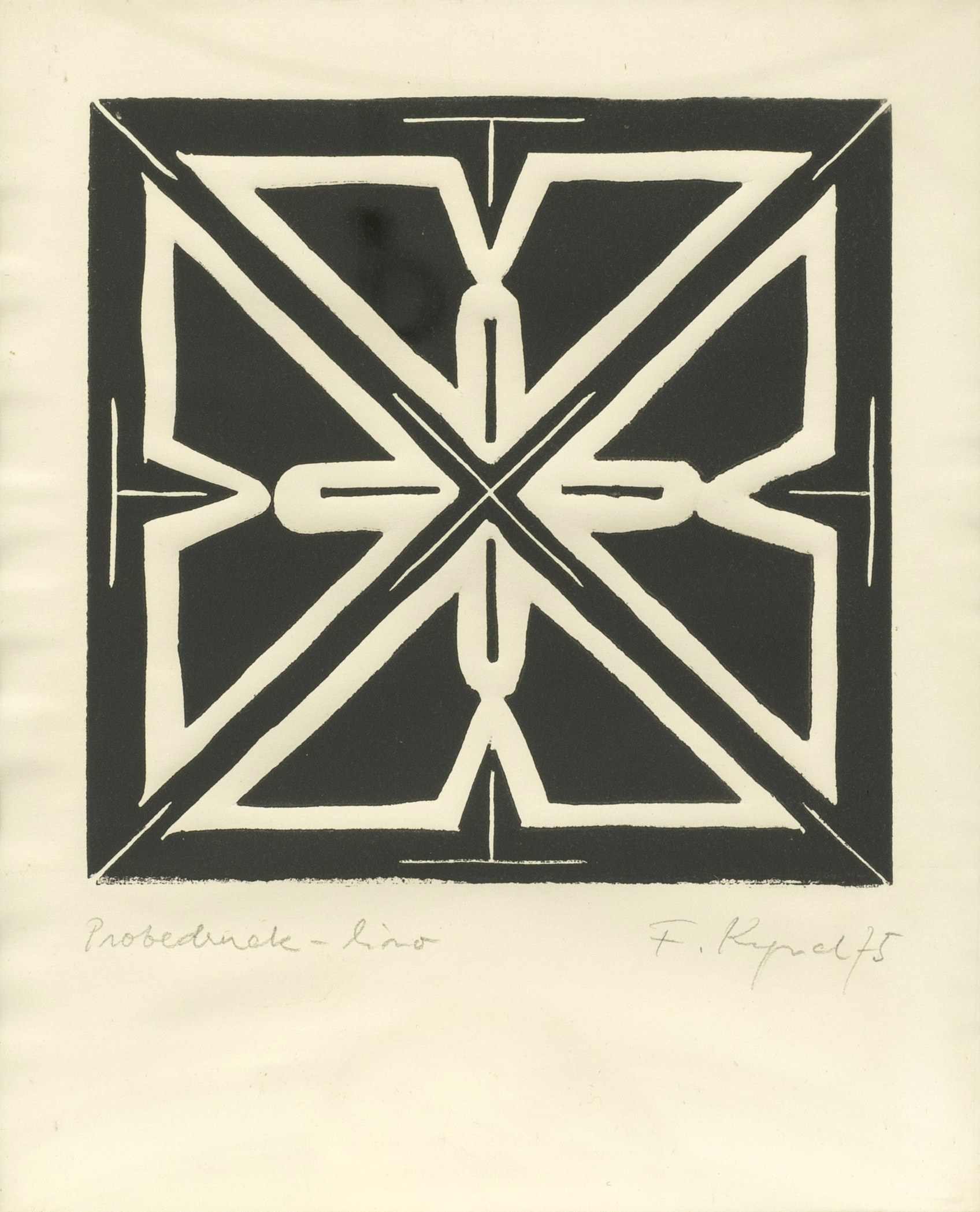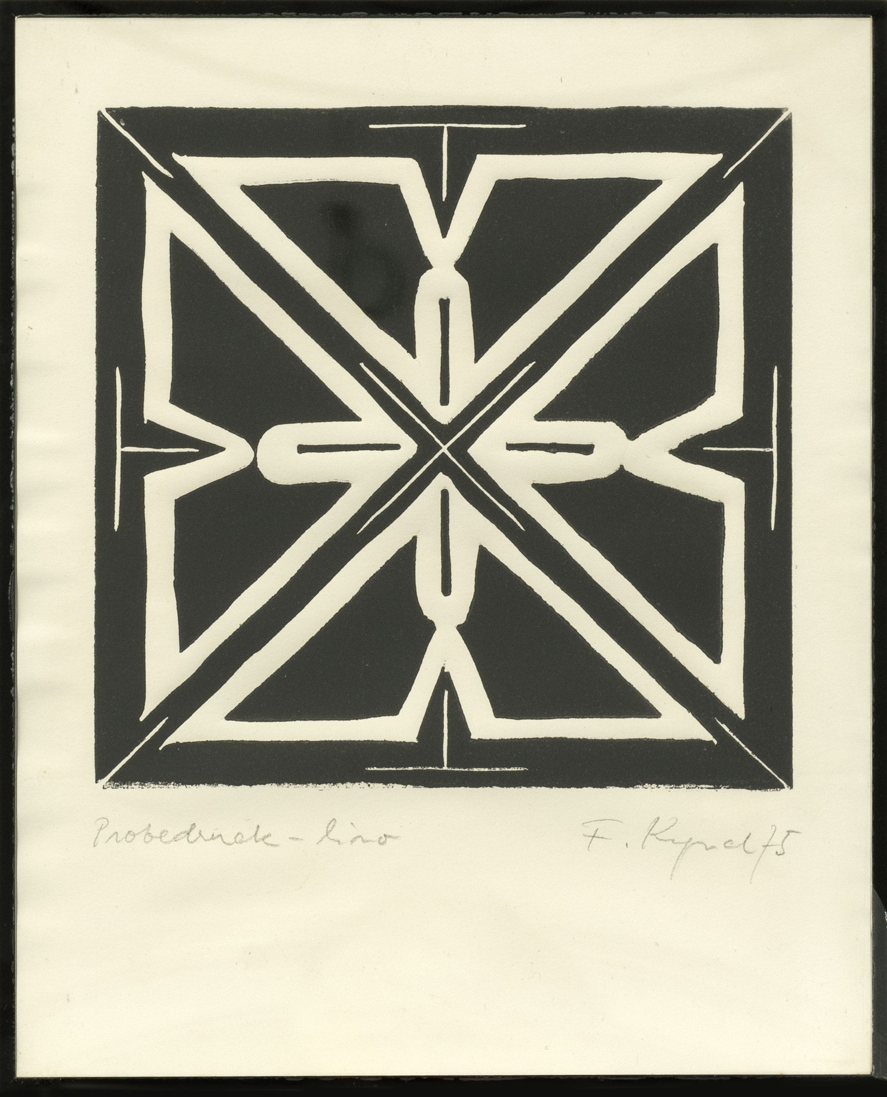 Untitled, linocut on paper, 26 cm x 21 cm sheet dimensions, signed, dated 75, proof-lino inscribed, slightly wavy, partially minimally stained