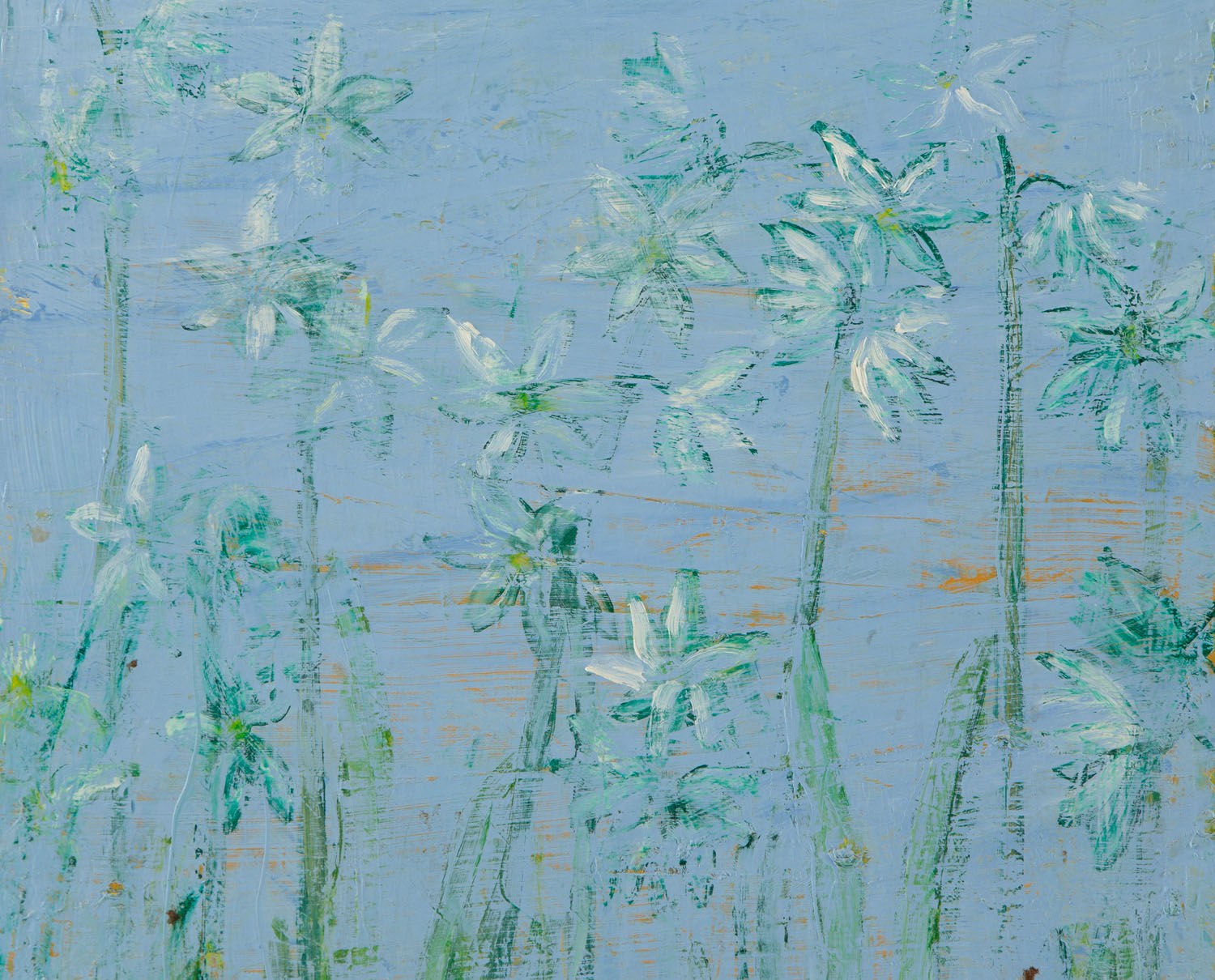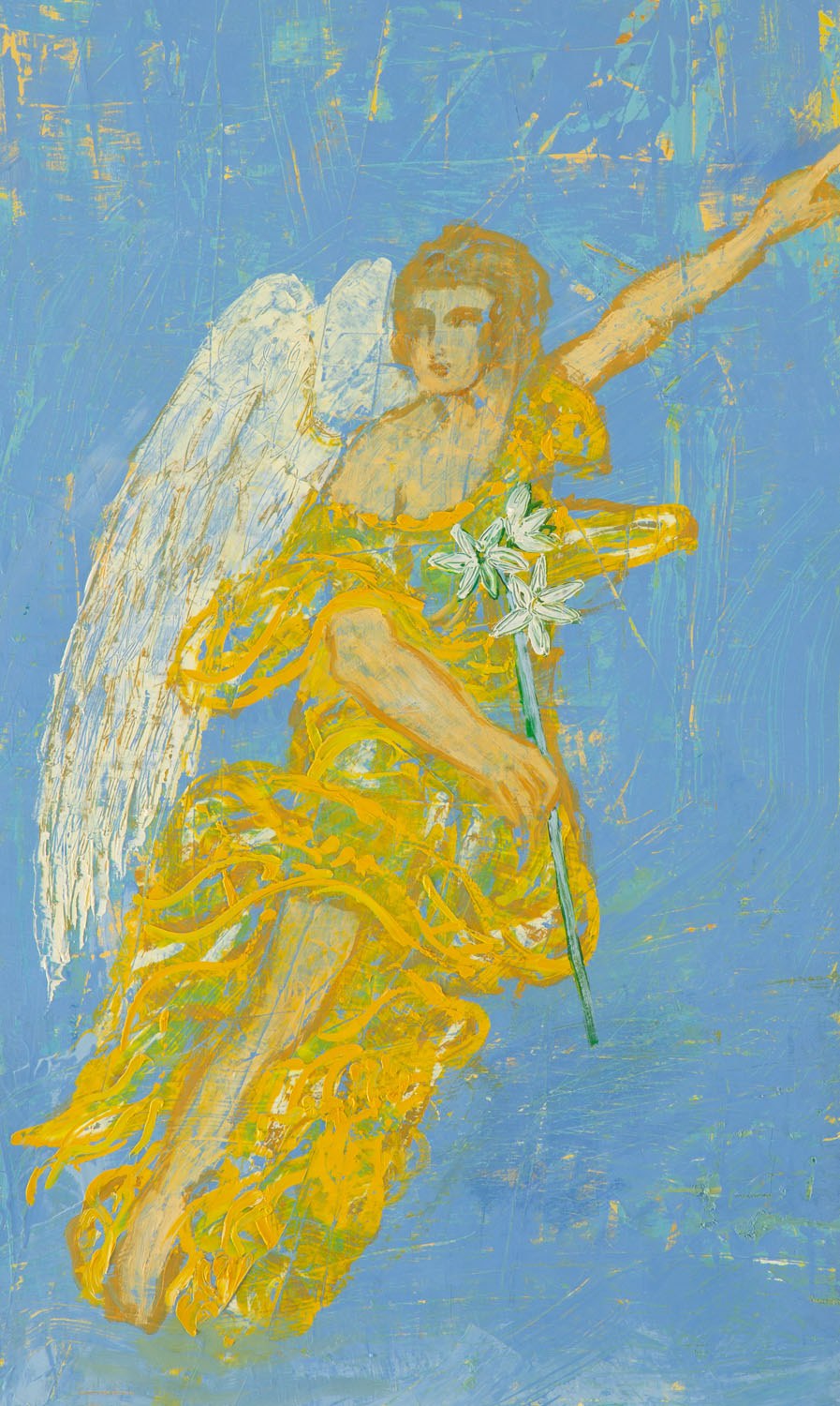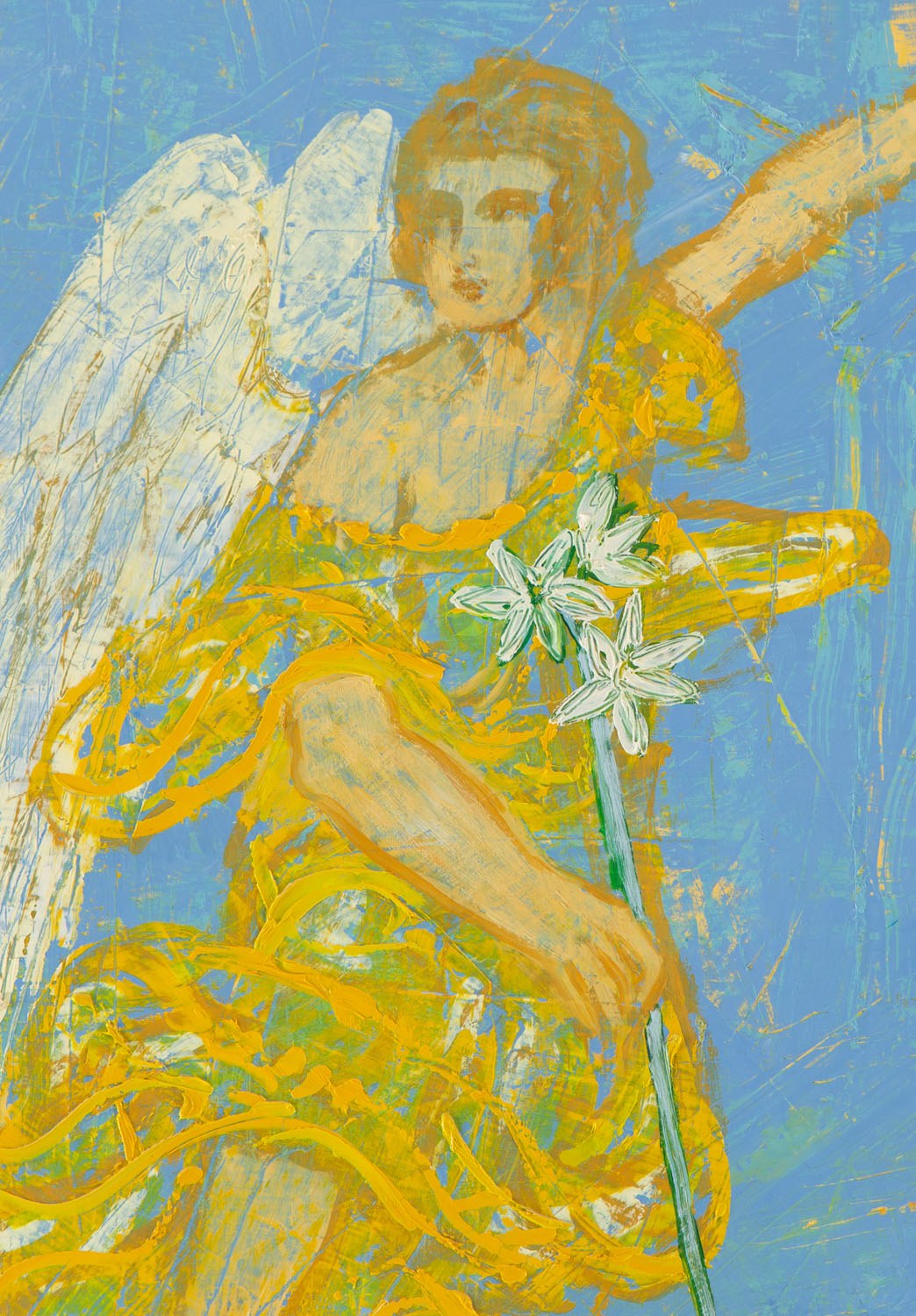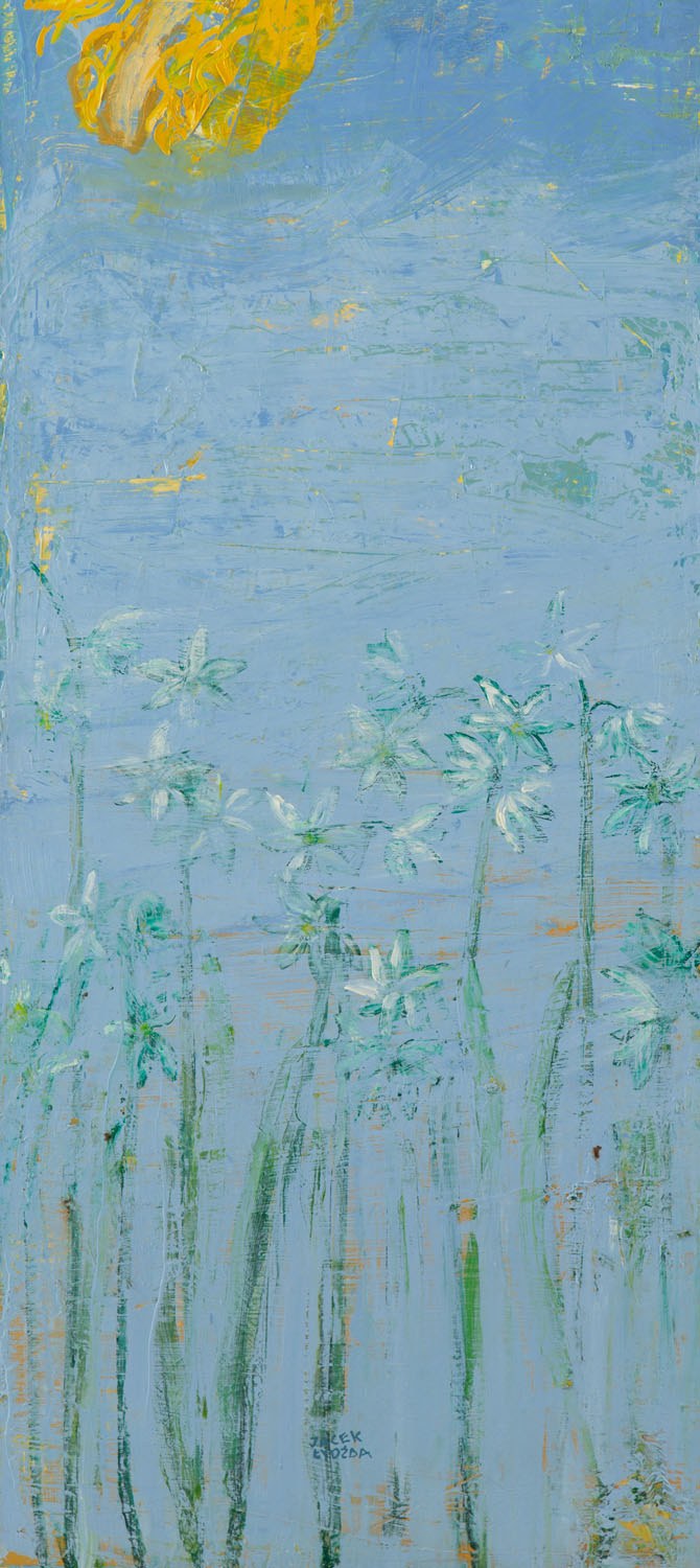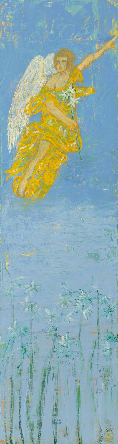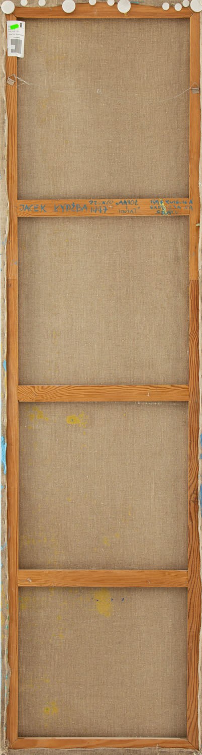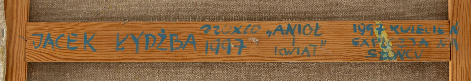 sygnowany, datowany i opisany na krośnie malarskim: 'JACEK ŁYDŻBA | 220 x 60 | 1997 | "ANIOŁ | I KWIAT" |1997 KWIECIEŃ | EXPLOZJA NA | SŁOŃCU'