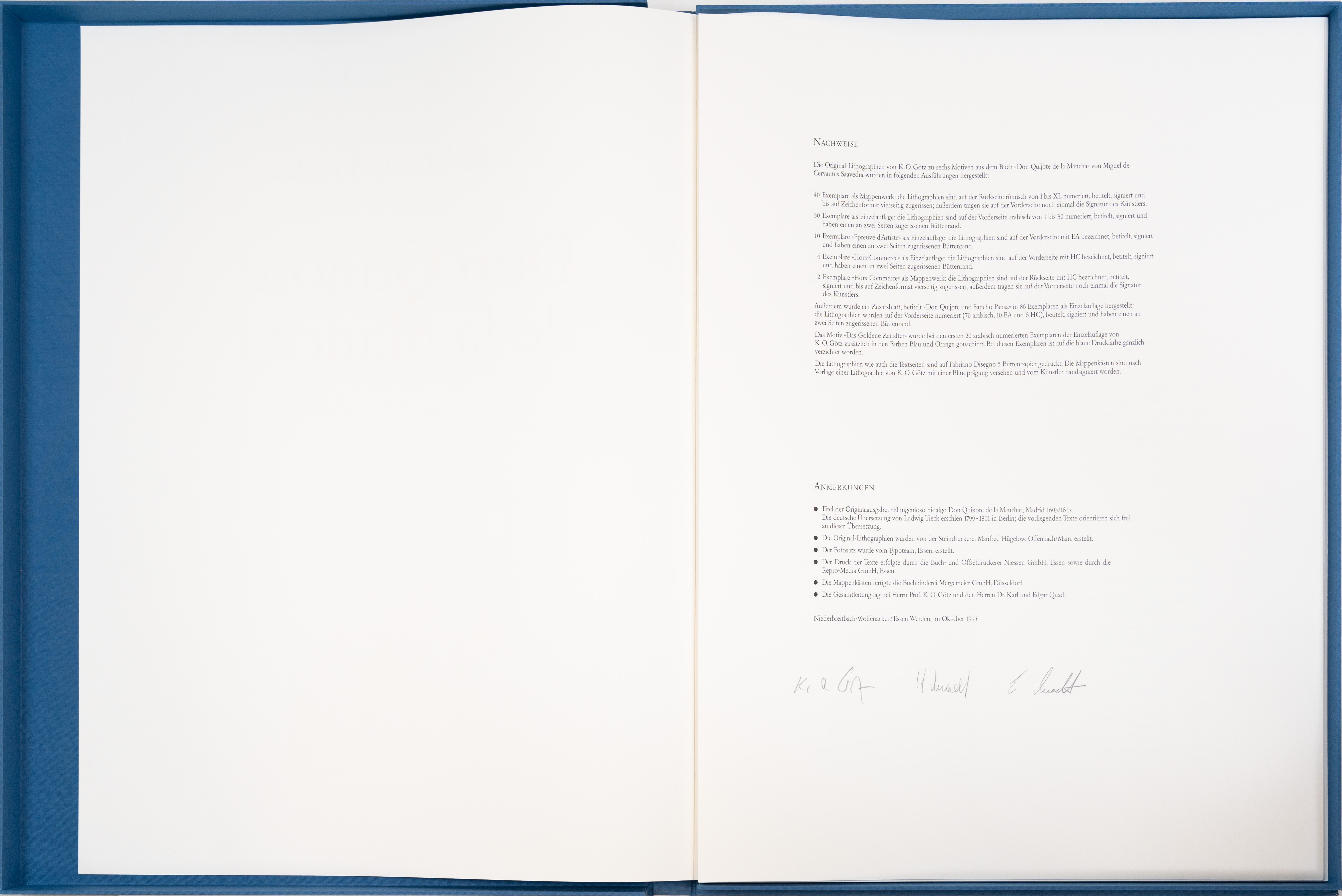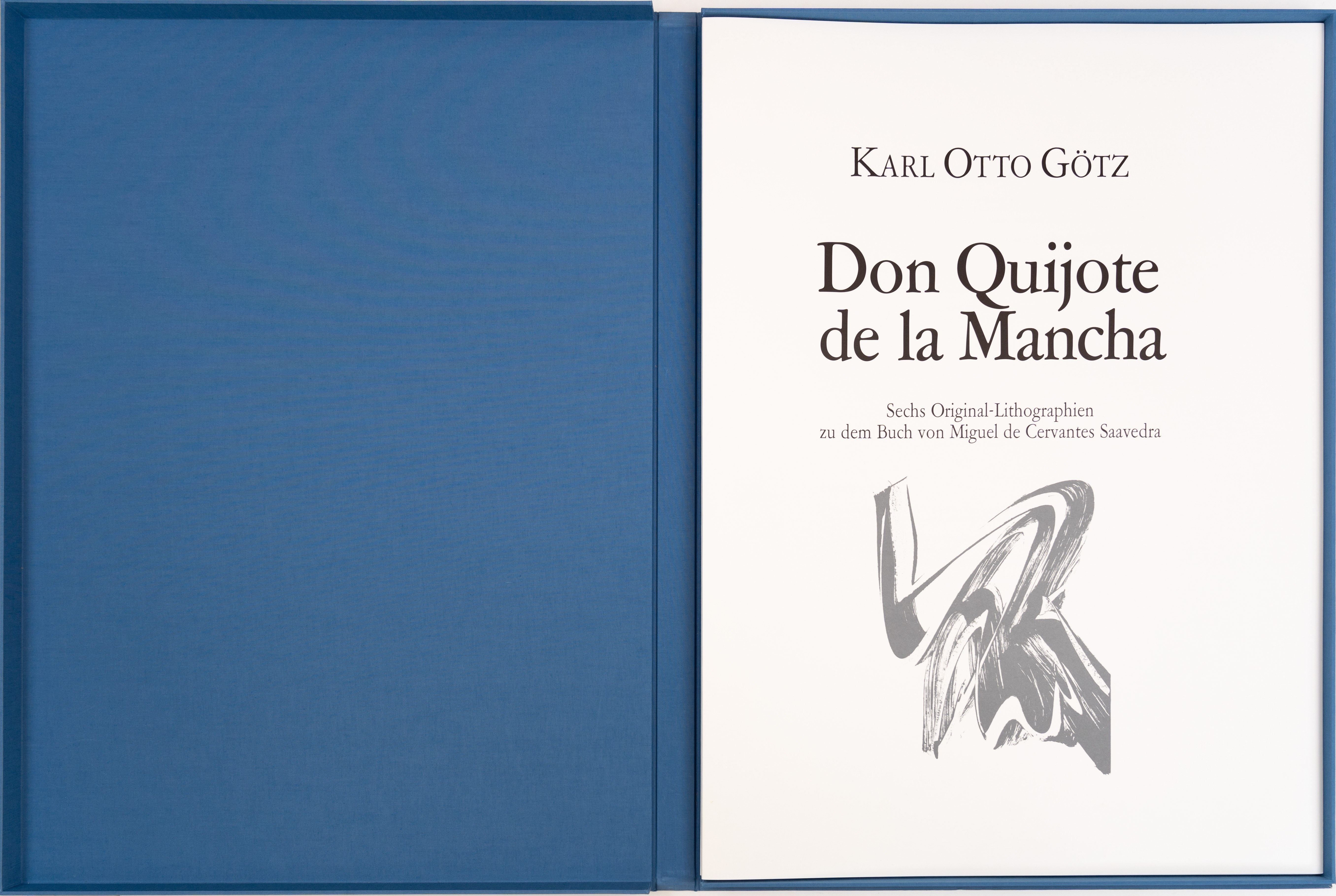 four works from the portfolio 'Don Quijote de la Mancha', 4-pcs, colour lithograph on paper, orig.-lwd. Cassette, title page cover and 6 graphic envelopes with texts from the book by Miguel de Cervantes Saavedra enclosed, these also enclosed in DIN A4, included are: Don Quixote and his fantastic thoughts, Don Quixote and the windmills, Don Quixote and the dream of the golden age and Don Quixote enchanted, the lithographs printed by Manfred Hügelow, Offenbach/Main, 62.5 cm x 49 cm and 51.5 cm x 70 cm sheet dimensions, all sheets signed, mounted on cardboard