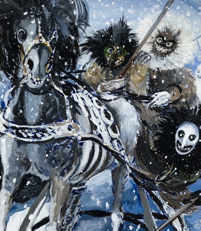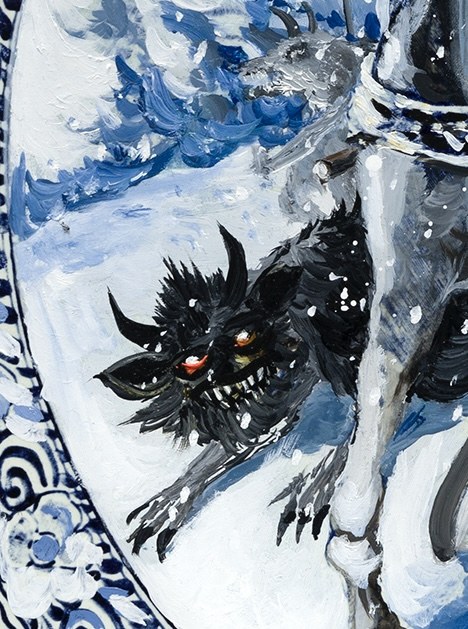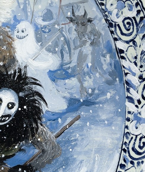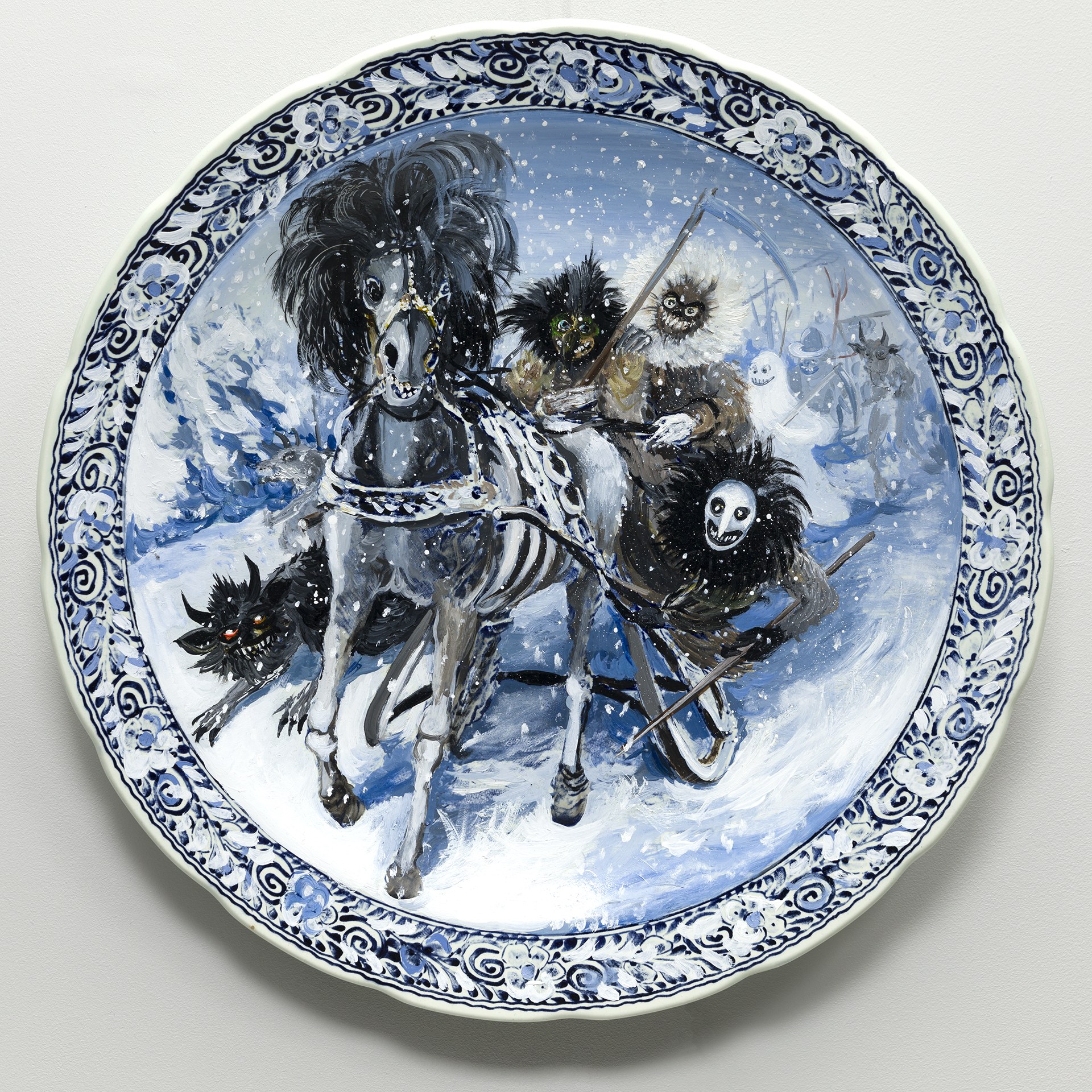 olej, porcelanowy talerz z BOCH Delfts, Ø 39 cm sygnowany, datowany i opisany na odwrociu: "KOLĘDNICY' WOJCIECH PIETRASZ 2025 Ø 39 cm / fajans/farba olejna