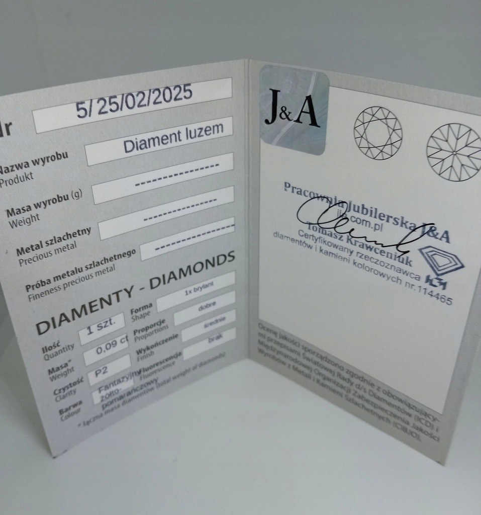 Diament naturalny o barwie fantazyjnej wraz z certyfikatem Rzeczoznawcy IGI - International Gemological Institute.