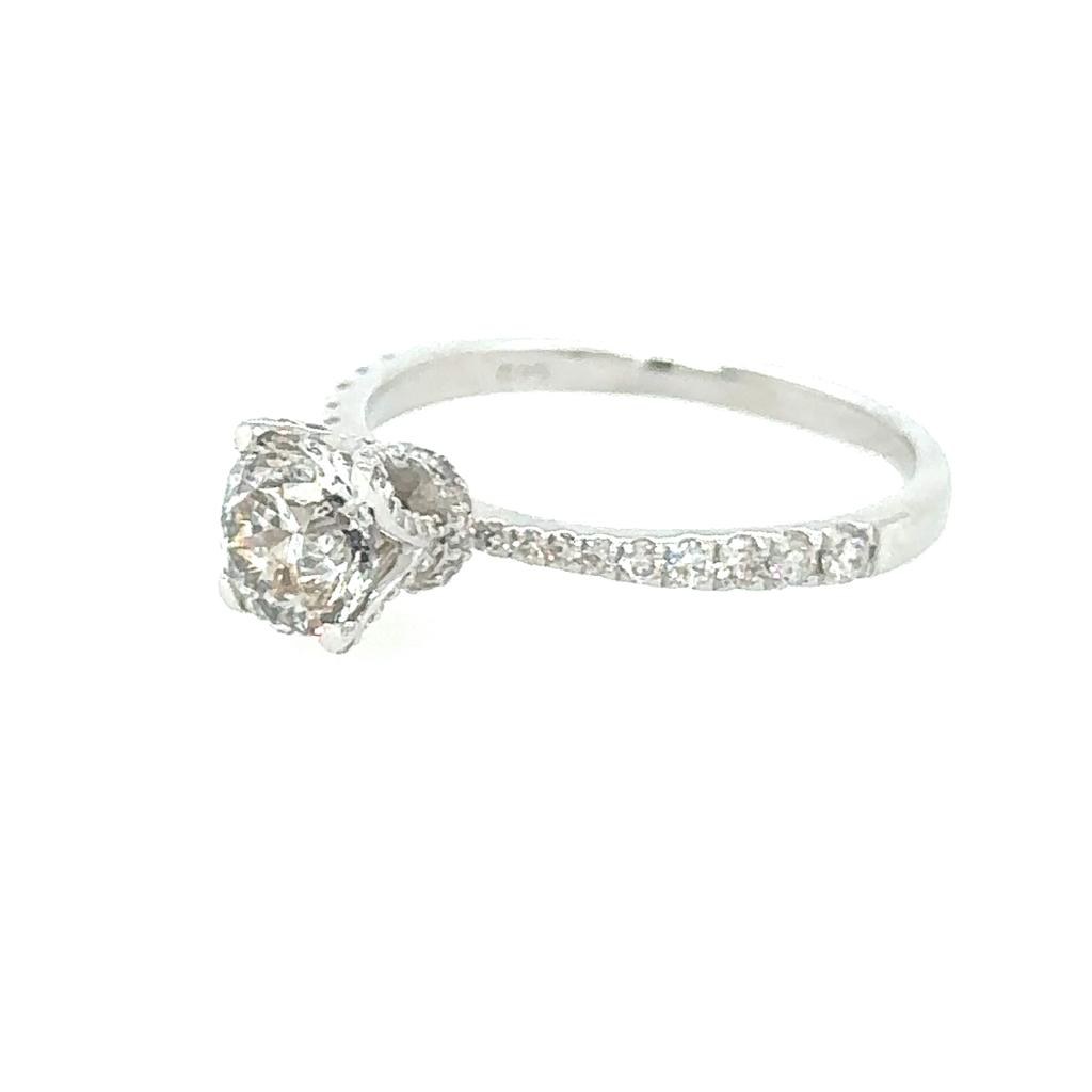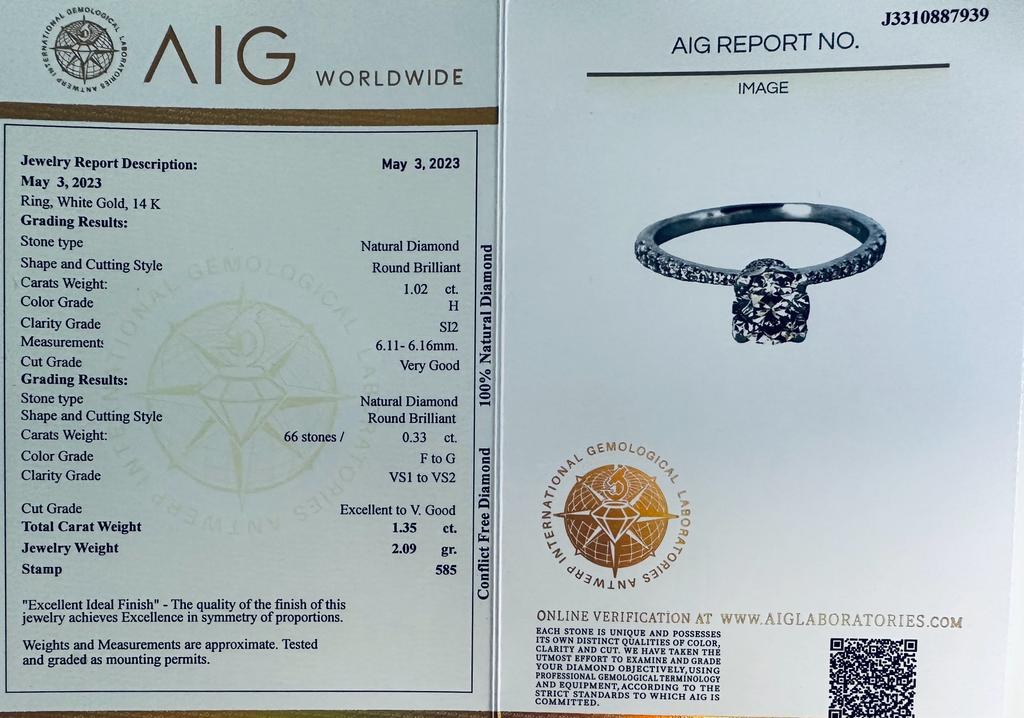 WHITE GOLD RING 14K 2.09 GR WITH 1.02 CARATS DIAMONDS COLOR H CLARITY SI2 + 0.33 CARATS BRILLIANTS COLOR F-G CLARITY VS1-2 SIZE 7 CERTIFICATE AIG-RNG30408