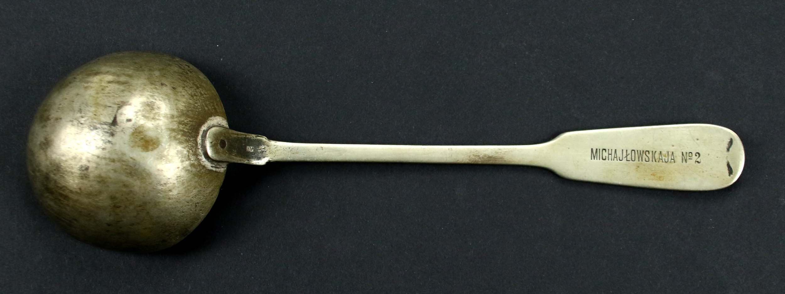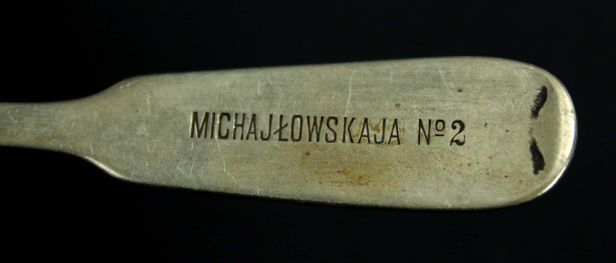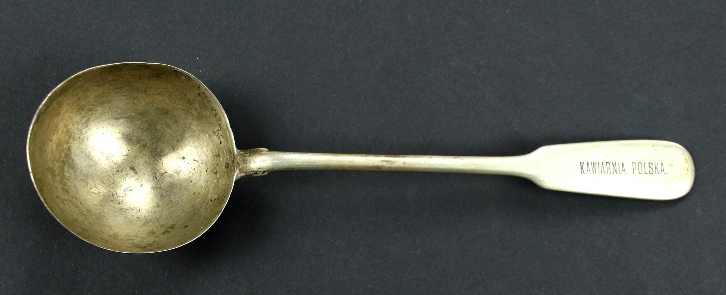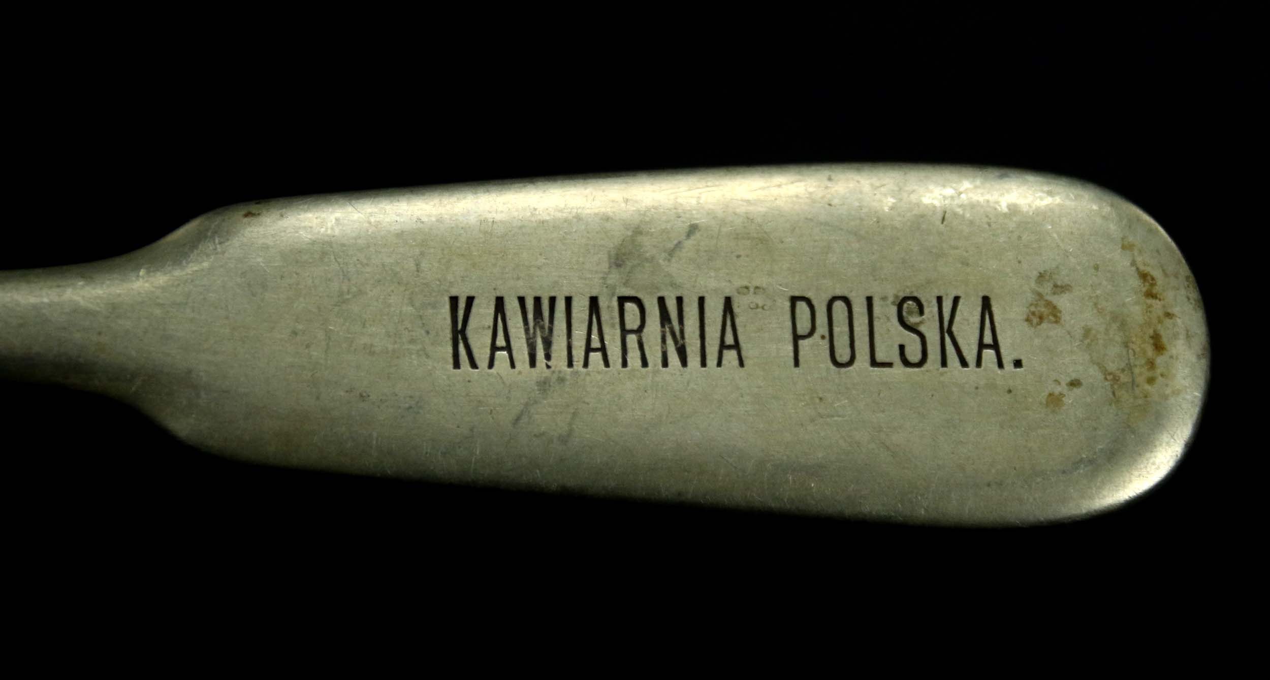 Chochelka syg. "Kawiarnia Polska" na odwrocie 'Michajłowskaja No 2". Alpaka, długość 24 cm.