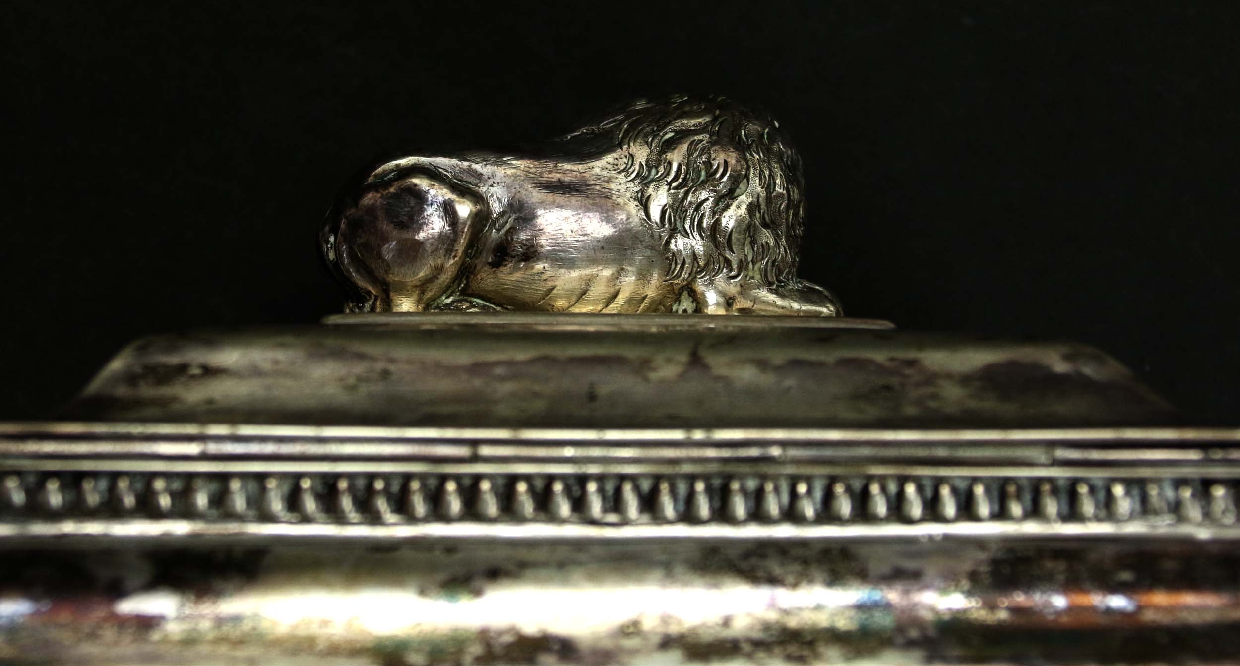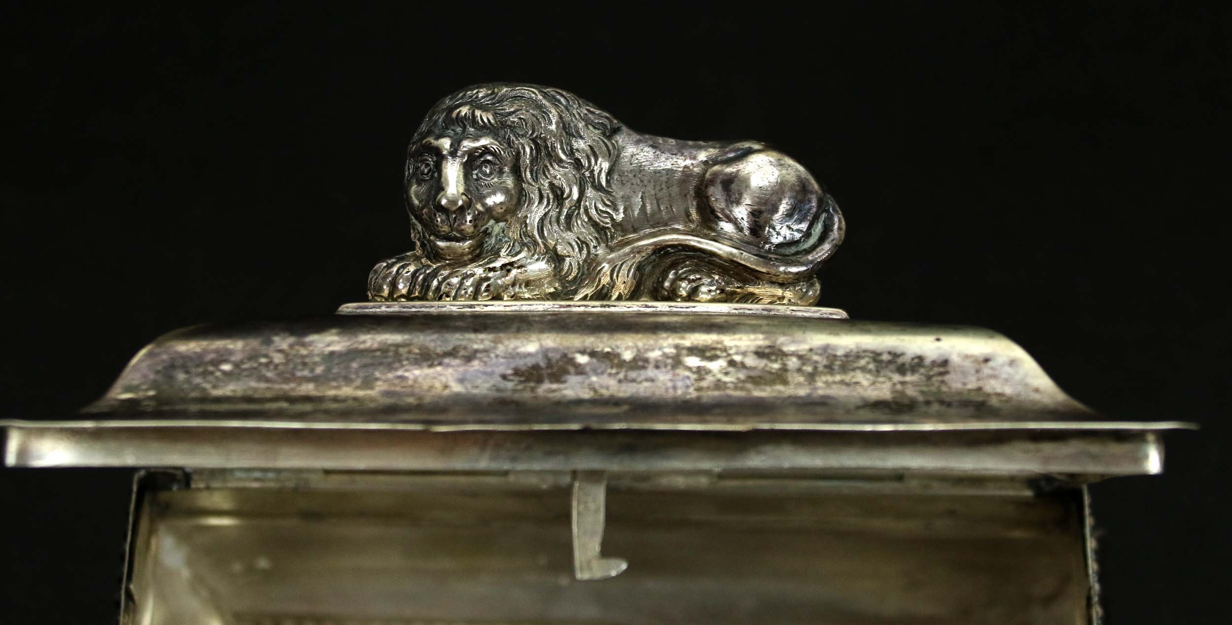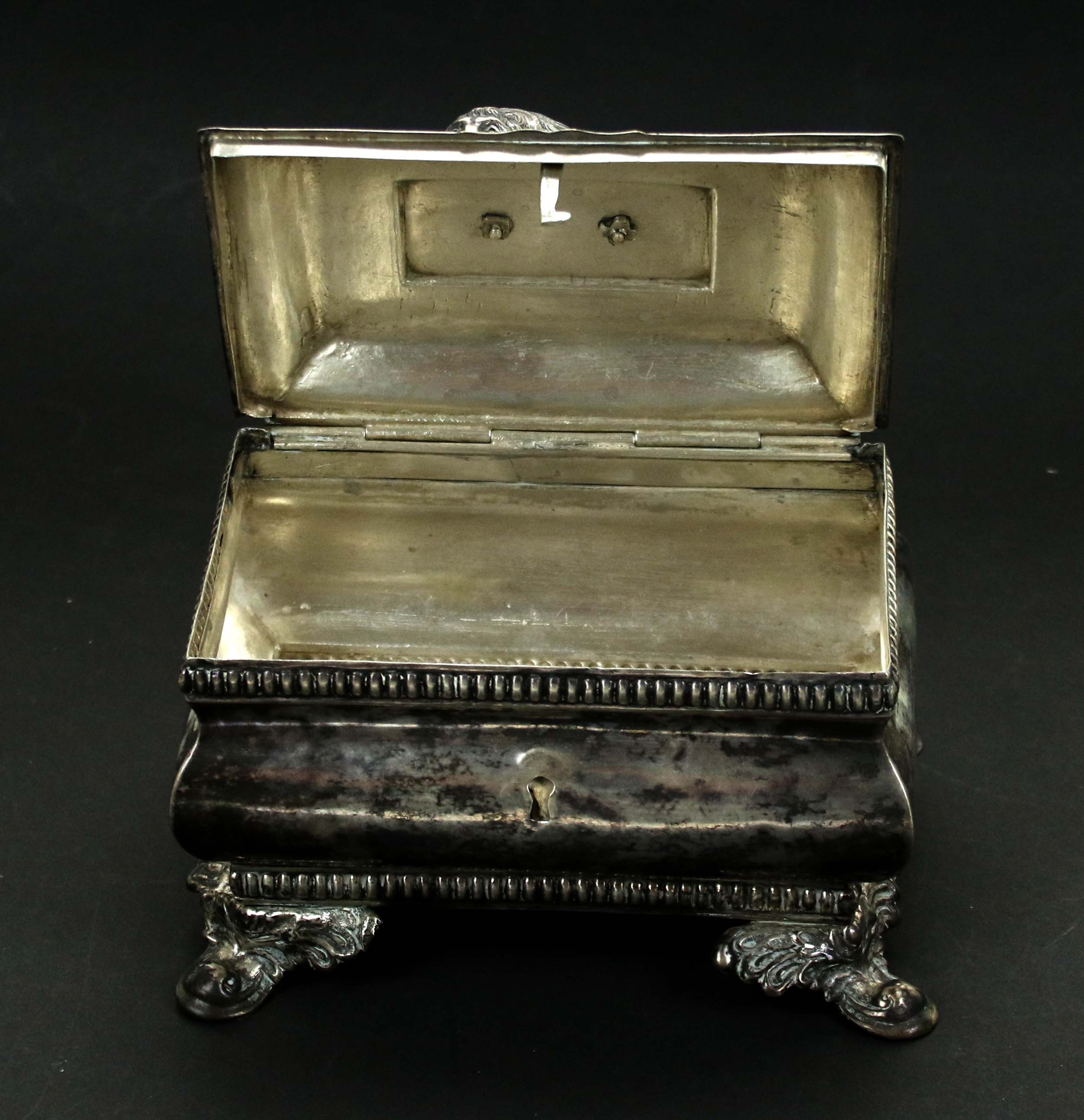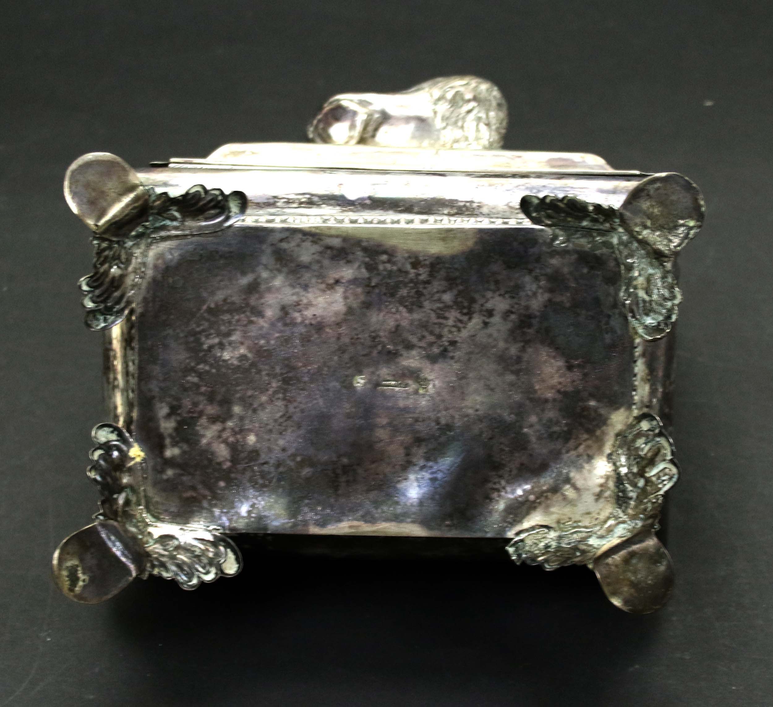 Cukiernica skrzynkowa, Carl Friedrich Korok, Wrocław 1848 r..Sygnowane cechą mistrza, a także cechą miejską Wrocławia - głową Św. Jana Chrzciciela na misie wraz ze skróconą datą roczna 48 (1848) oraz literą S - znakiem probierza aktywnego w latach 1839-1849. Srebro waga 414 g. Wym. 14 x 15,5 x 11,8 cm.