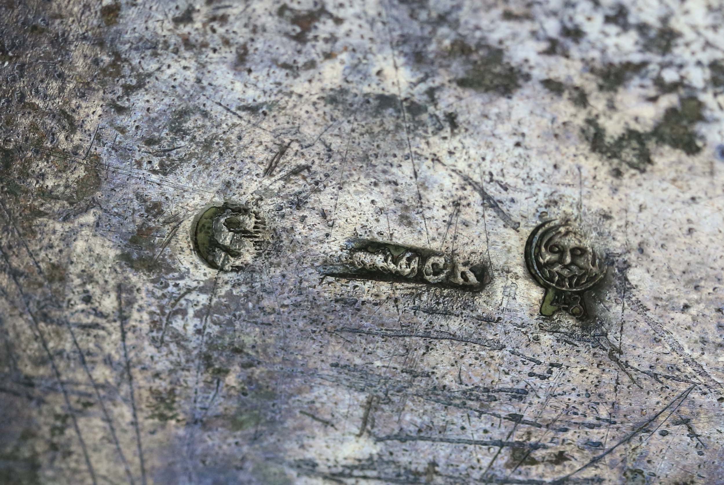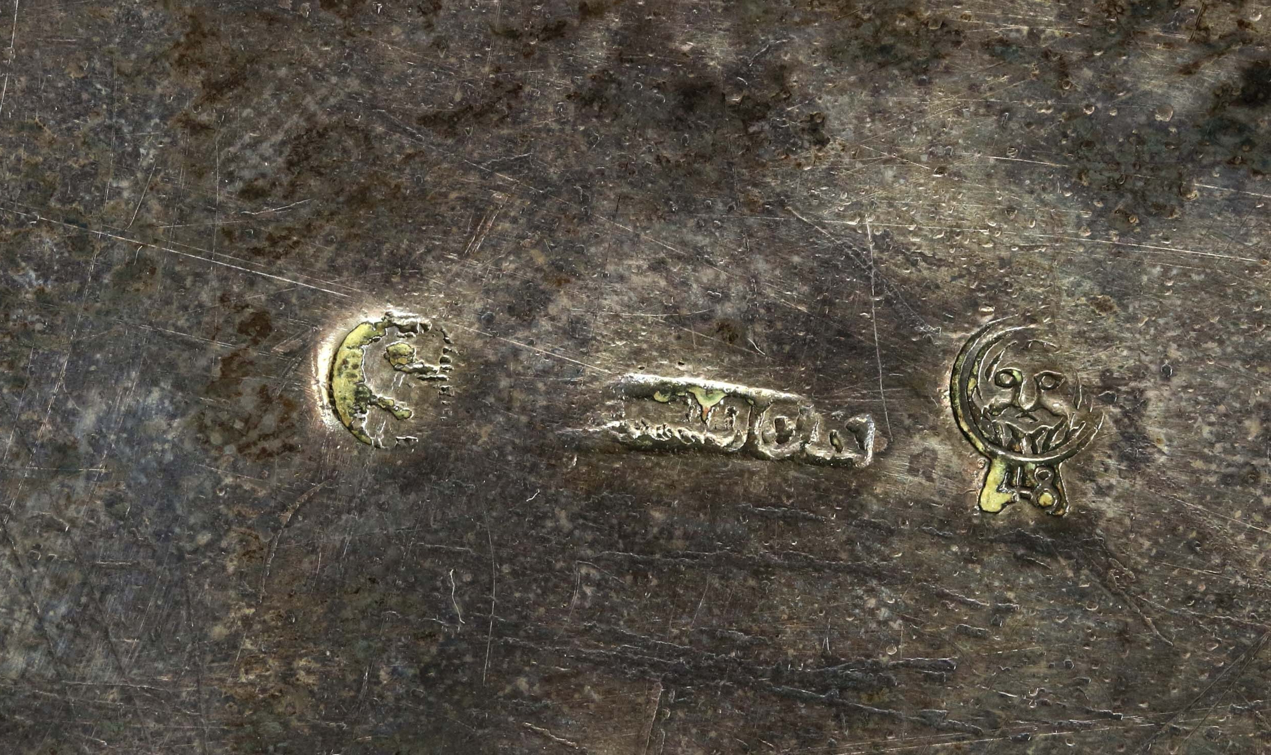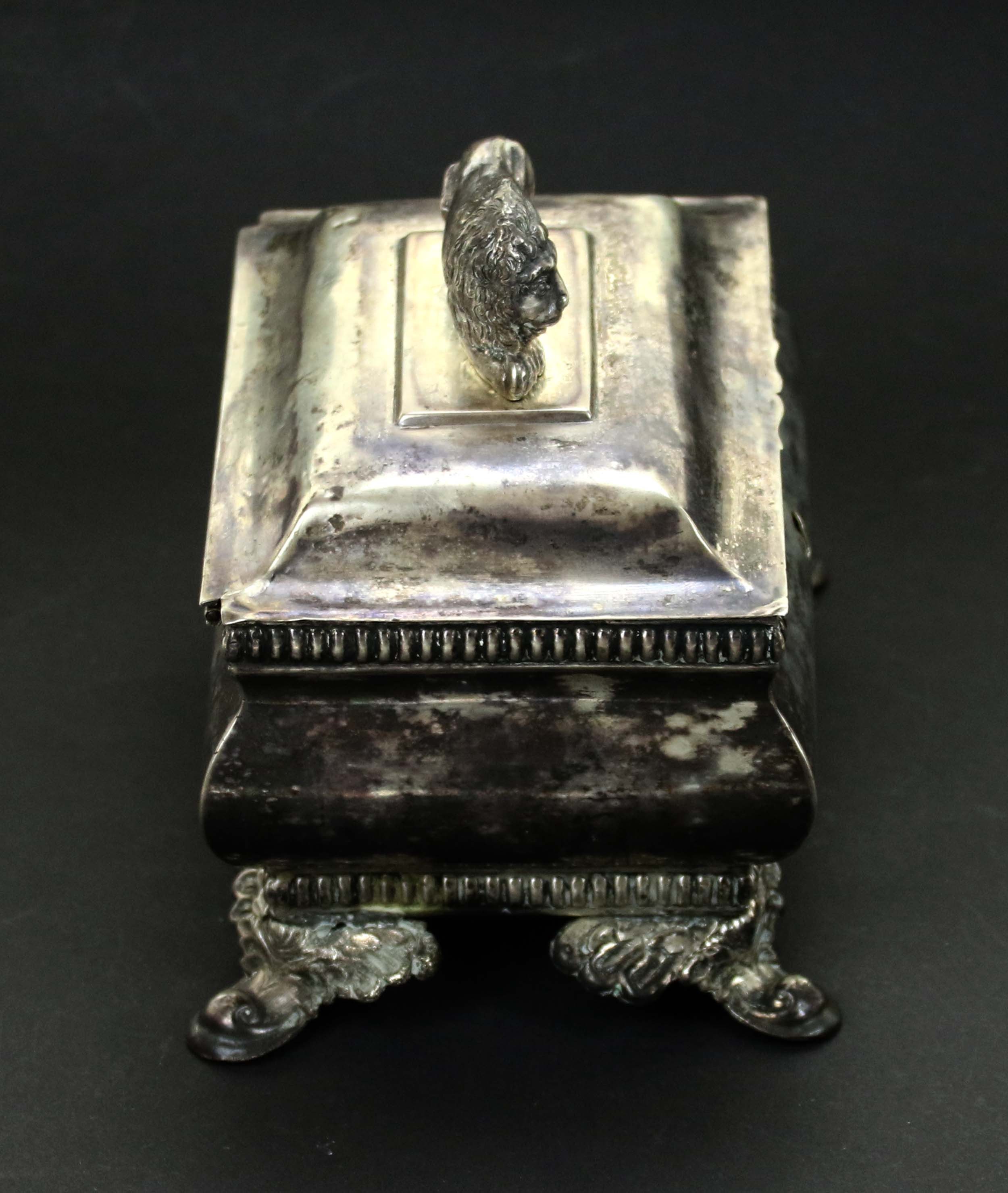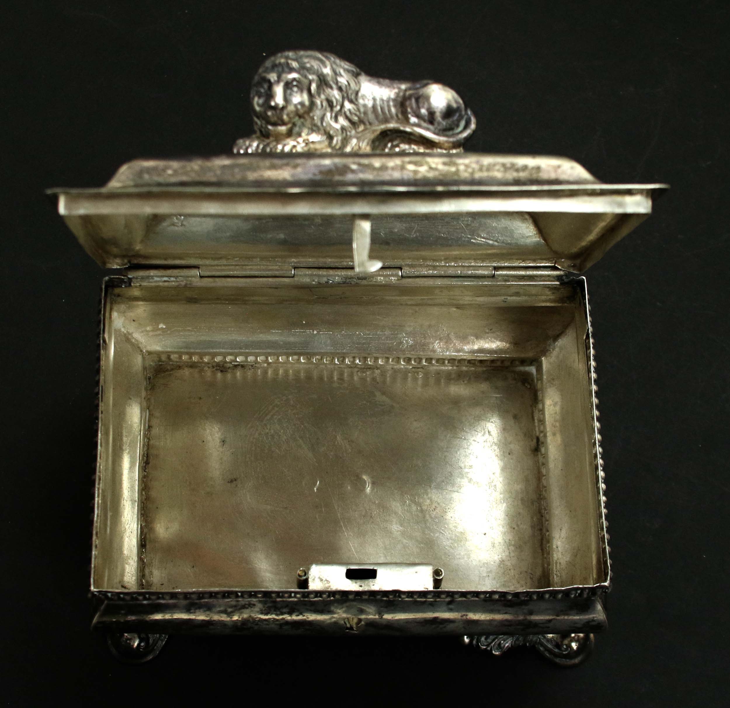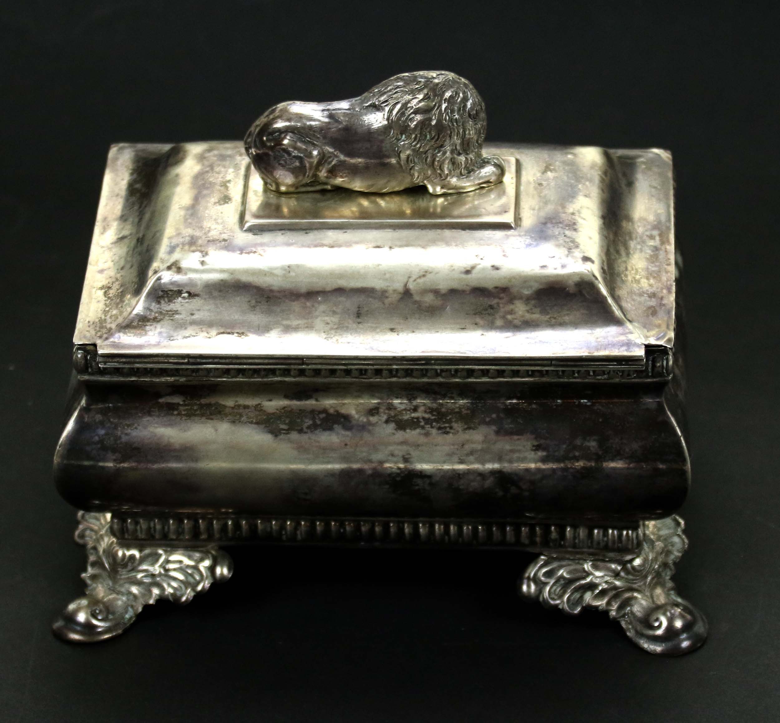 Cukiernica skrzynkowa, Carl Friedrich Korok, Wrocław 1848 r..Sygnowane cechą mistrza, a także cechą miejską Wrocławia - głową Św. Jana Chrzciciela na misie wraz ze skróconą datą roczna 48 (1848) oraz literą S - znakiem probierza aktywnego w latach 1839-1849. Srebro waga 414 g. Wym. 14 x 15,5 x 11,8 cm.