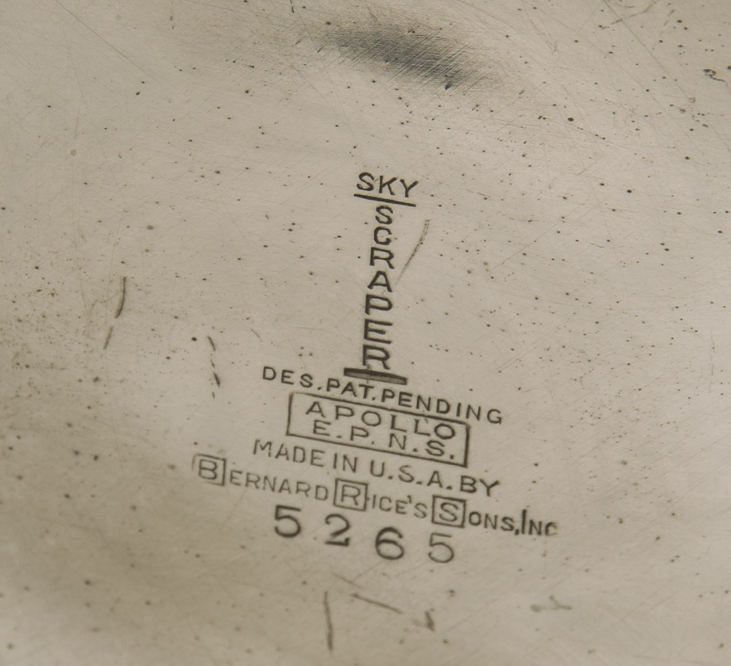 na spodzie oznaczenie wytwórni: 'SKYSCAPER | DES. PAT. PENDING APOLLO E. P. N. | MADE IN U.S.A. BY | BERNARD RICE’S SONS. INC | '5265', (cukiernica), '5267' (Shaker)'