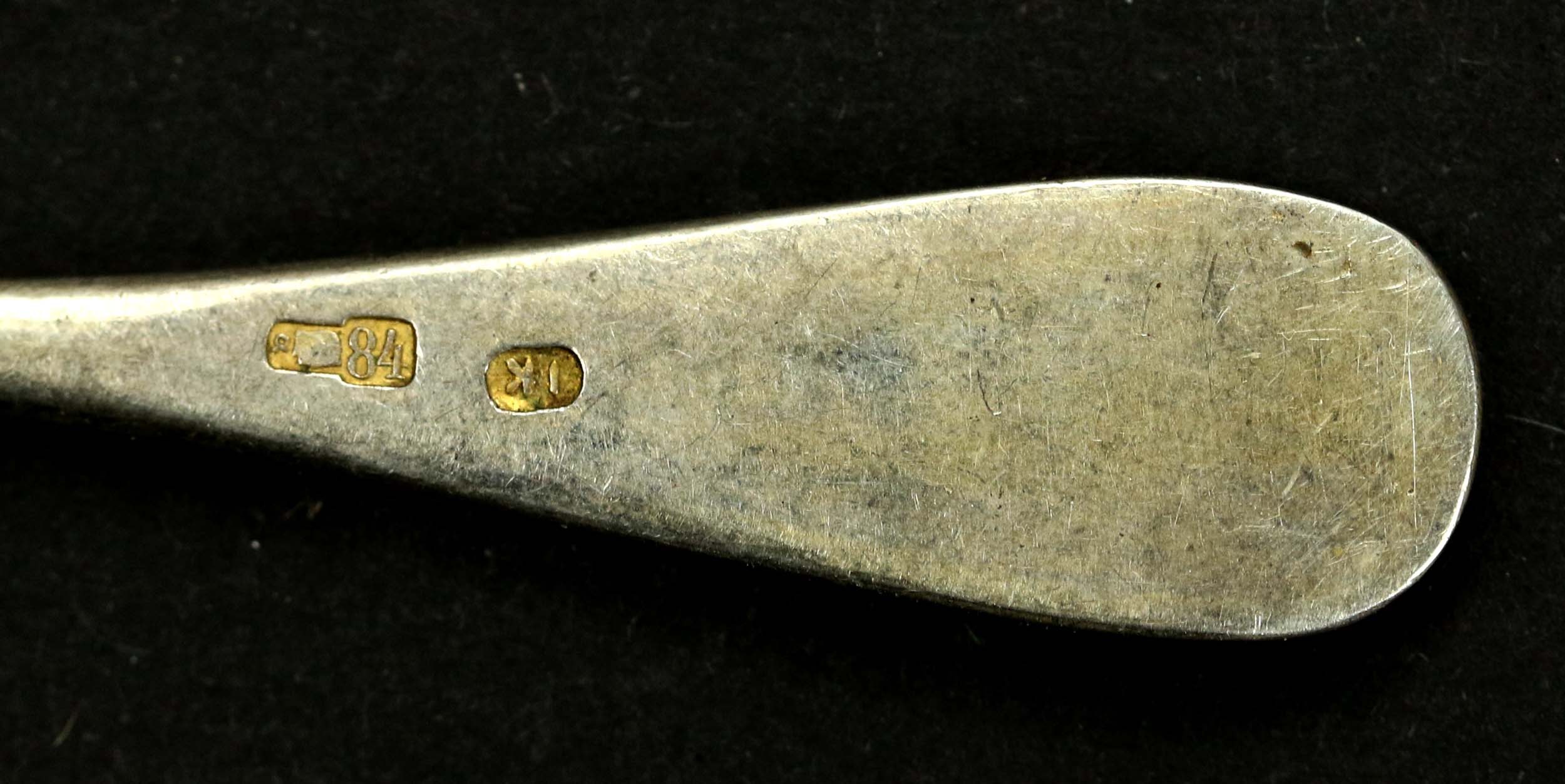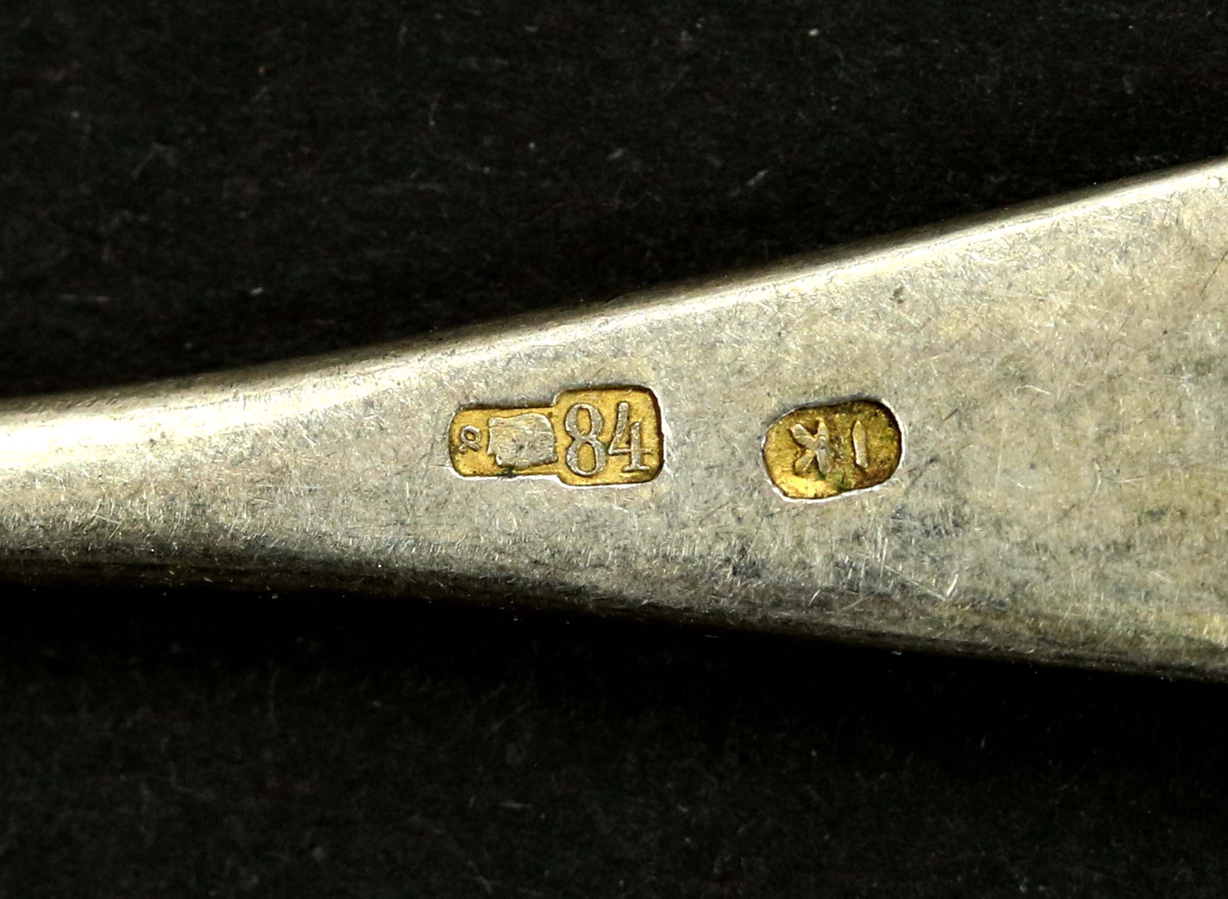 Łyżeczka do soli, Rosja, Moskwa pocz. XX w. Moskiewska cecha srebra oraz sygnatura IK. Srebro złocone, długość 7 cm waga 7,49 g.