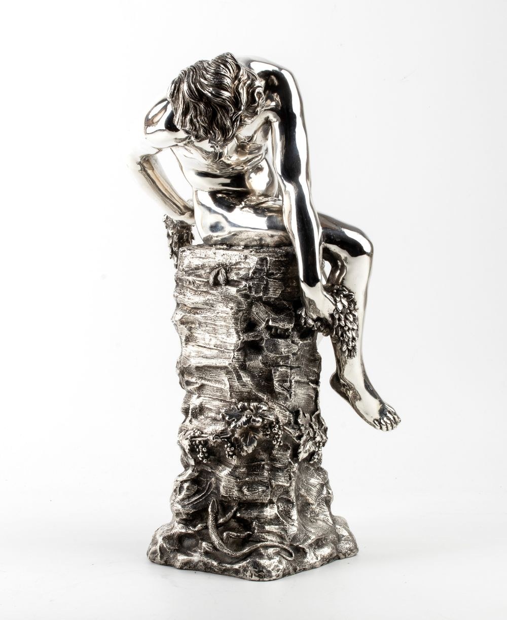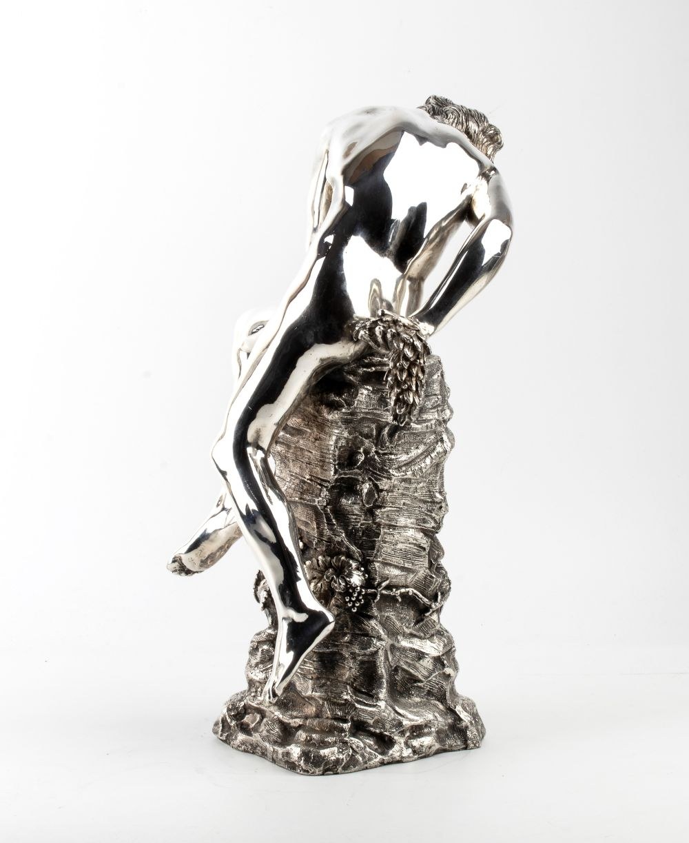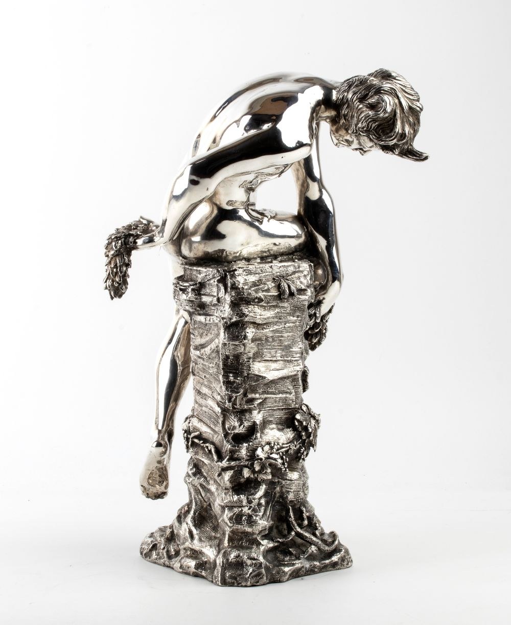 The base is decorated with natural elements, such as leaves and clusters of grapes, evoking a natural setting and classical symbolism. The polished, lustrous surface, resembling a silver effect, enhances the piece's elegance and refinement, emphasizing the contrast between Narcissus’s smooth body and the rough texture of the rock.