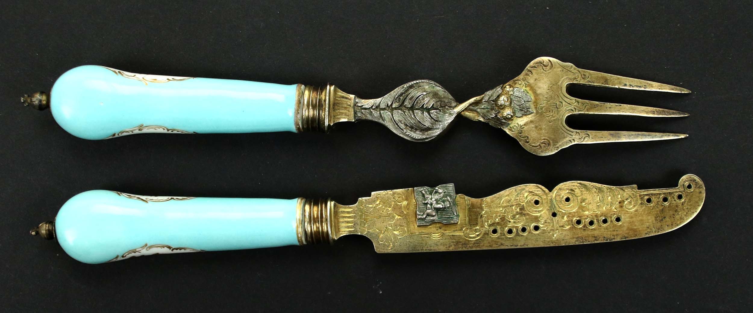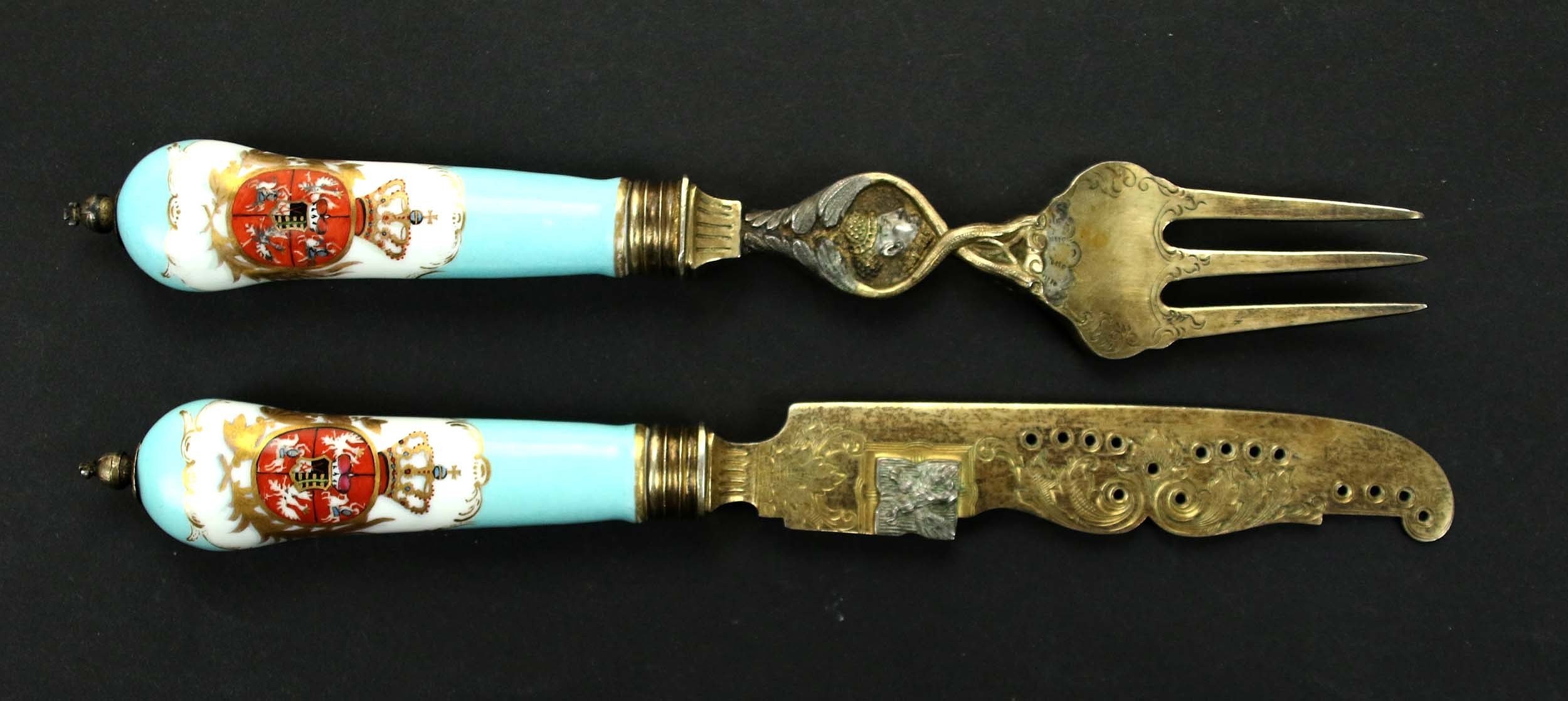 Sztućce z herbem Sasów, XIX w. Nóż i widelec. Metal złocony, porcelana, waga 227 g.