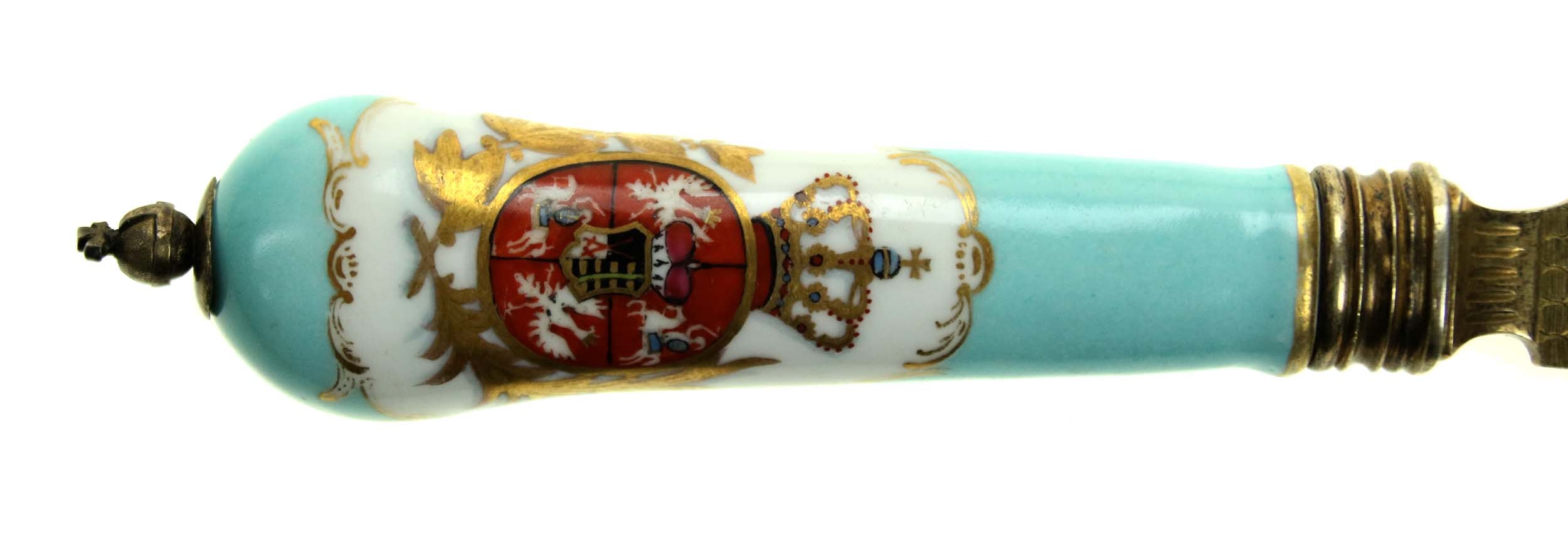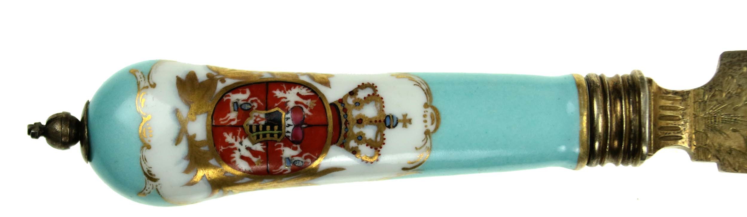 Nóż ozdobny, ostrze grawerowane, ażurowe z plakietka z orłem i pogonią, trzon porcelanowy z herbem Sasów. Długość noża 22,5 cm.