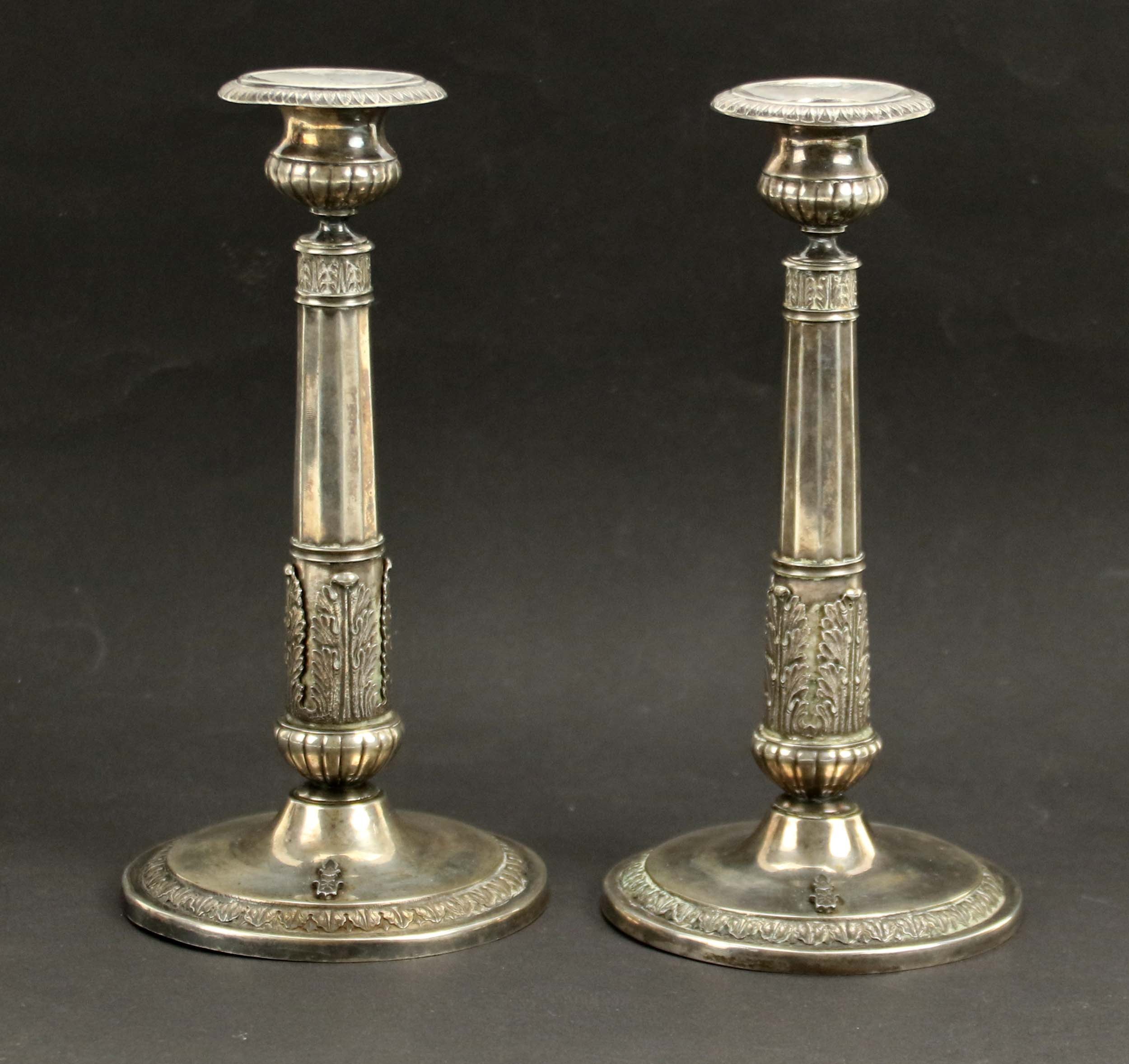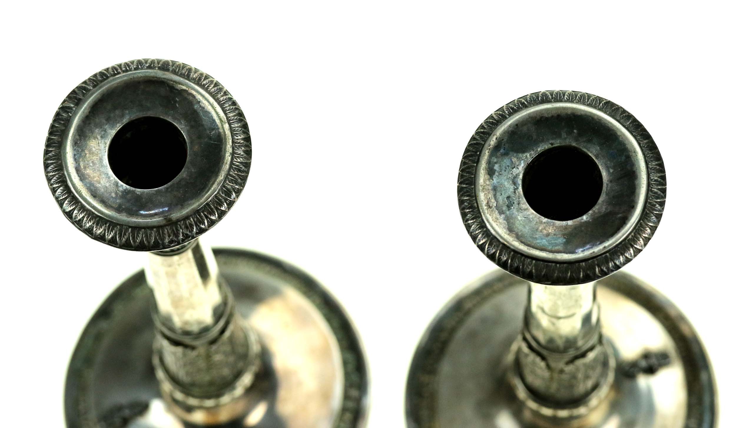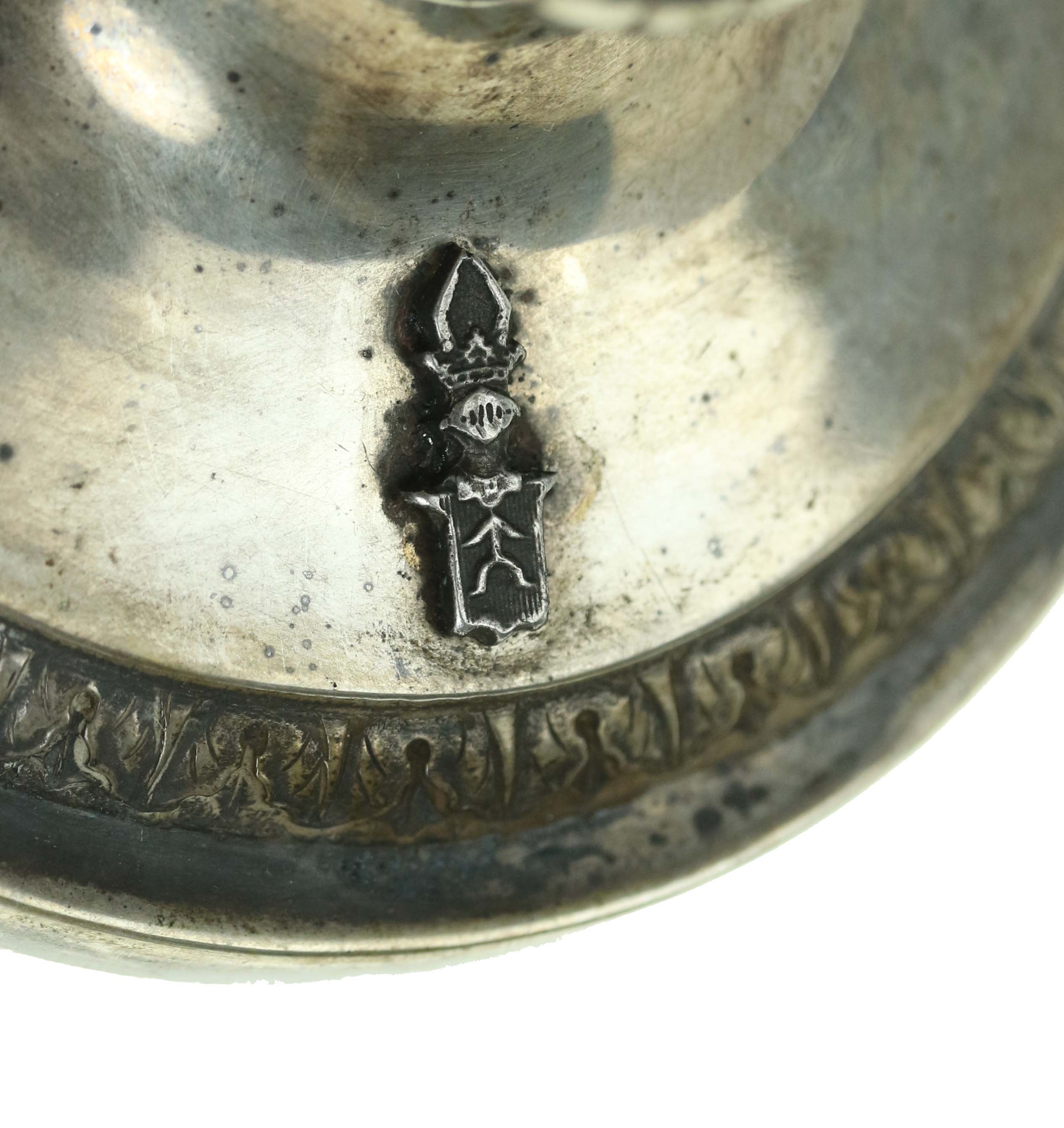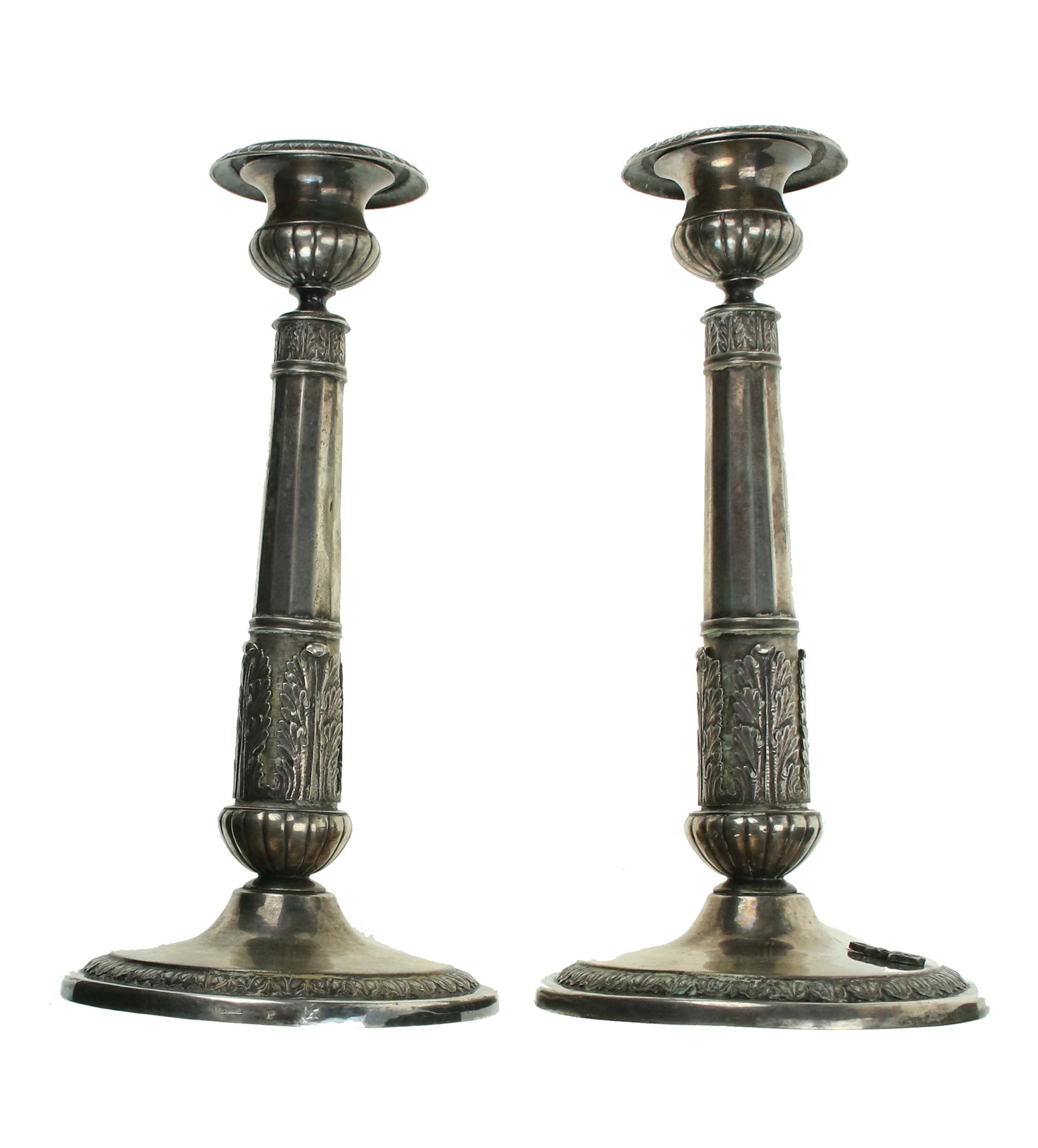Para lichtarzy z nakładanym herbem Ogończyk. Srebro kute, waga całkowita 434 g, wys. 19 cm, początek XIX w. Sygn. punca złotnika, punca ze skrzyżowanych mieczy lub kluczy oraz punca z literą ,,P".