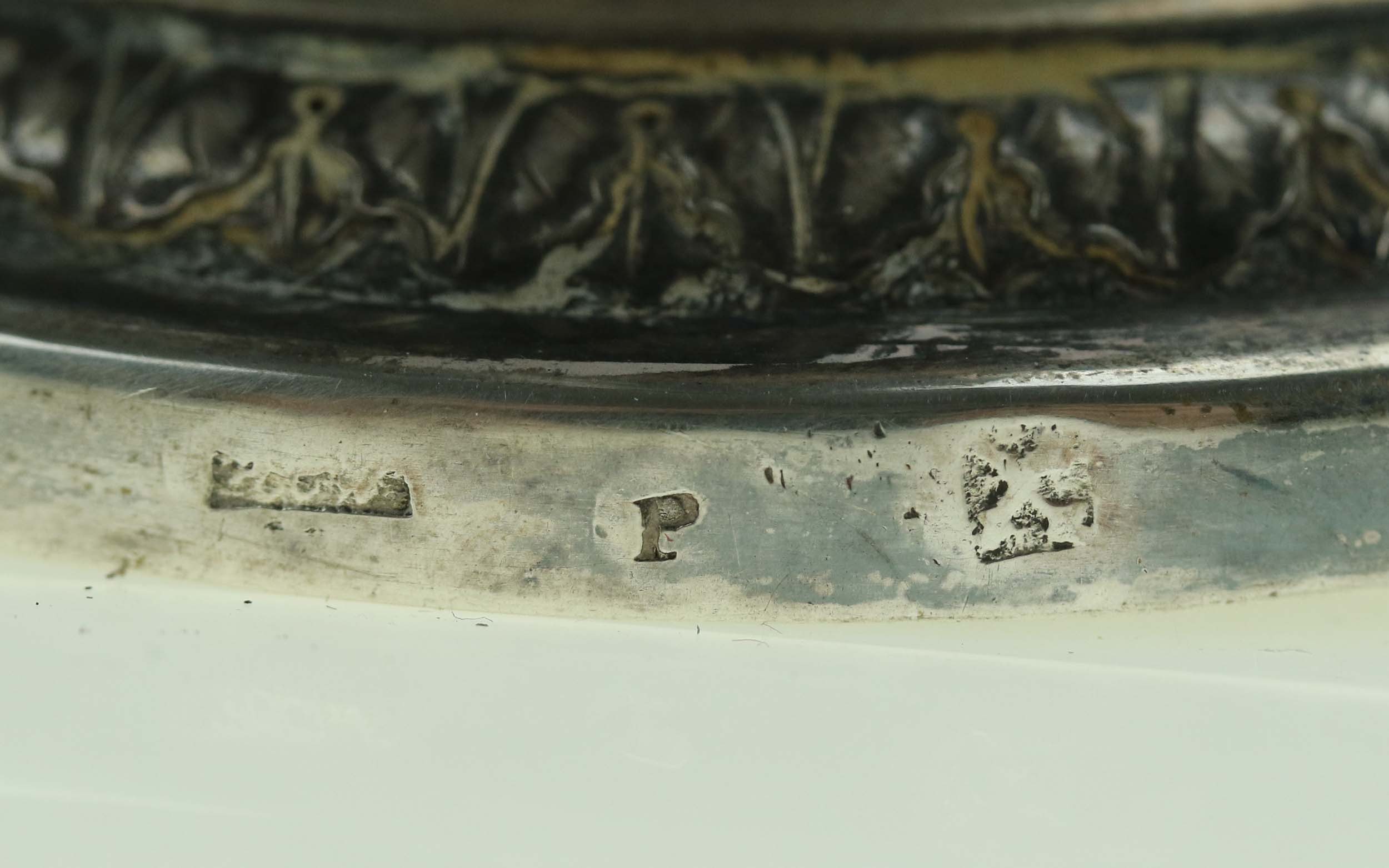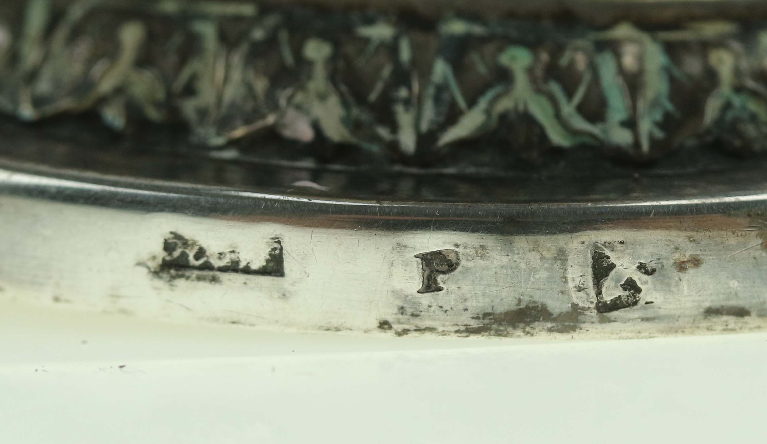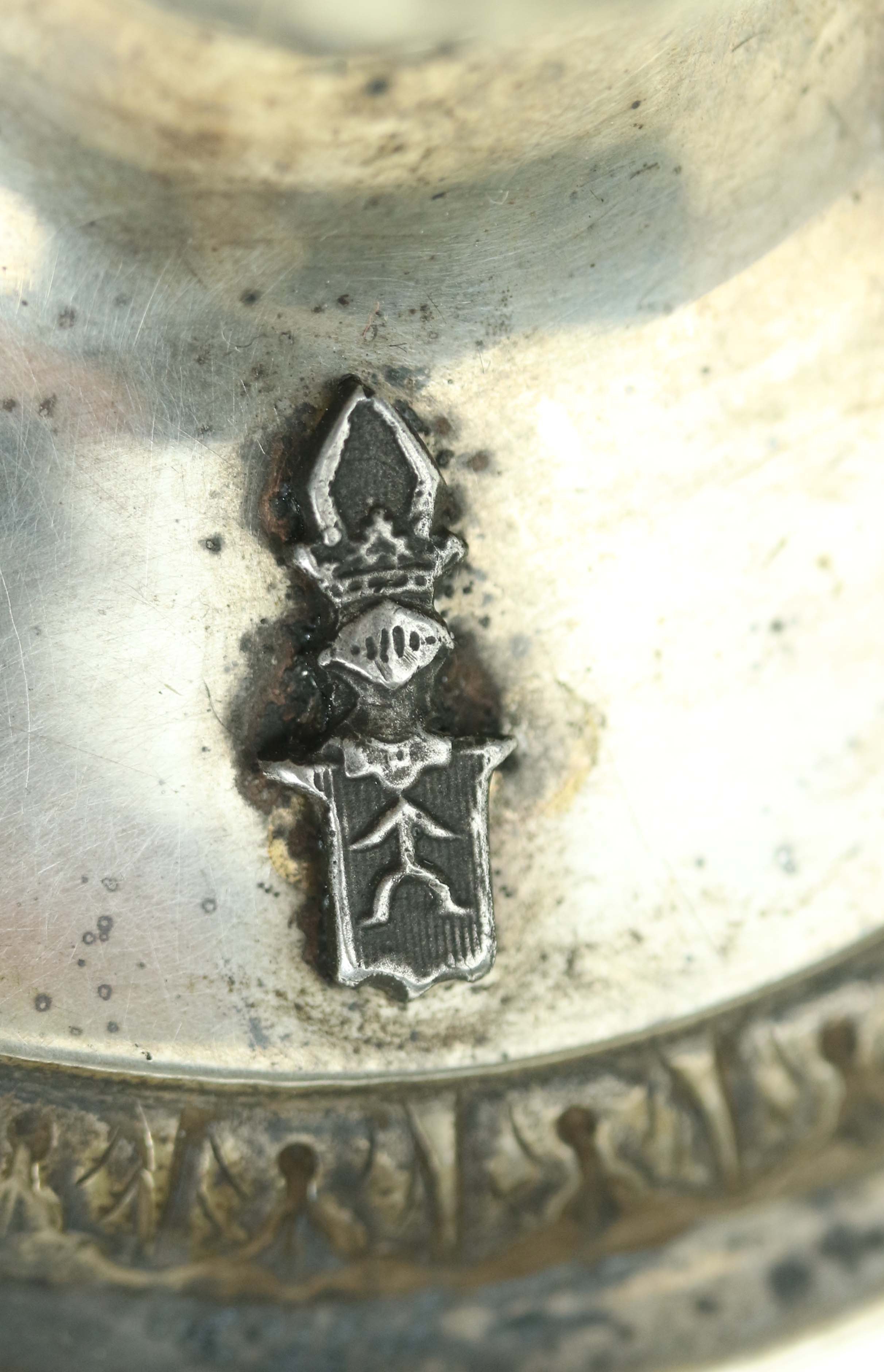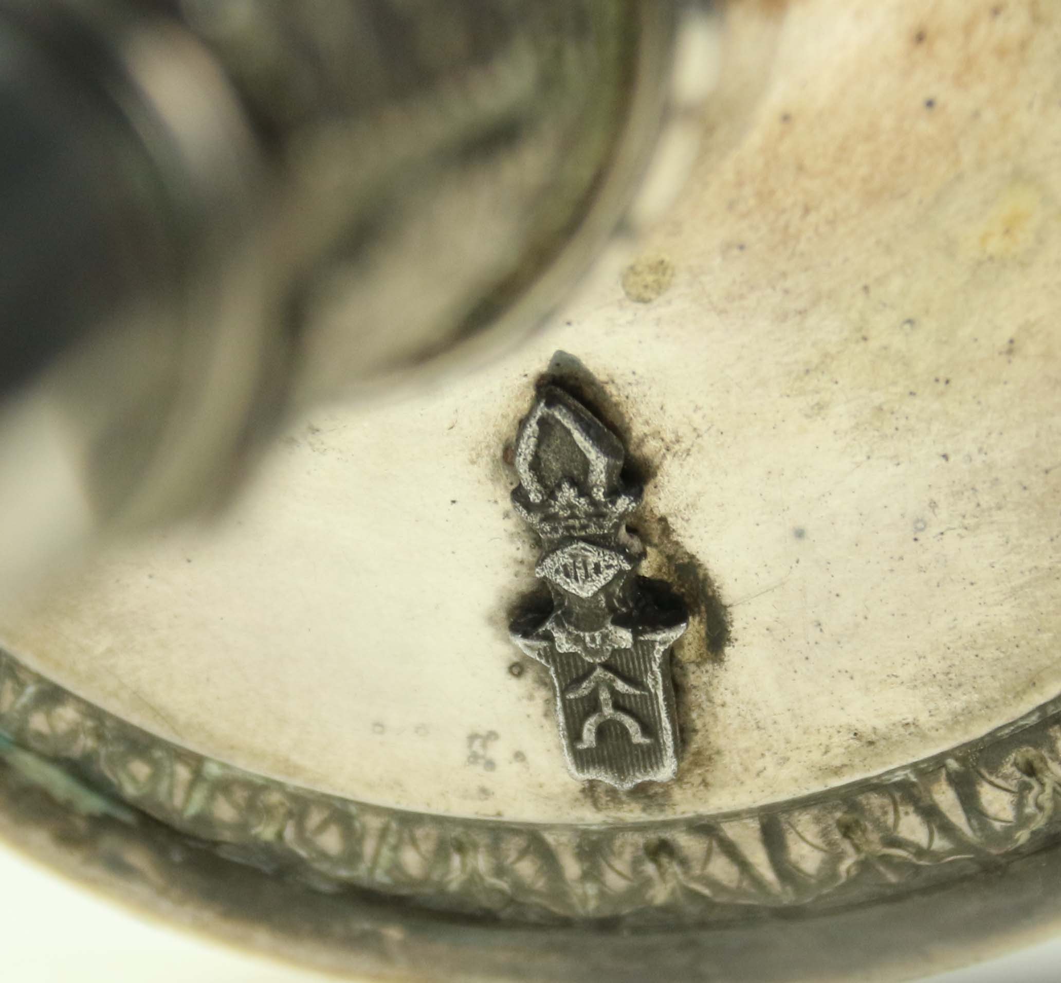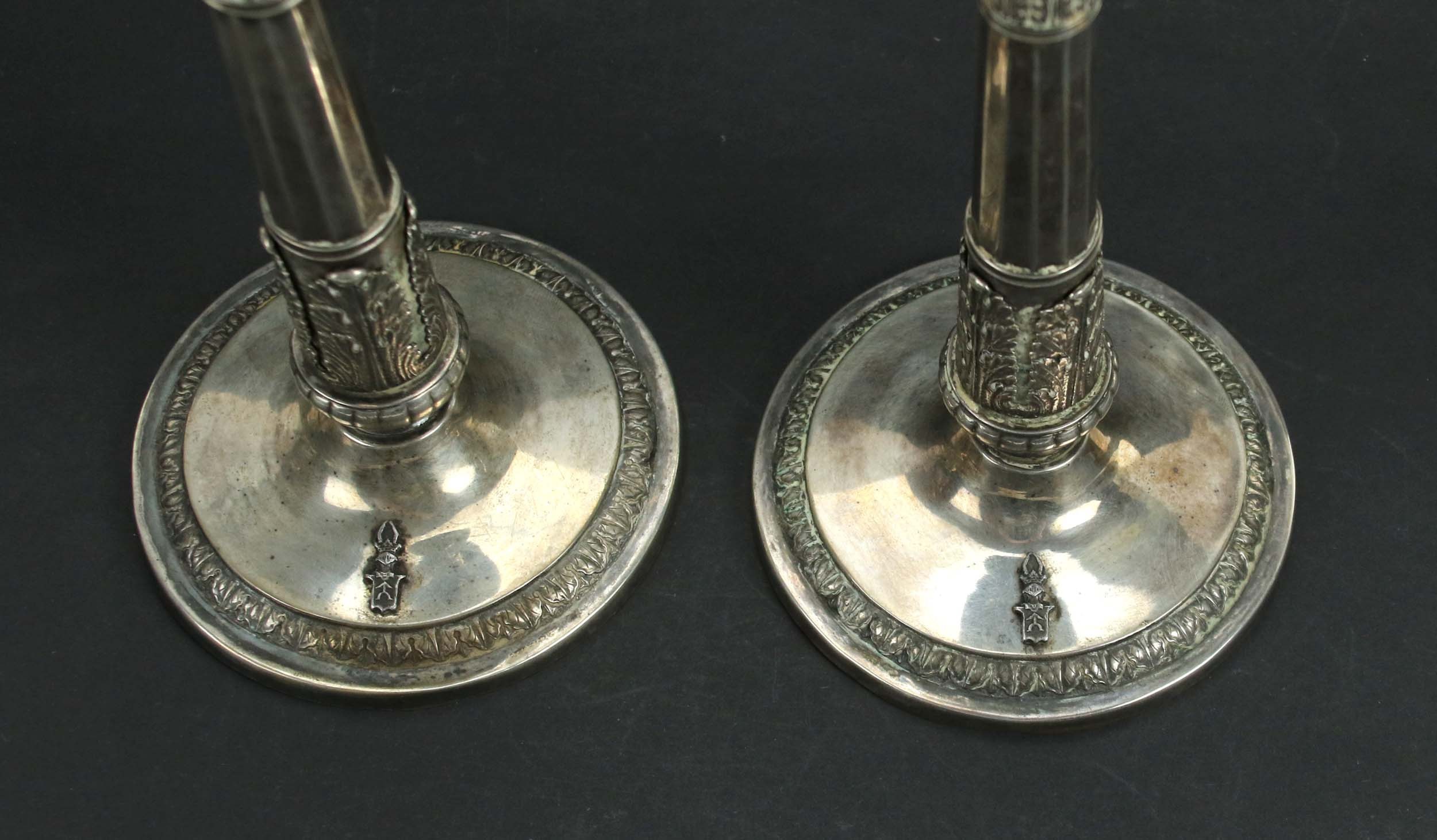Para lichtarzy z nakładanym herbem Ogończyk. Srebro kute, waga całkowita 434 g, wys. 19 cm, początek XIX w. Sygn. punca złotnika, punca ze skrzyżowanych mieczy lub kluczy oraz punca z literą ,,P".