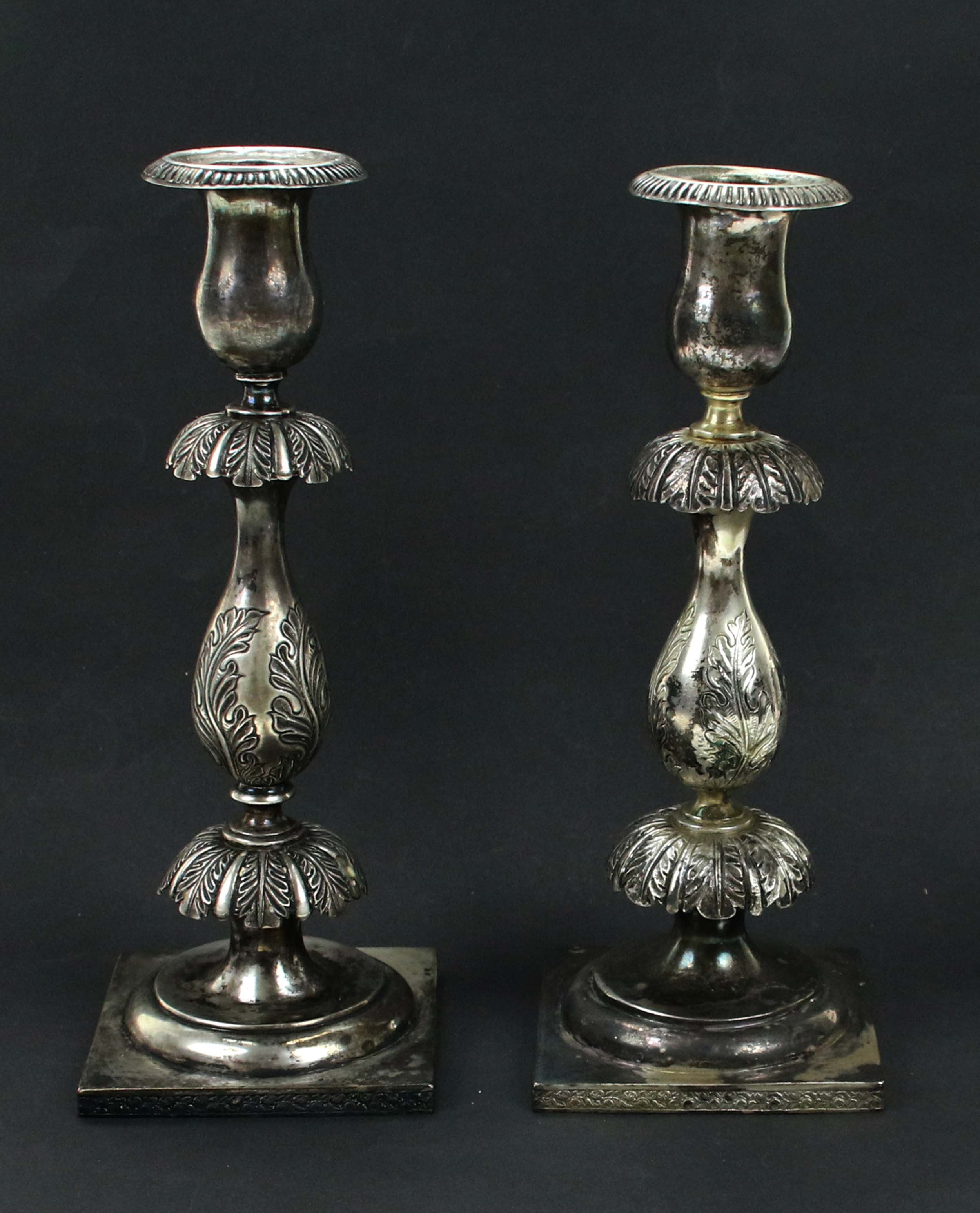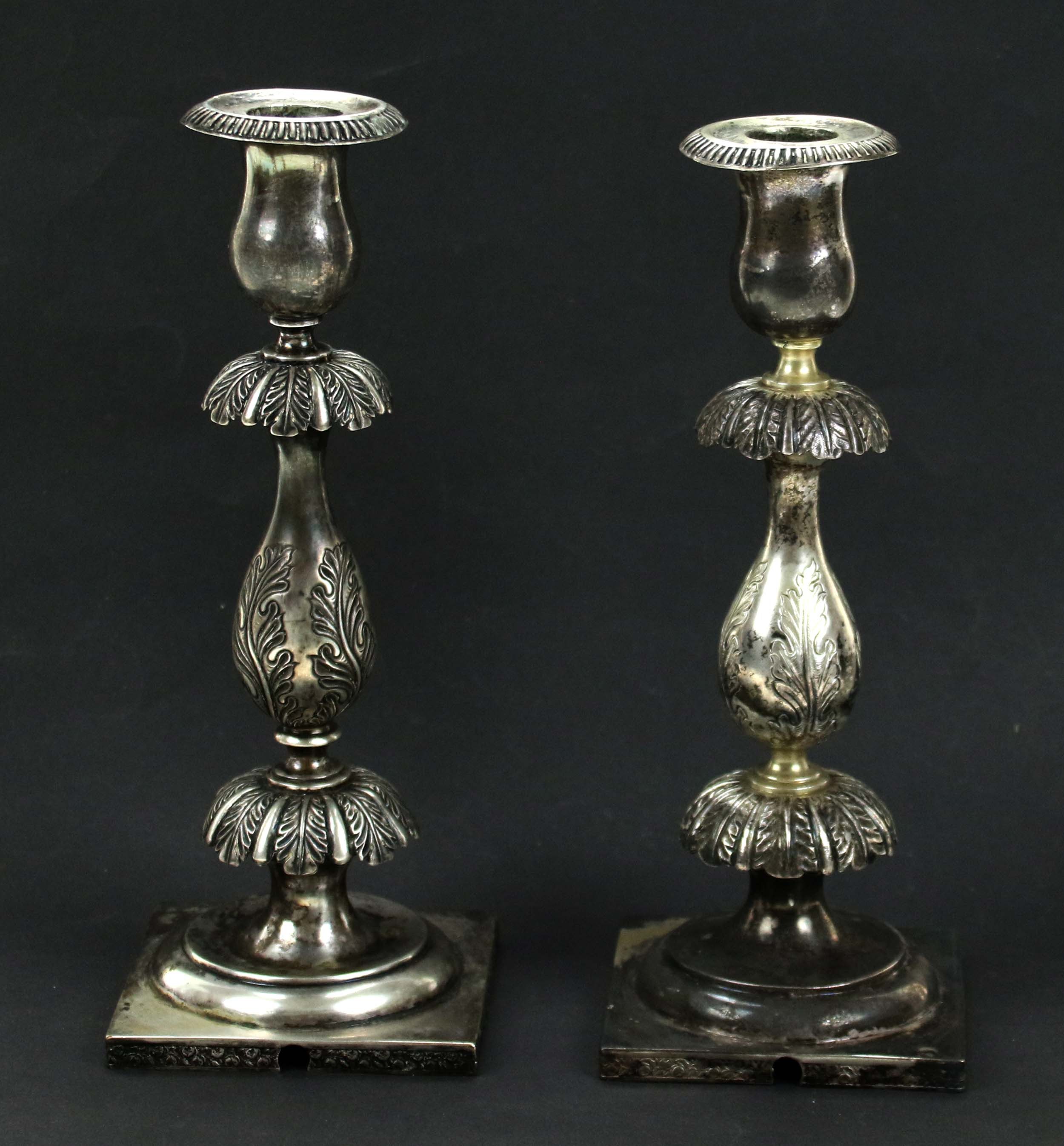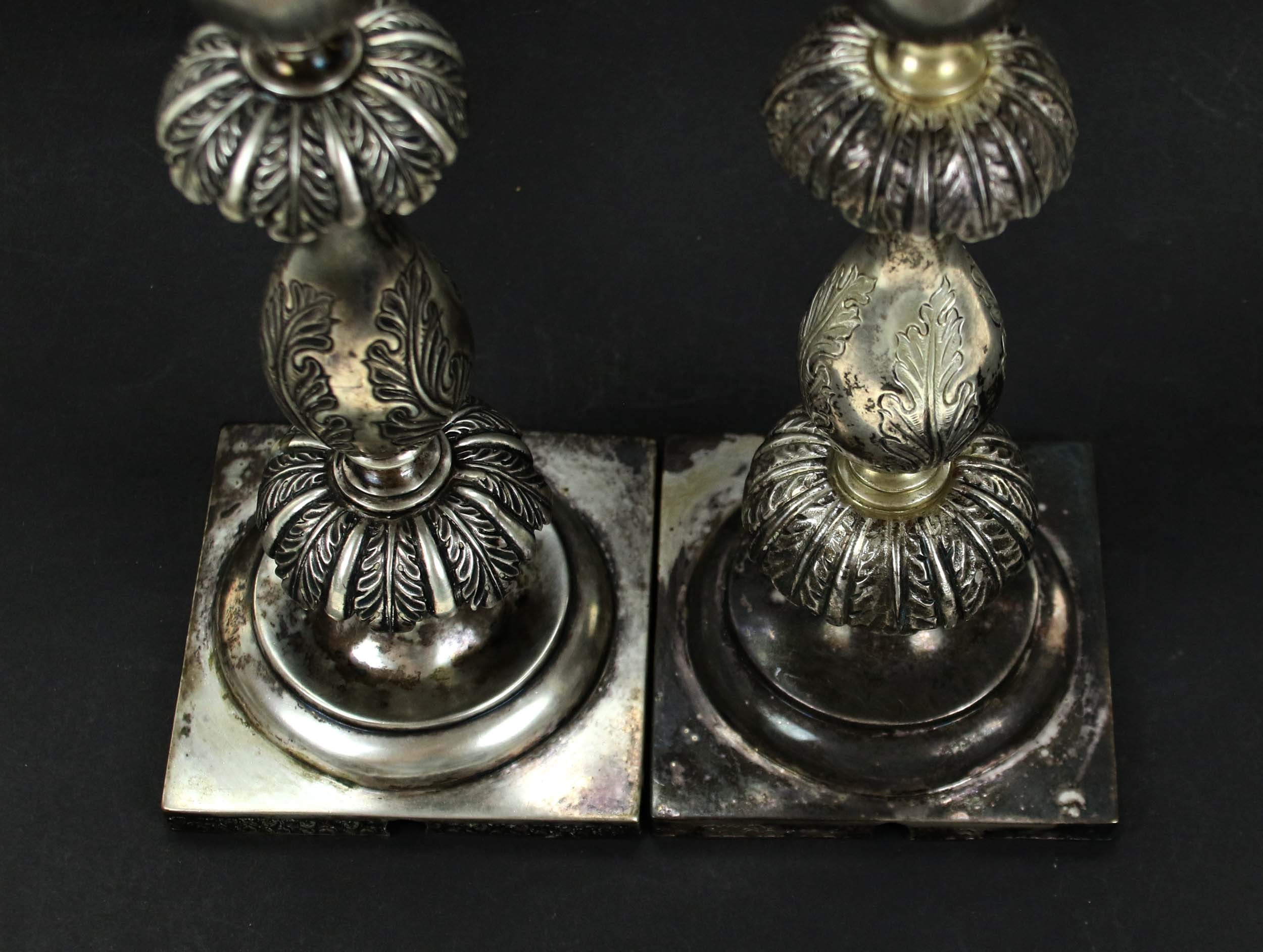 Para świeczników, Nast, Warszawa XIX w. Na spodzie sygnatura złotnika oraz cecha srebra 12. Srebro waga łączna 588 g. Ślad po próbie przeróbki na lampki elektryczne - niewielkie otwory w boku podstawy widoczne na zdjęciach.